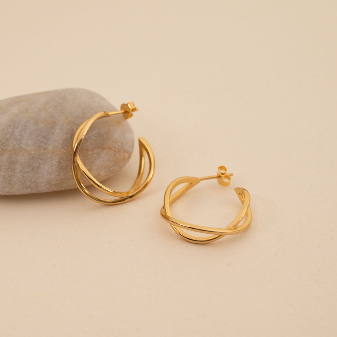 Our Mia Creoles is made of 100% recycled gold plated sterling silver. The design - which is inspired by two intertwined soft curves - brings a minimalistic, full and airy expression to the earring. The creoles are light and playfull for any occasion.
