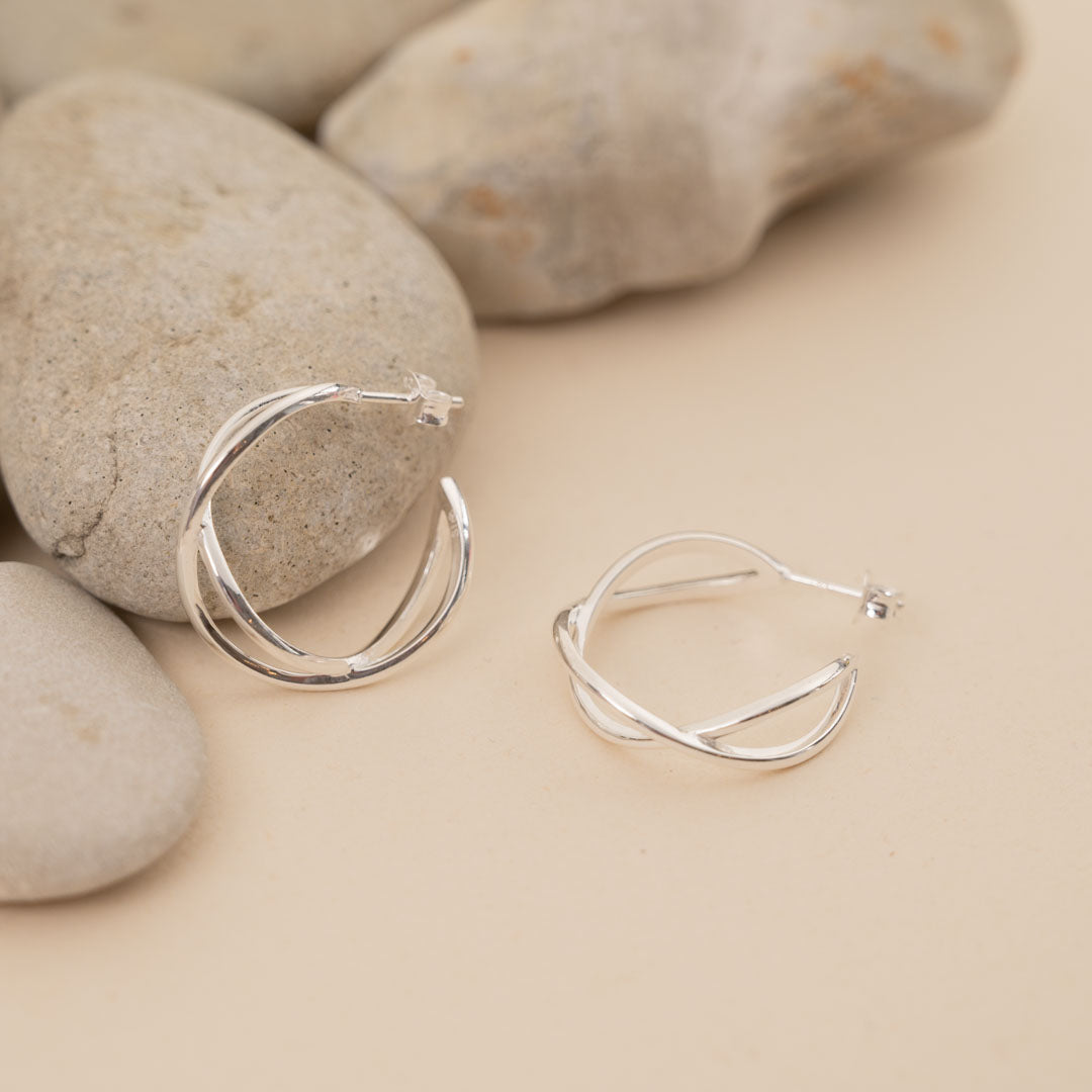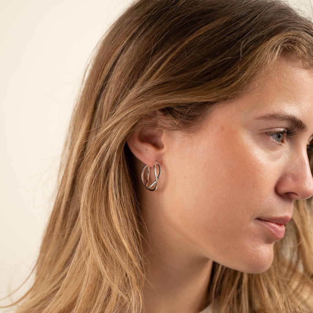 Our Mia Creoles is made of 100% recycled 925 sterling silver. The design - which is inspired by two intertwined soft curves - brings a minimalistic, full and airy expression to the earring. The creoles are light and playfull for any occasion.