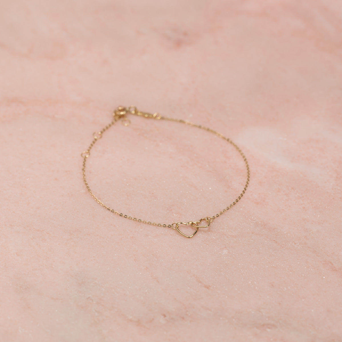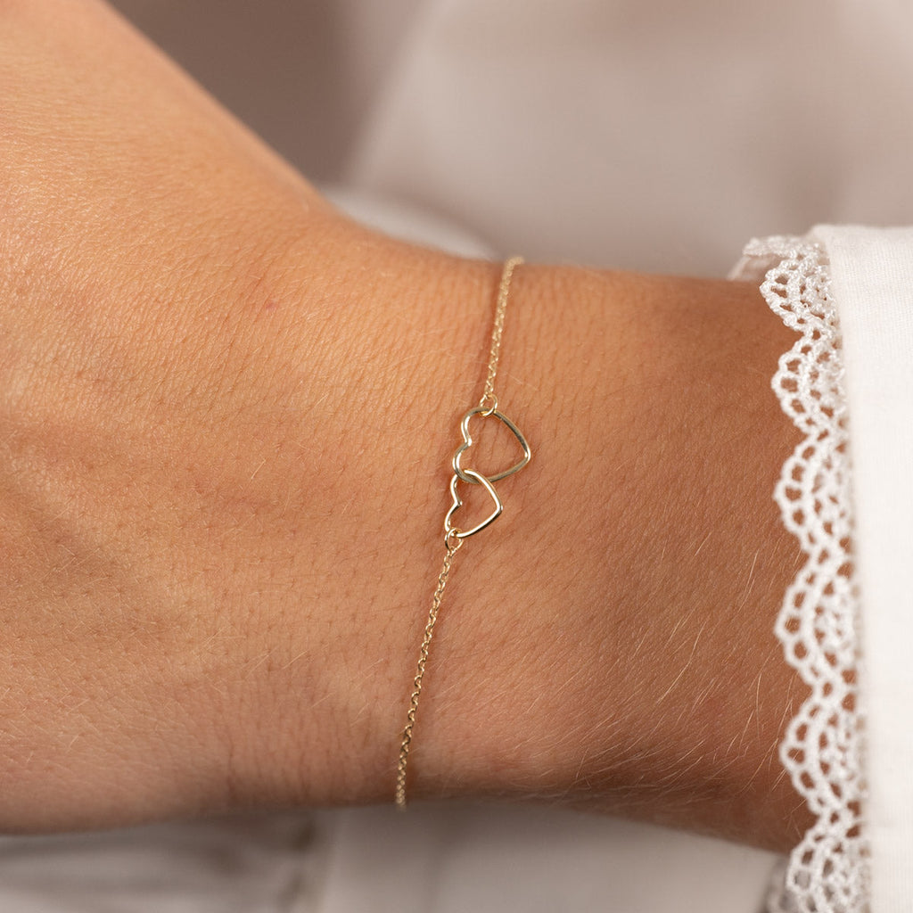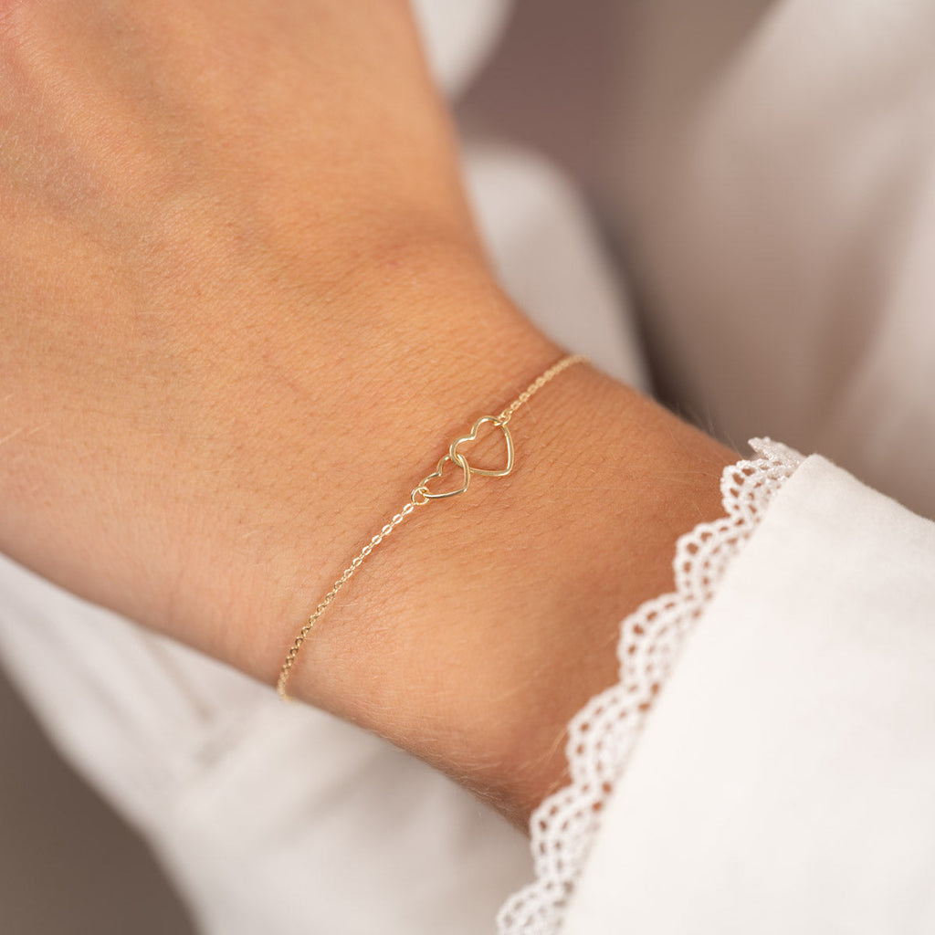 The Mila bracelet is made of 100% recycled solid 9 karat gold. The bracelet features a classic and timeless design with a small heart and a larger heart linked together in the delicate anchor chain.