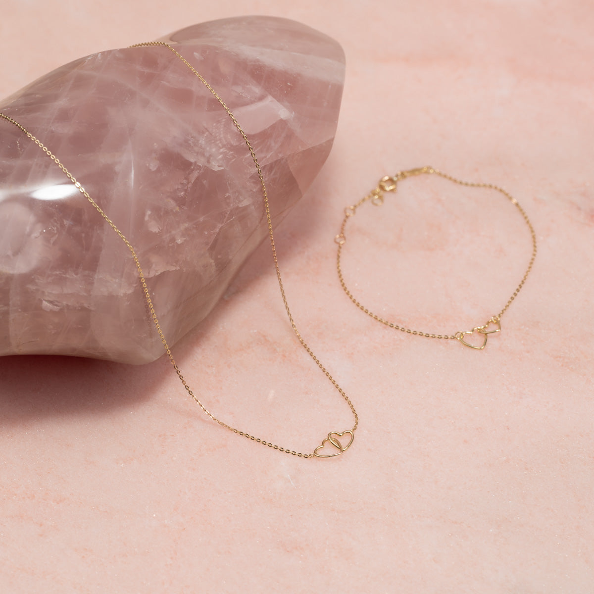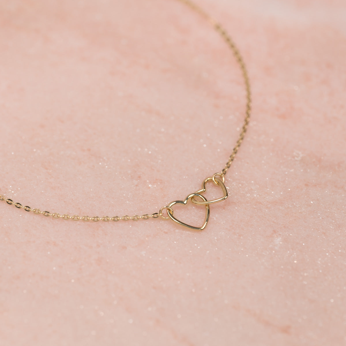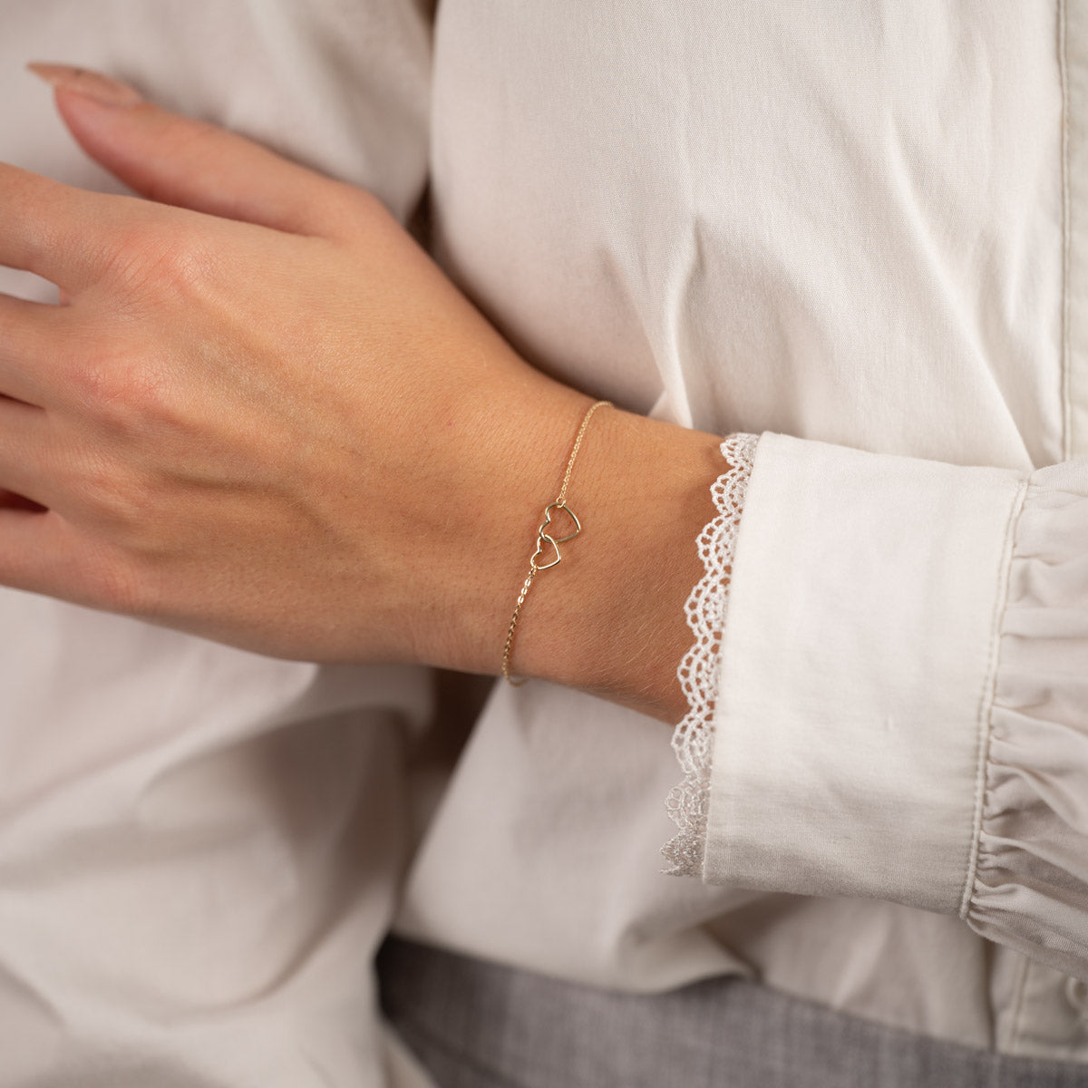 The Mila bracelet is made of 100% recycled solid 9 karat gold. The bracelet features a classic and timeless design with a small heart and a larger heart linked together in the delicate anchor chain.