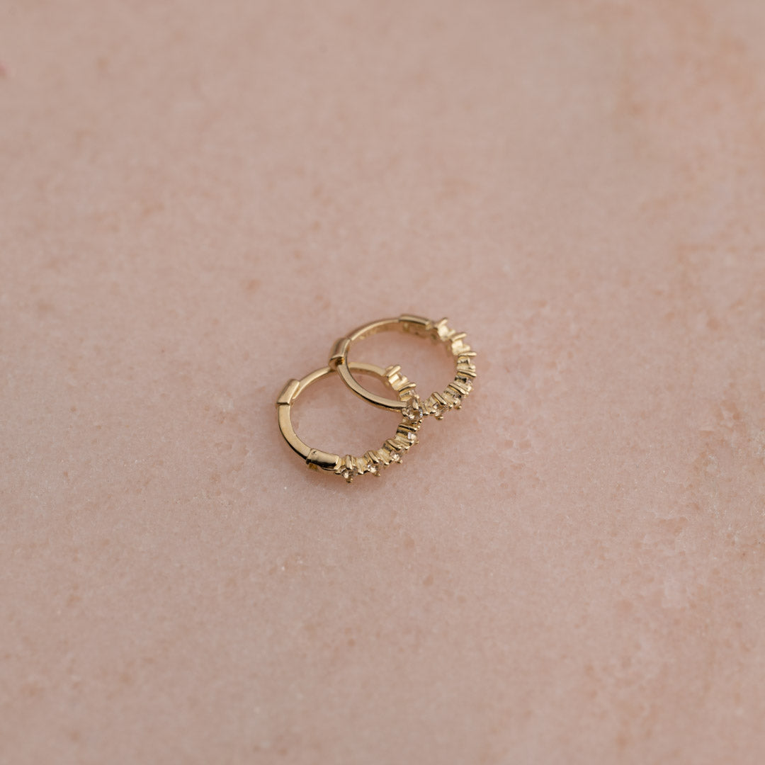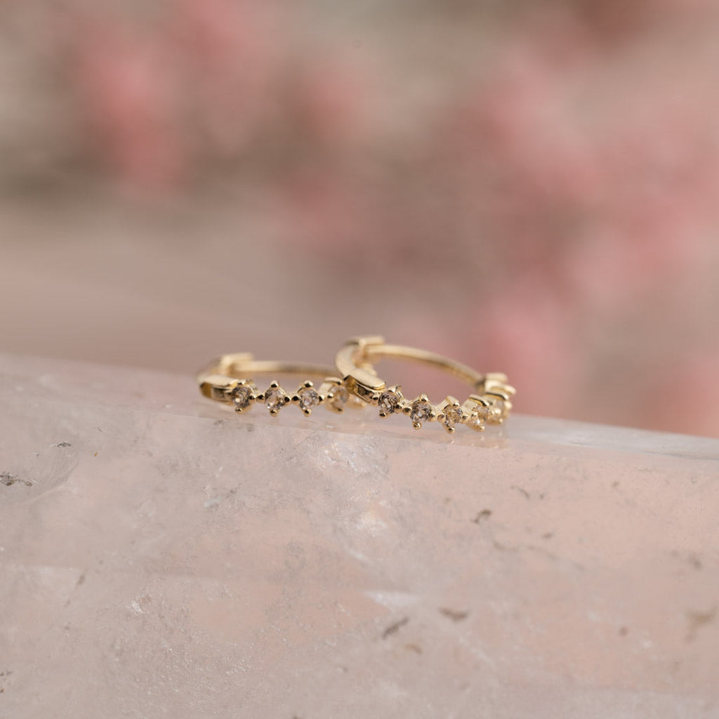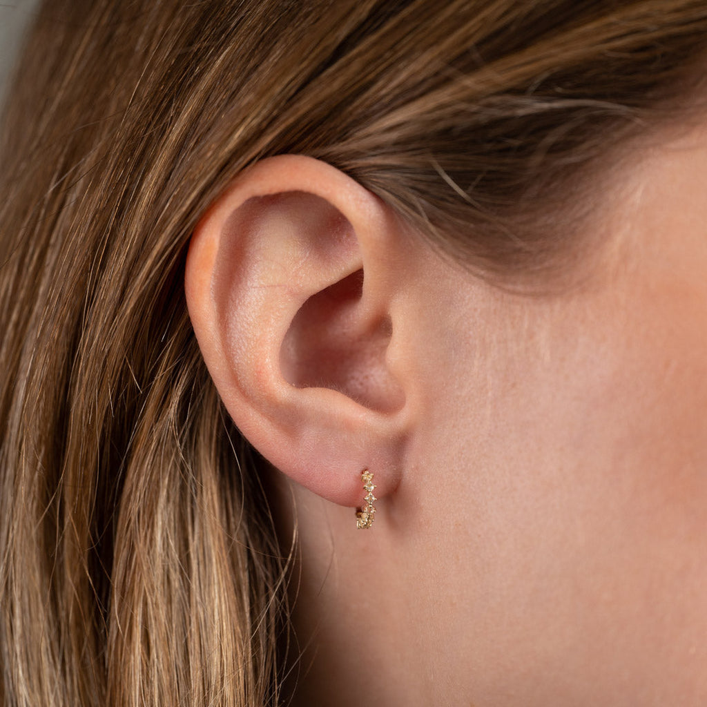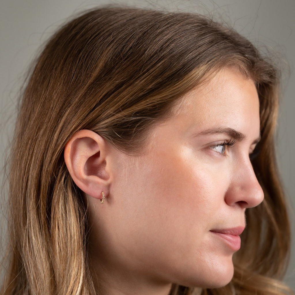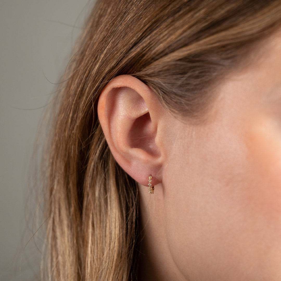 Our Miley earrings are made of 100% recycled 9 karat solid gold with a row of 7 small natural white topazes. The earrings measure 10.5x2.2mm and close with a hinged click lock.
