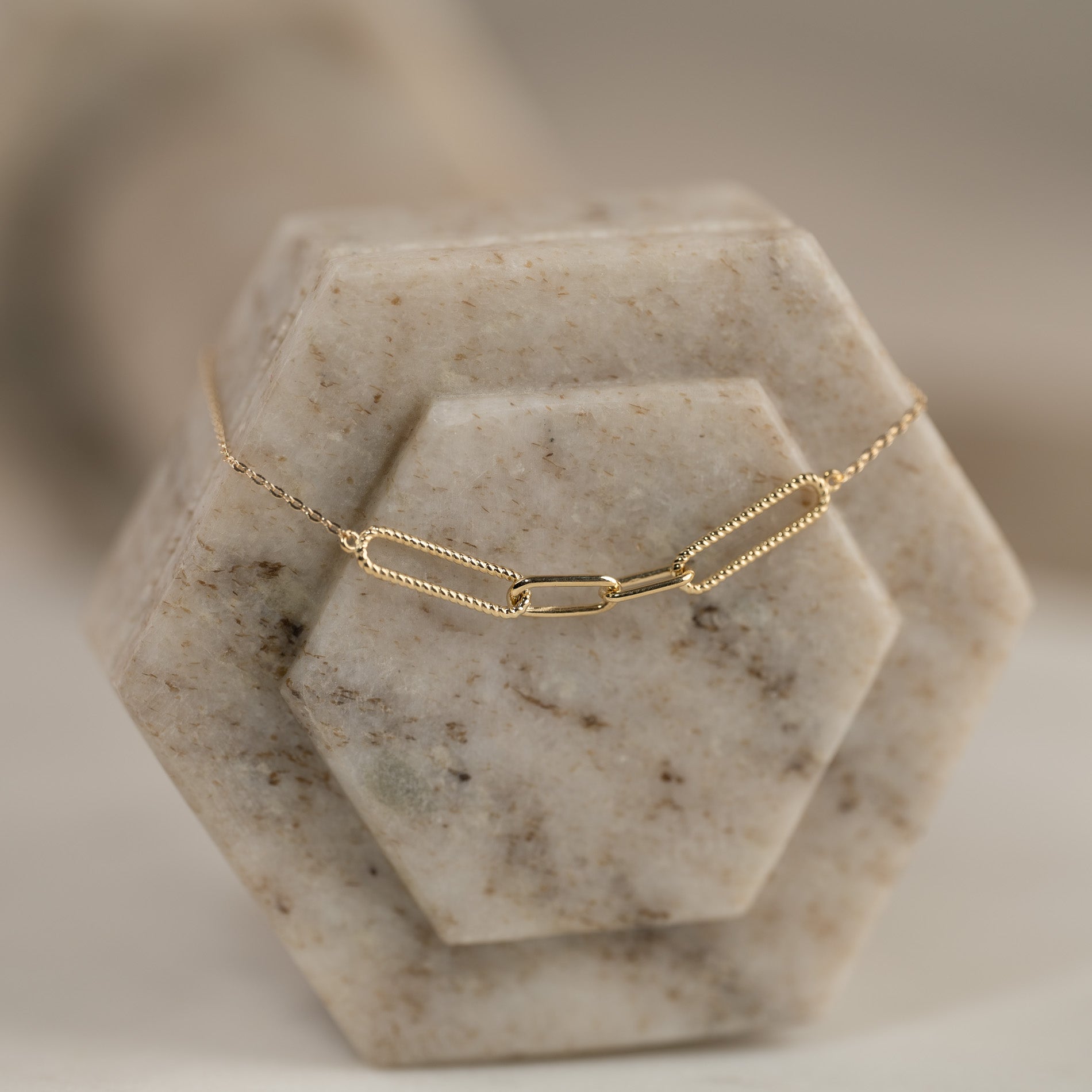 The Natalie bracelet features a simple design with a touch of rugged charm from the four elongated paperclip links on the top side.