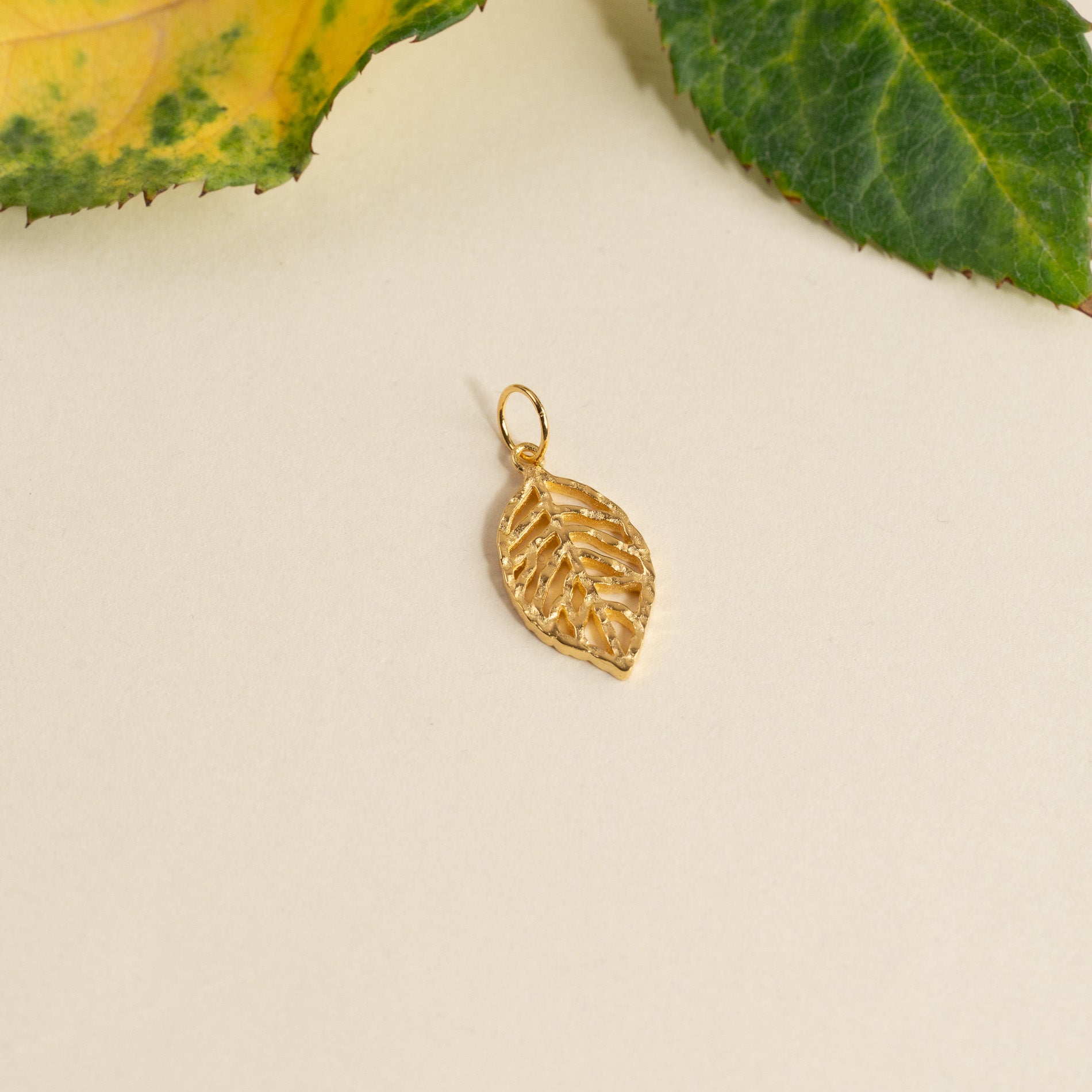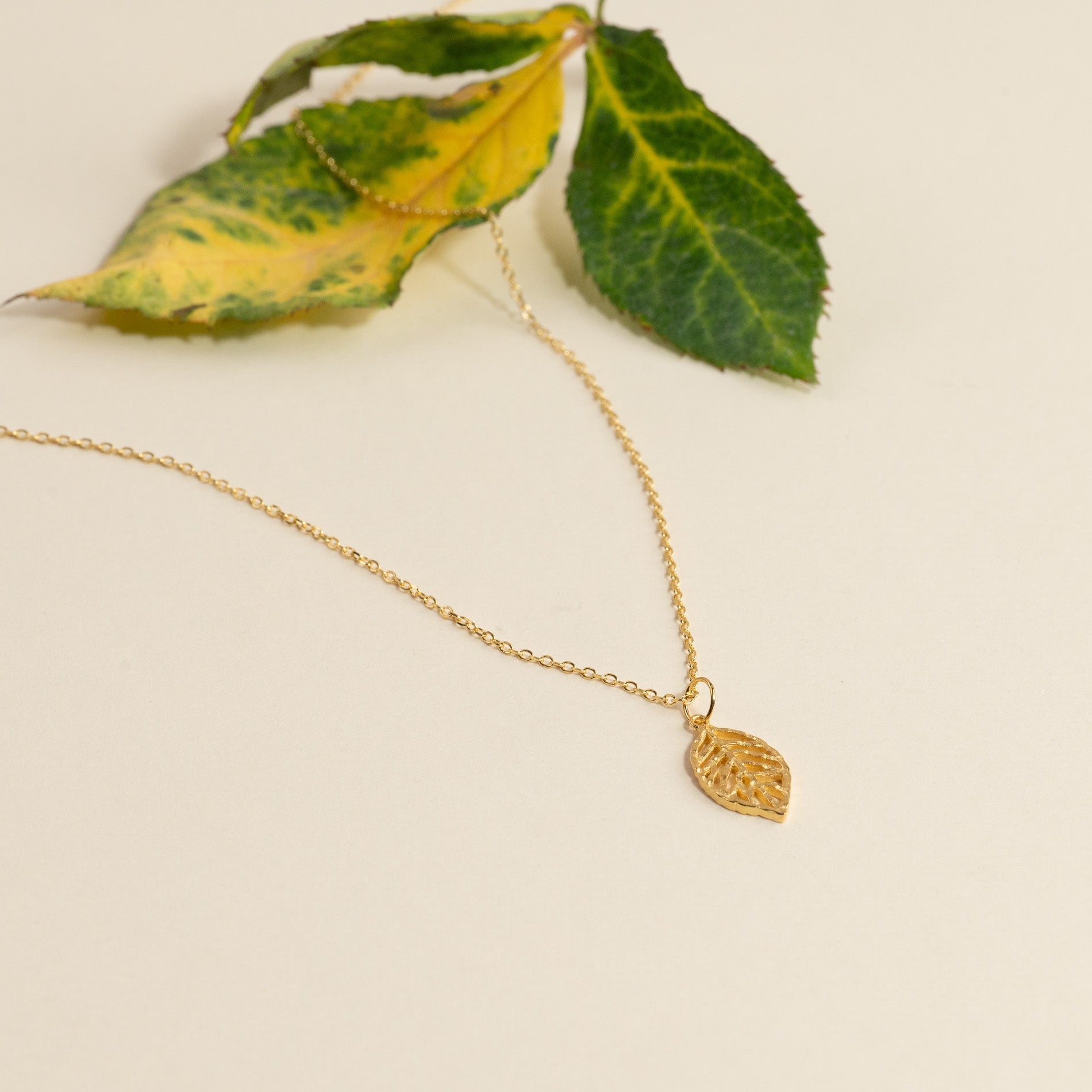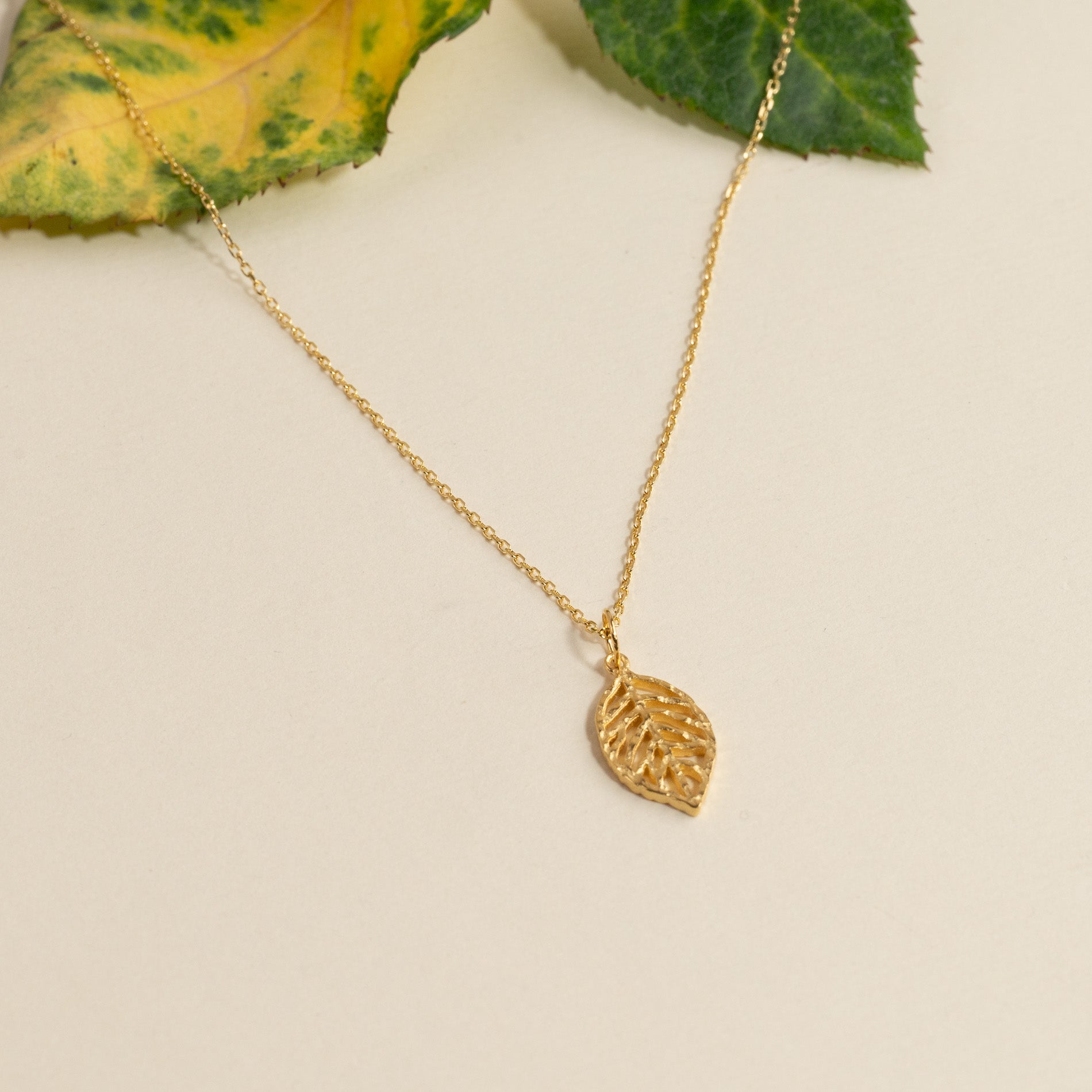 The pendant has a beautiful leaf shape with a 'molten' surface that creates a raw, natural texture. Its elegant design makes it a perfect personal gift or a meaningful addition to your jewelry collection.