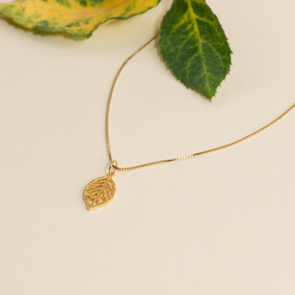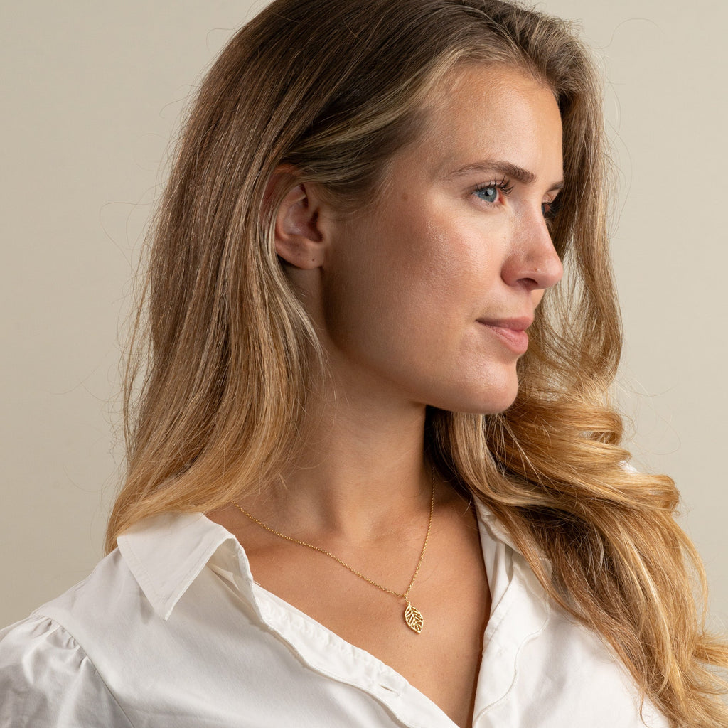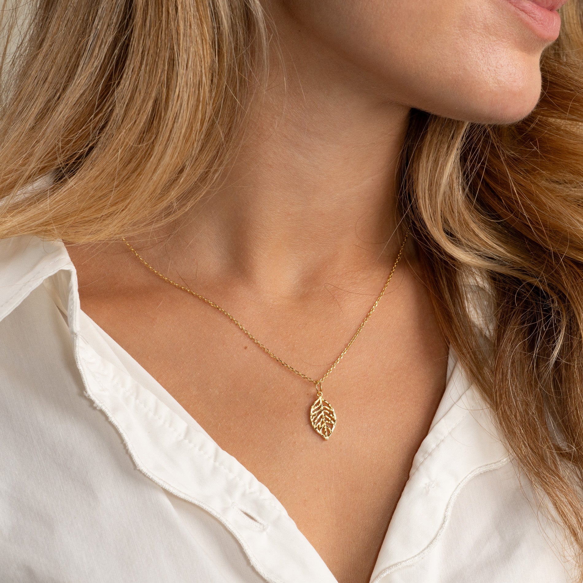 The pendant has a beautiful leaf shape with a 'molten' surface that creates a raw, natural texture. Its elegant design makes it a perfect personal gift or a meaningful addition to your jewelry collection.