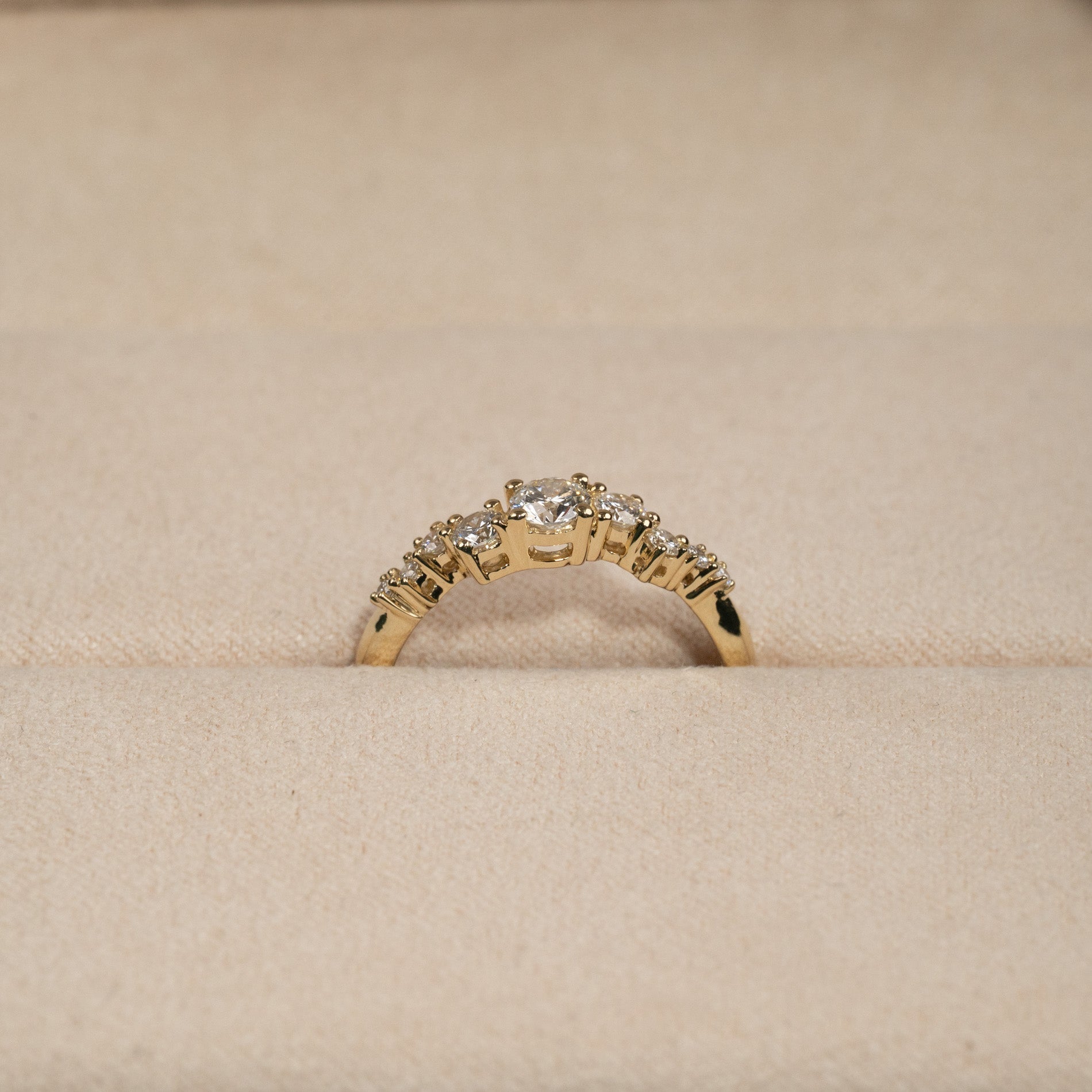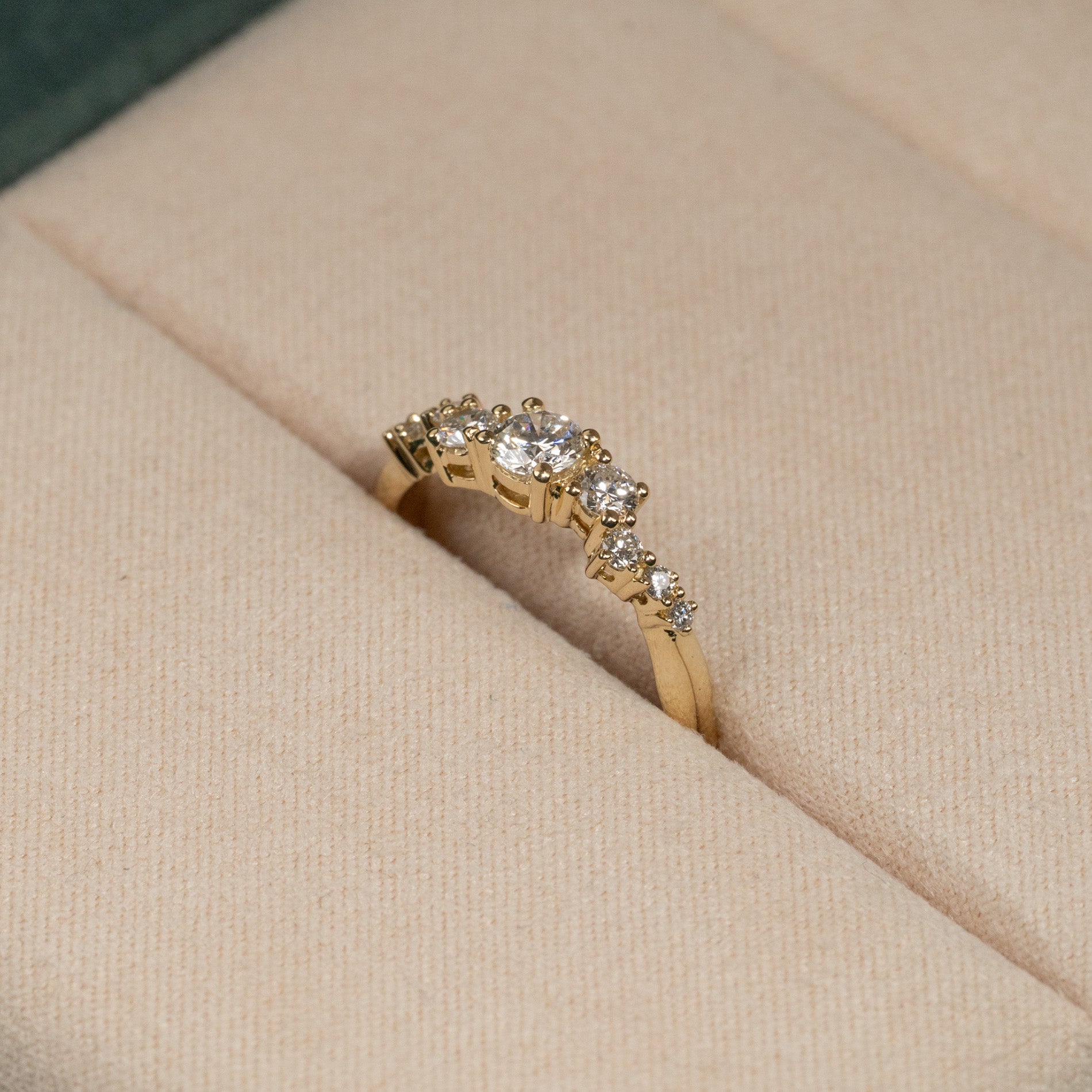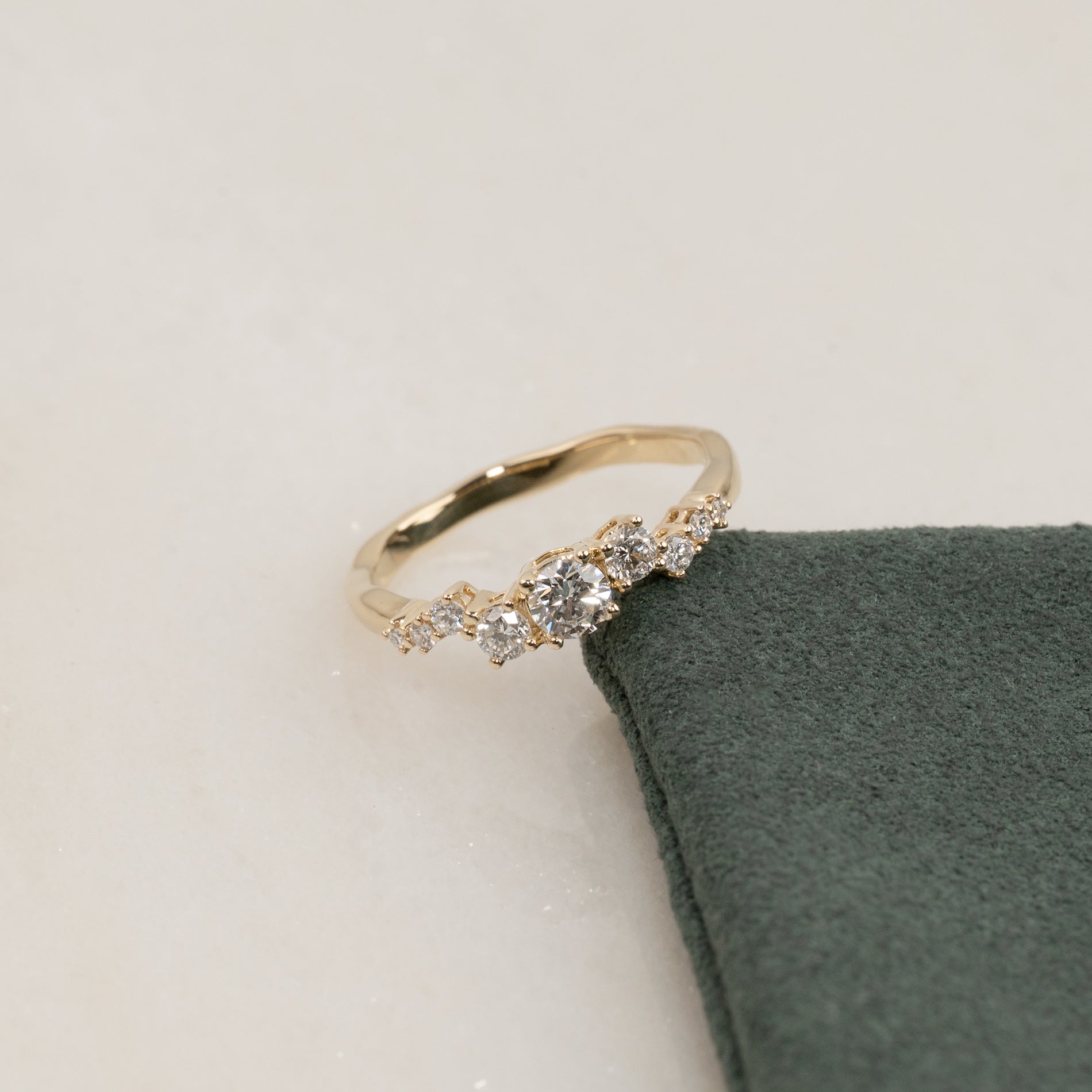 Ring in 14 kt. gold with 0.5 ct lab-grown diamonds in graduating sizes - a total of 9 stones, including a center stone of 0.22 ct. The setting is beautiful with the diamonds placed in an linear cluster. The band features an organic design, adding a modern twist.