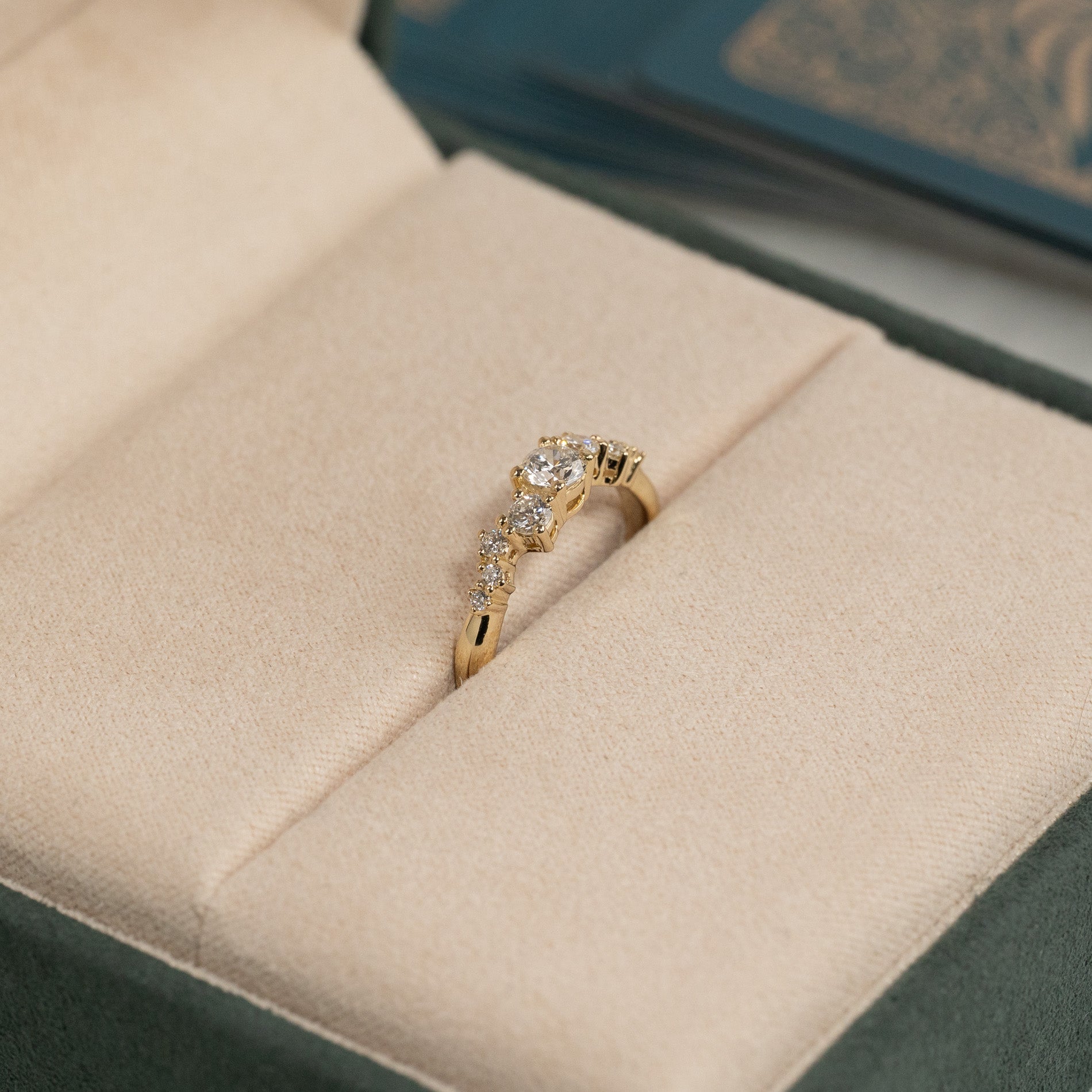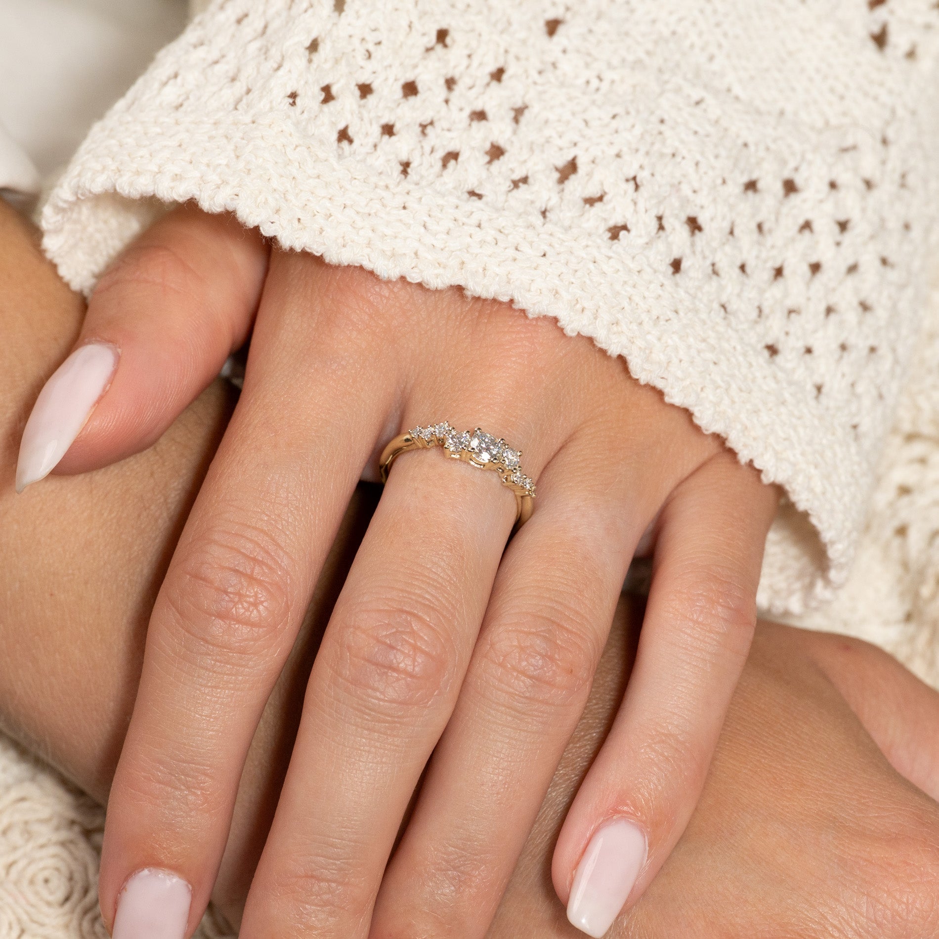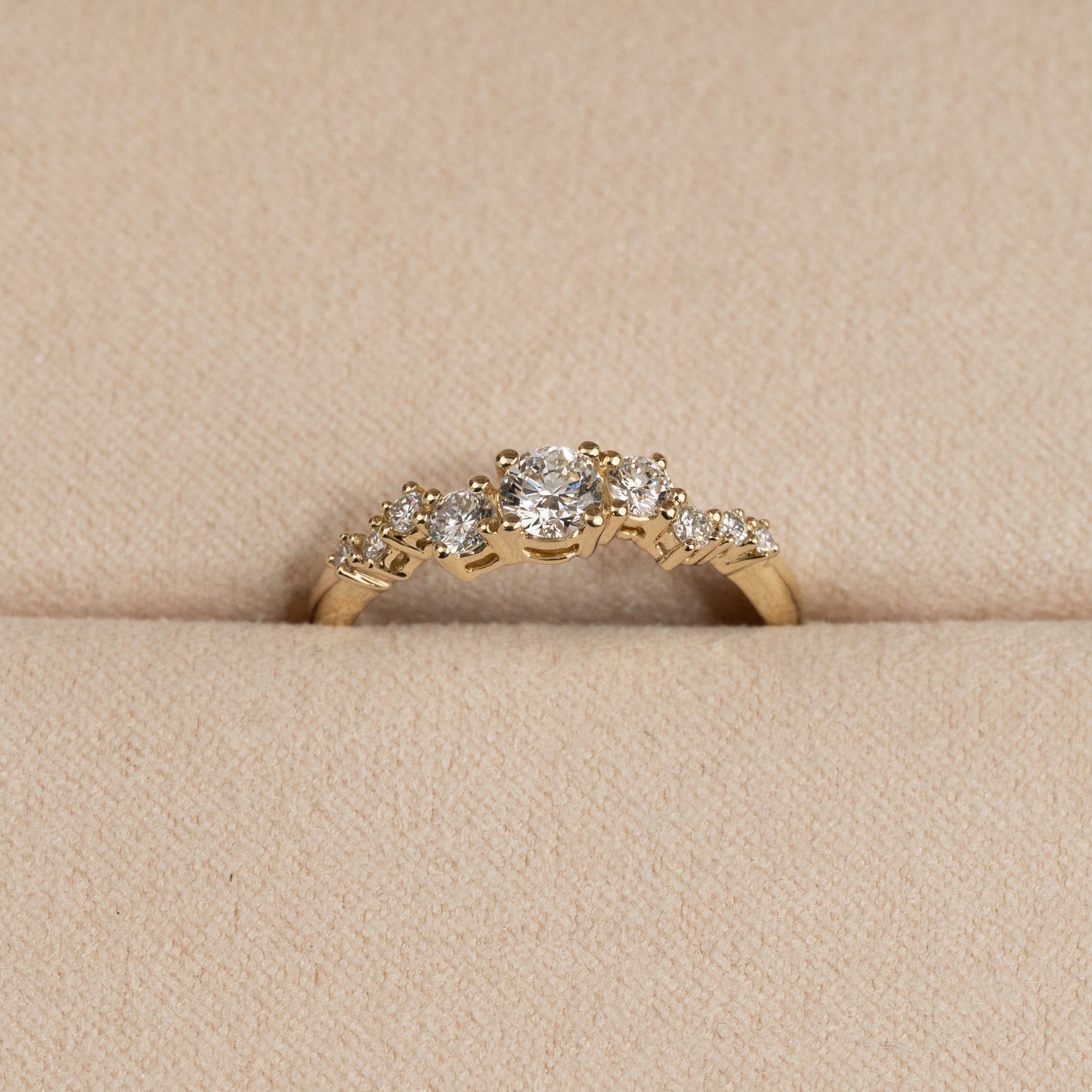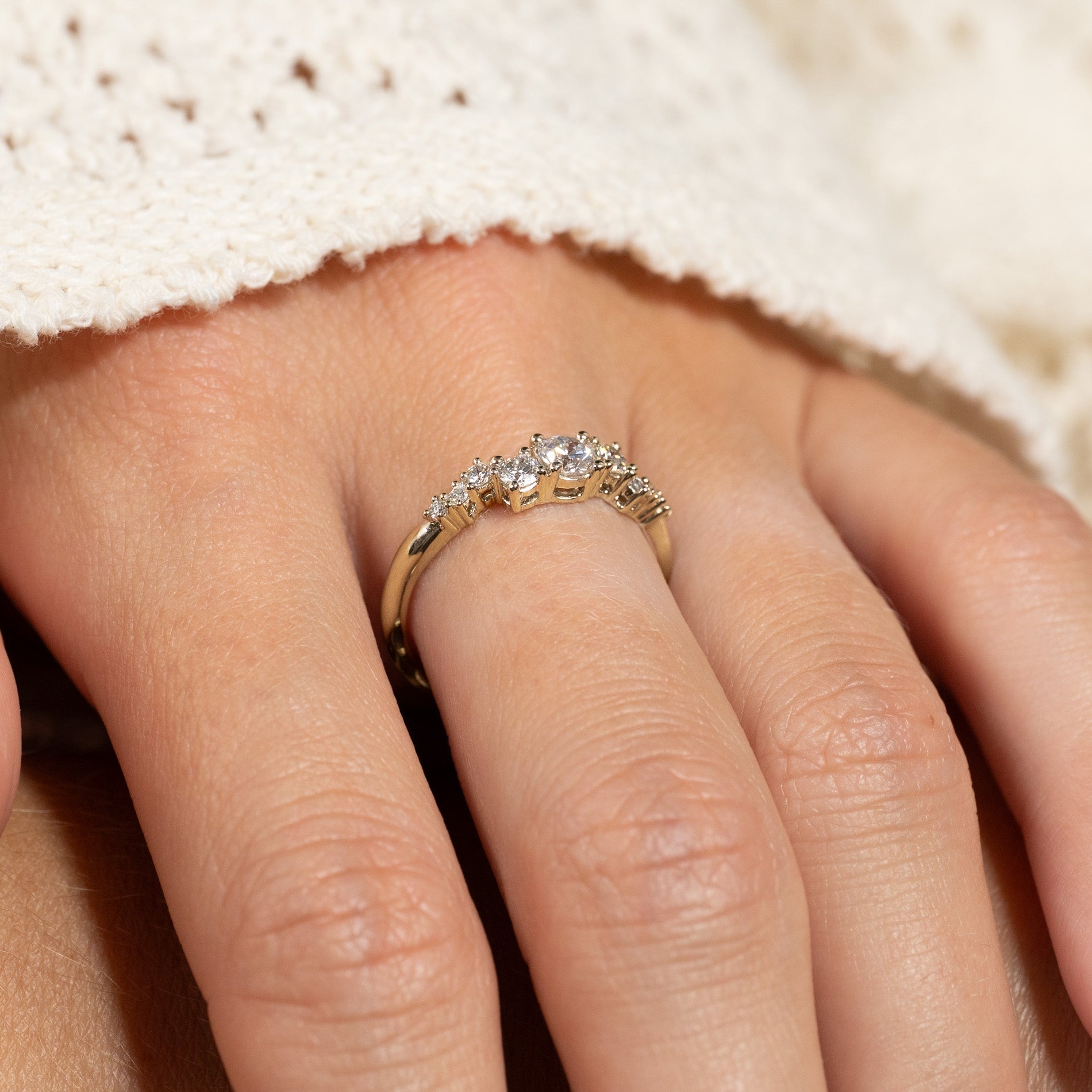 Ring in 14 kt. gold with 0.5 ct lab-grown diamonds in graduating sizes - a total of 9 stones, including a center stone of 0.22 ct. The setting is beautiful with the diamonds placed in an linear cluster. The band features an organic design, adding a modern twist.