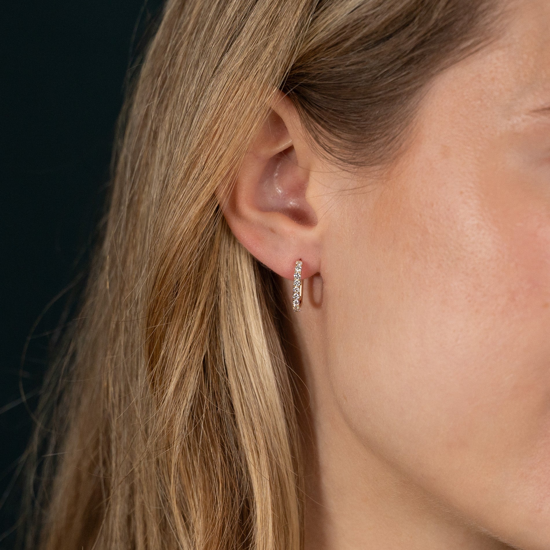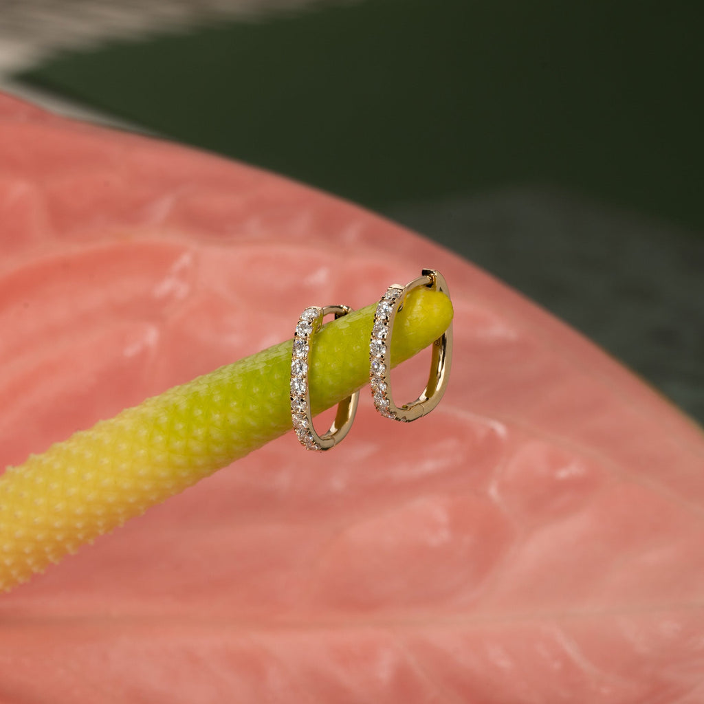 The oval diamond hoops are crafted in 14 kt. solid gold with 18 lab-grown diamonds totaling 0.45 ct. They have a color grade of E-F (River) and clarity of VVS. Thoughtfully made with care; the diamonds are created using solar energy, and the gold is 100% certified recycled.