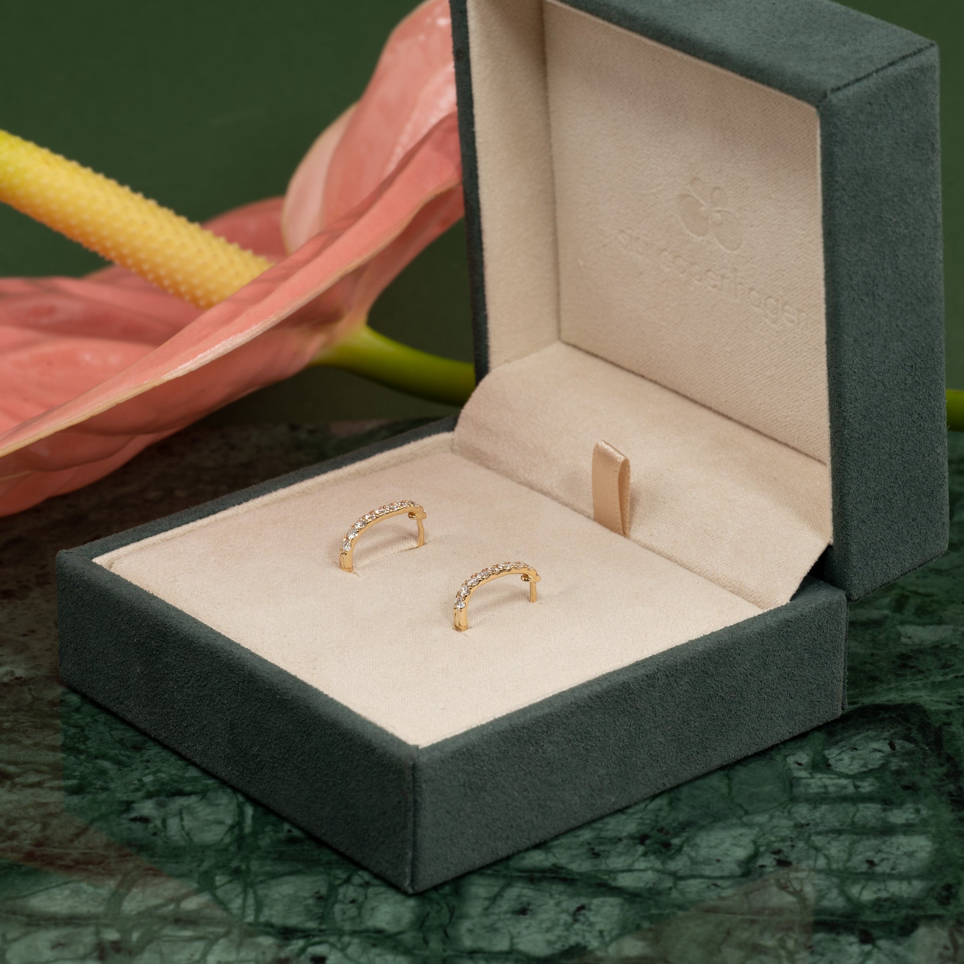 The jewelry is beautifully and securely placed in a jewelry box covered with vegan suede.