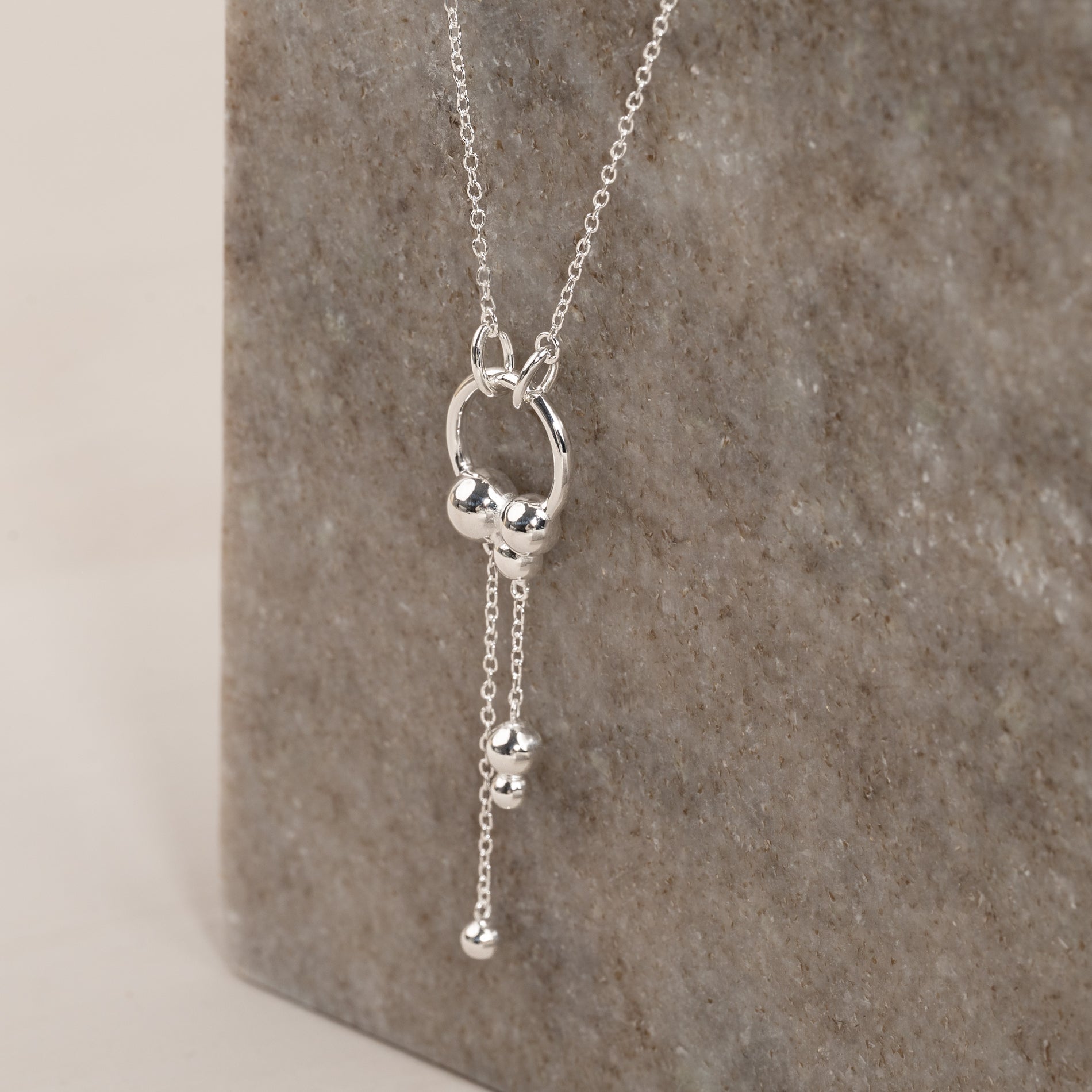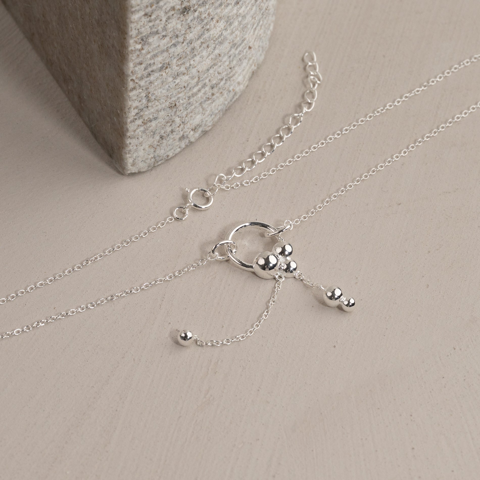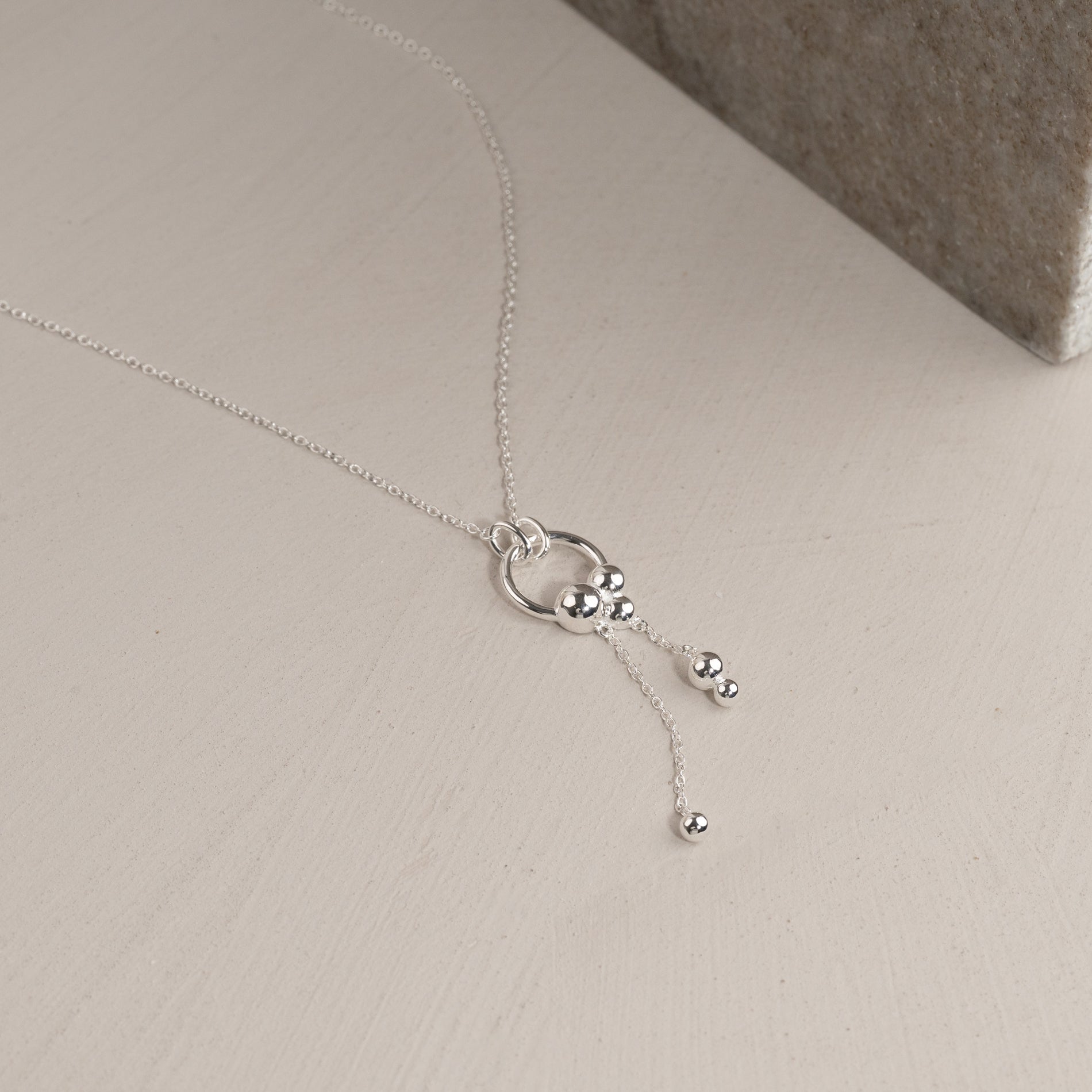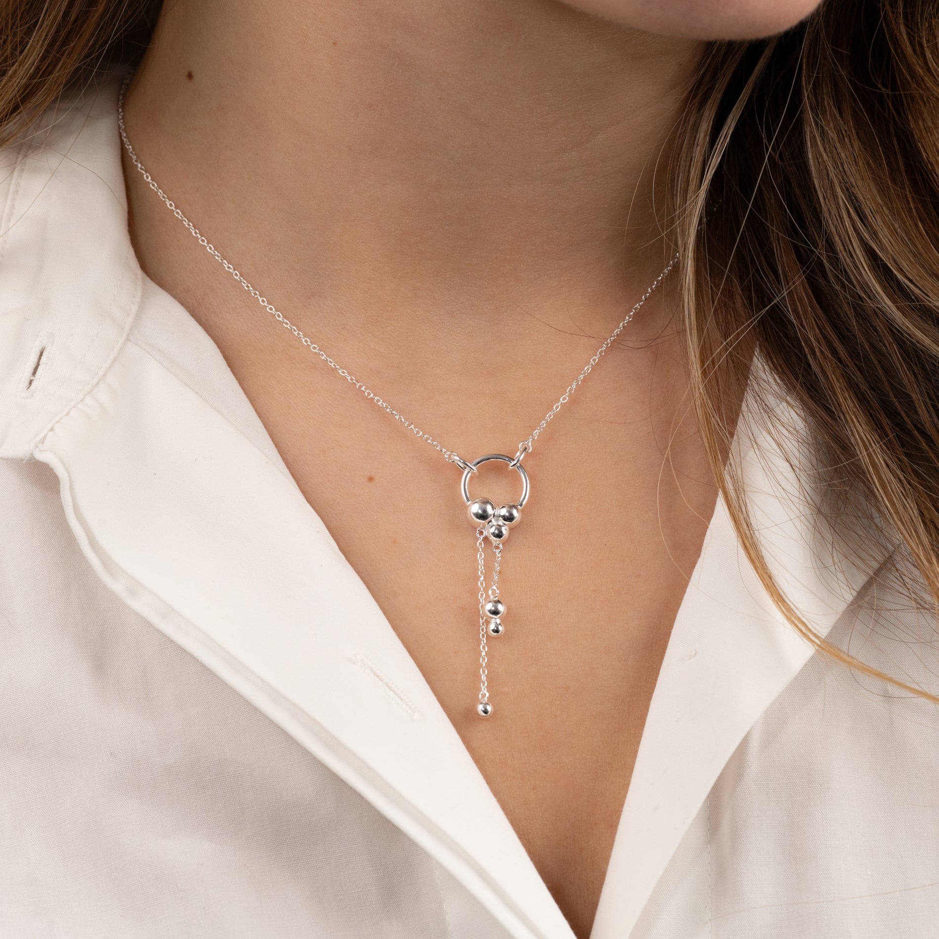 This unique necklace has a classic chain with an integrated circular pendant decorated with small sculptural spheres. The necklace moves gracefully and offers a feminine and eye-catching look.