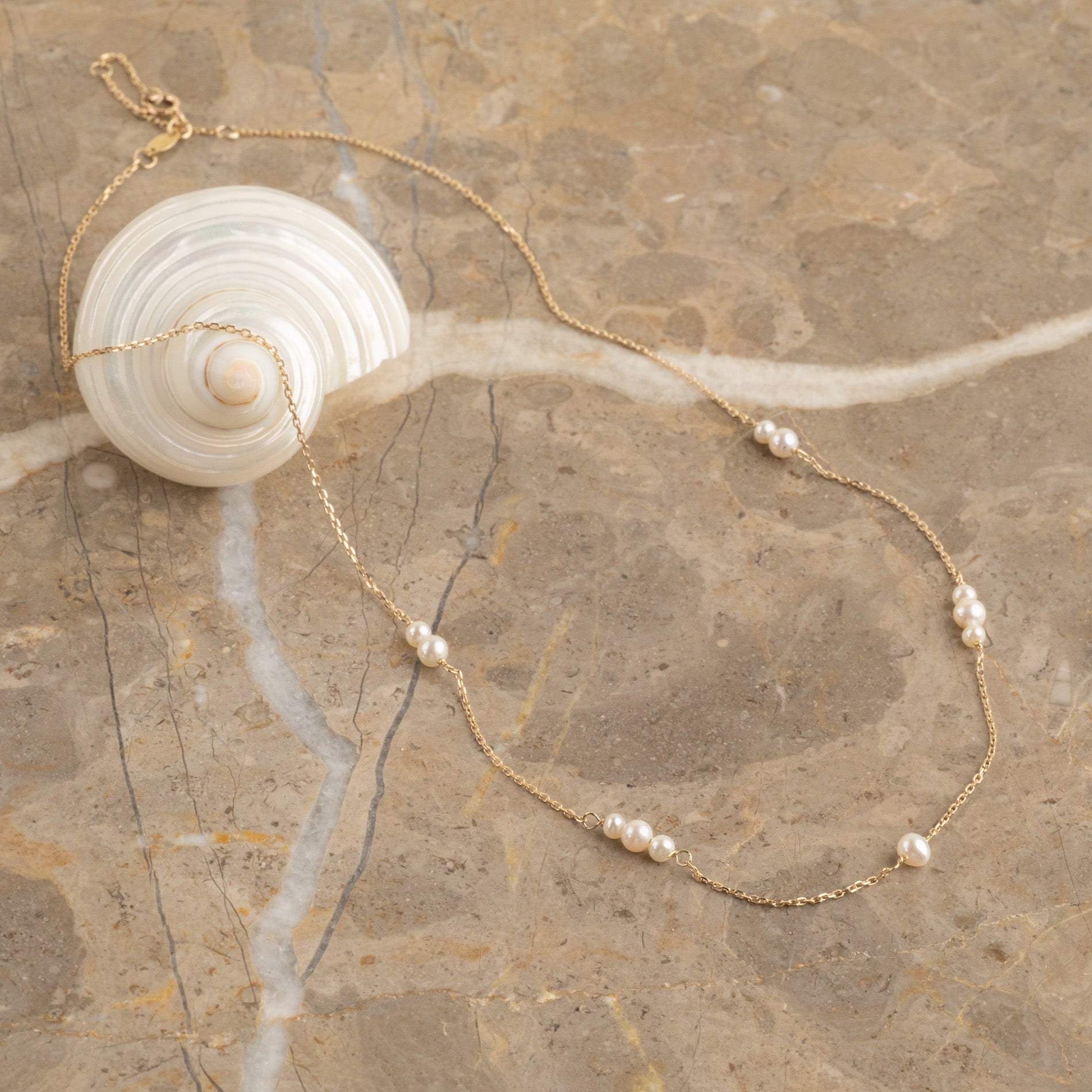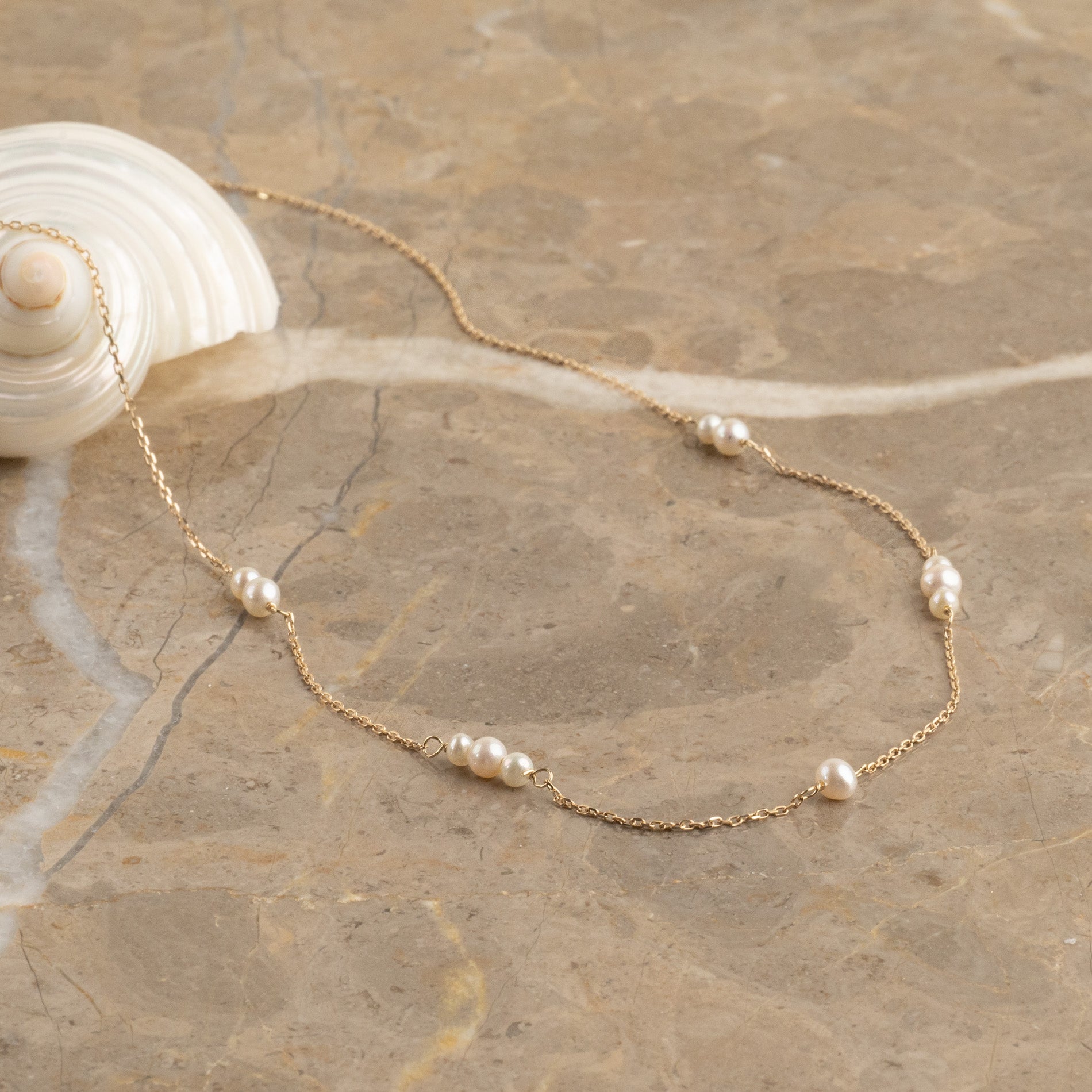 Necklace in 100% recycled 9kt. solid gold with small oval white freshwater pearls.
