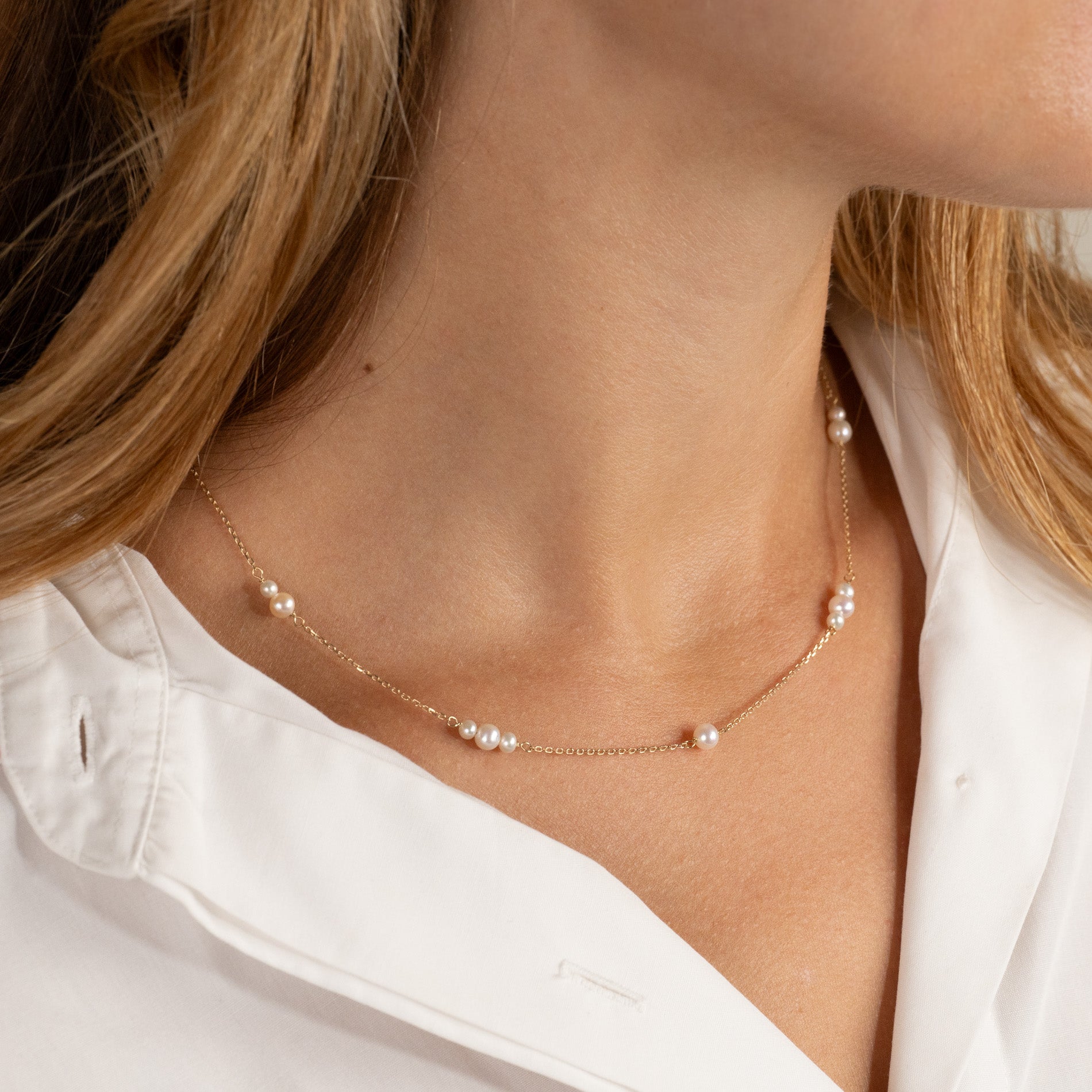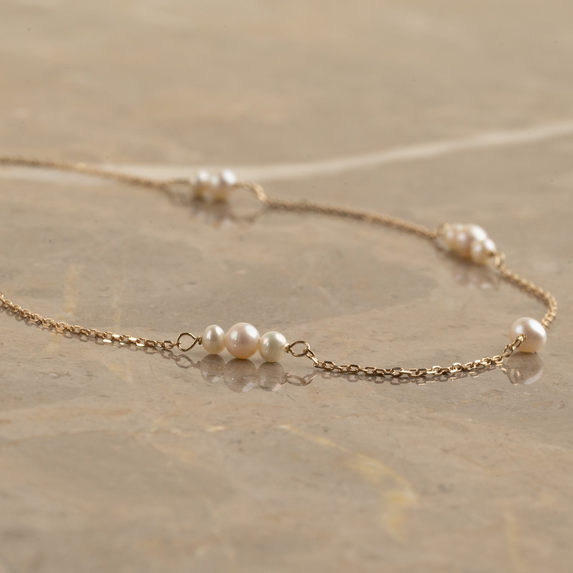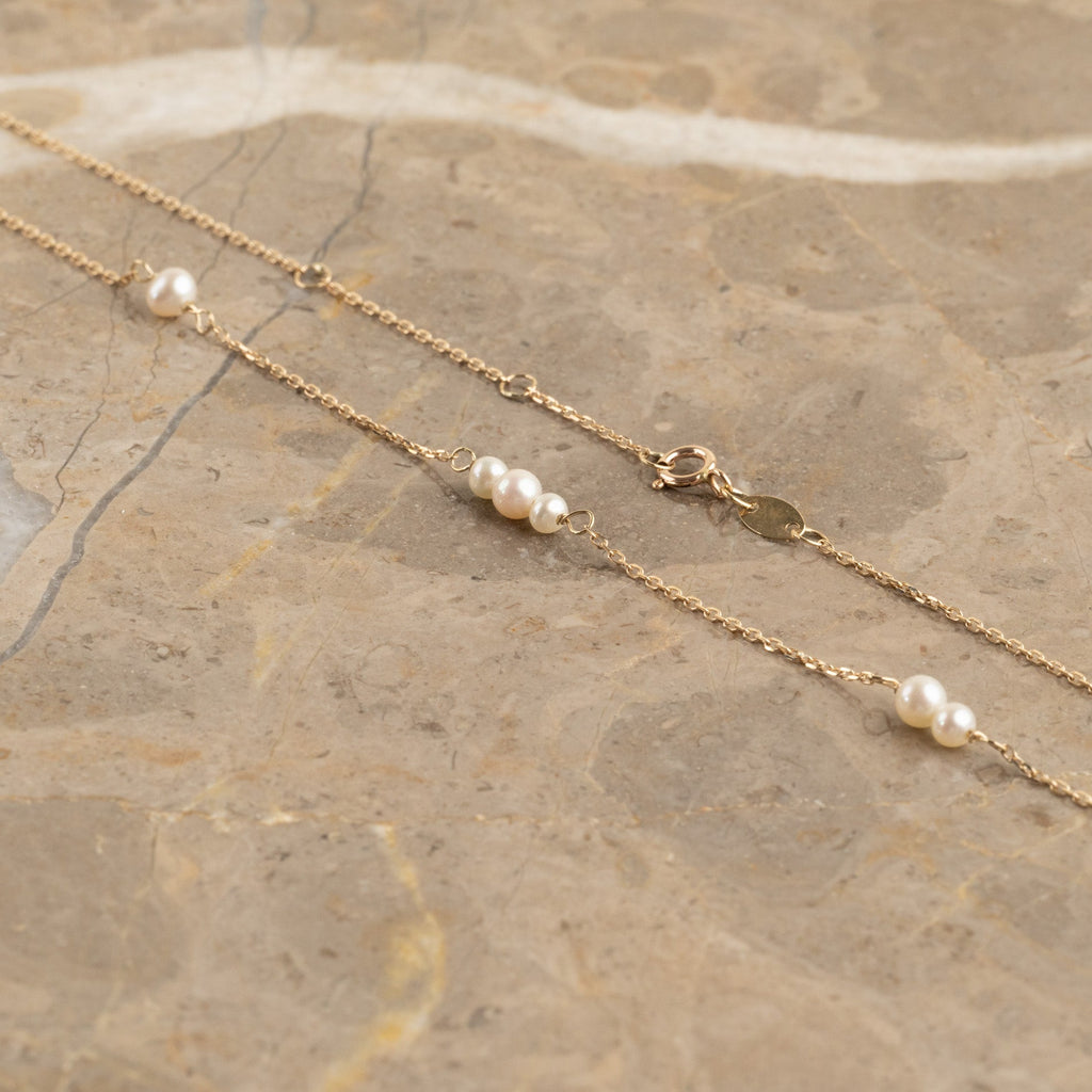 The pearls measure 3-5mm in diameter and are offset on the chain. The chain has an adjustable length between 42-45cm.