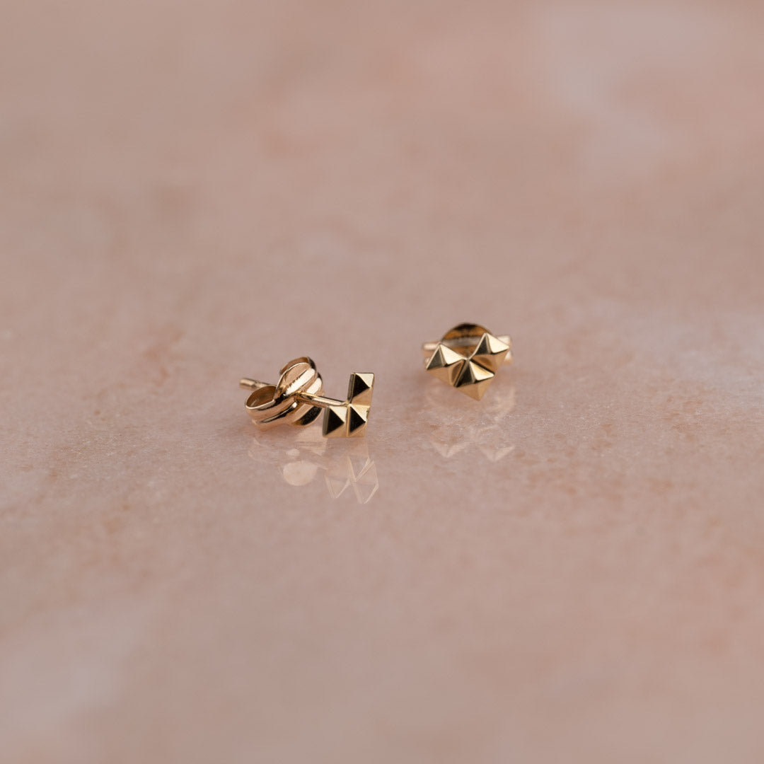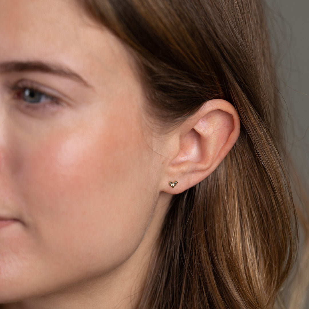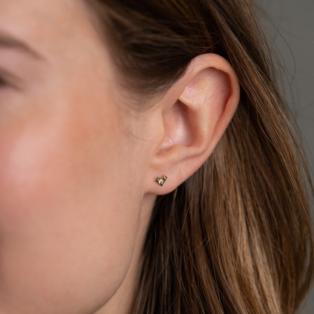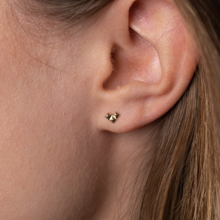 Our riveted Heart Ear Stickers are created in 100% recycled massive 9 carat gold. They designed as three 'rivets' that together form a heart shape, an arrow or an L - depending on how to turn them when you put them on. The raw expression from the rivets of the fine little design can be a perfect way to put a little edge on one's outfit.