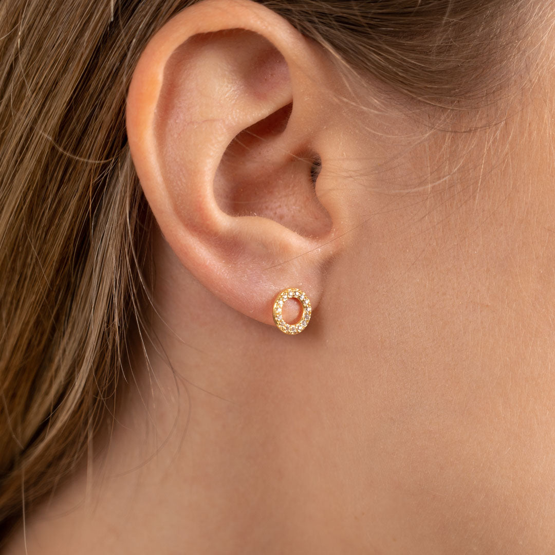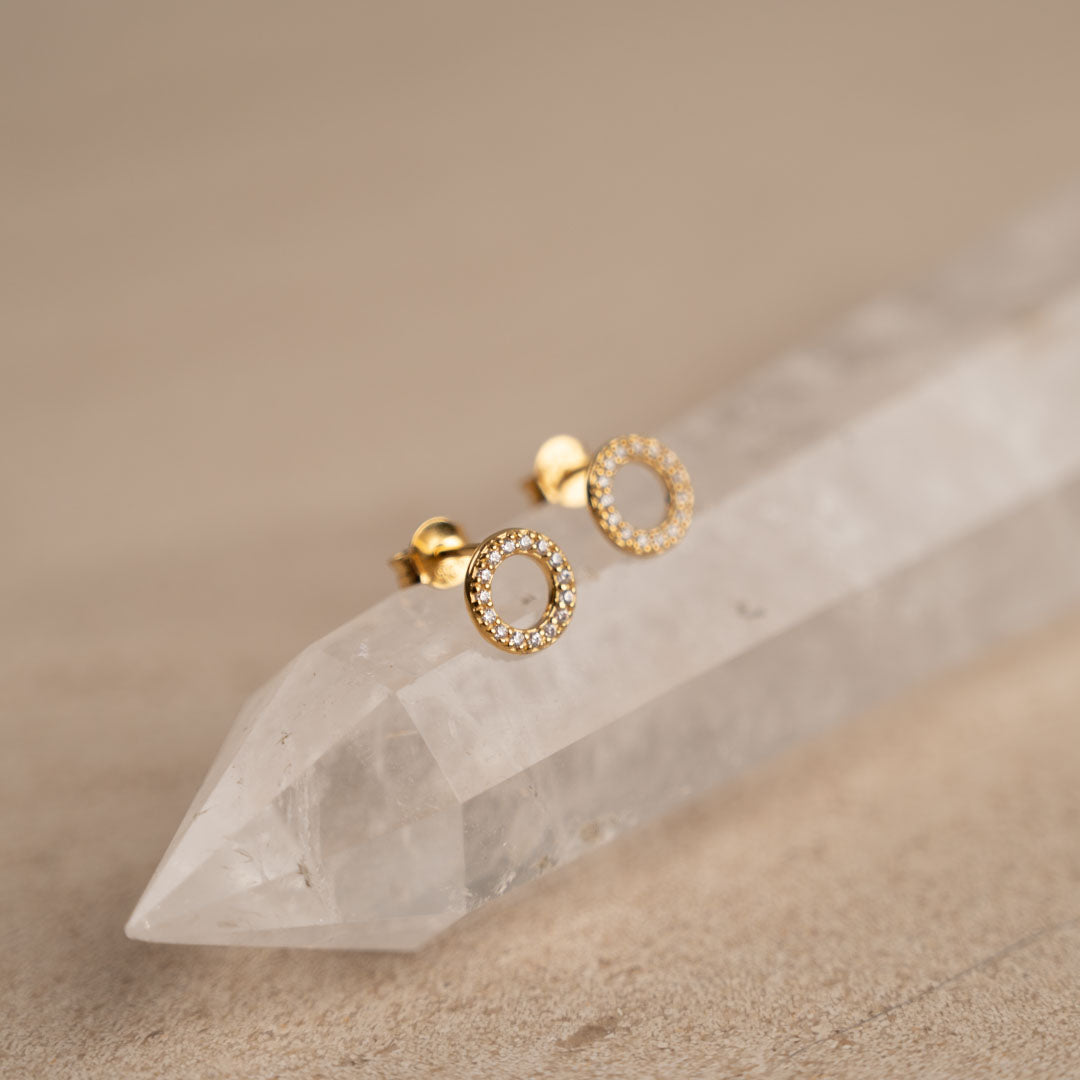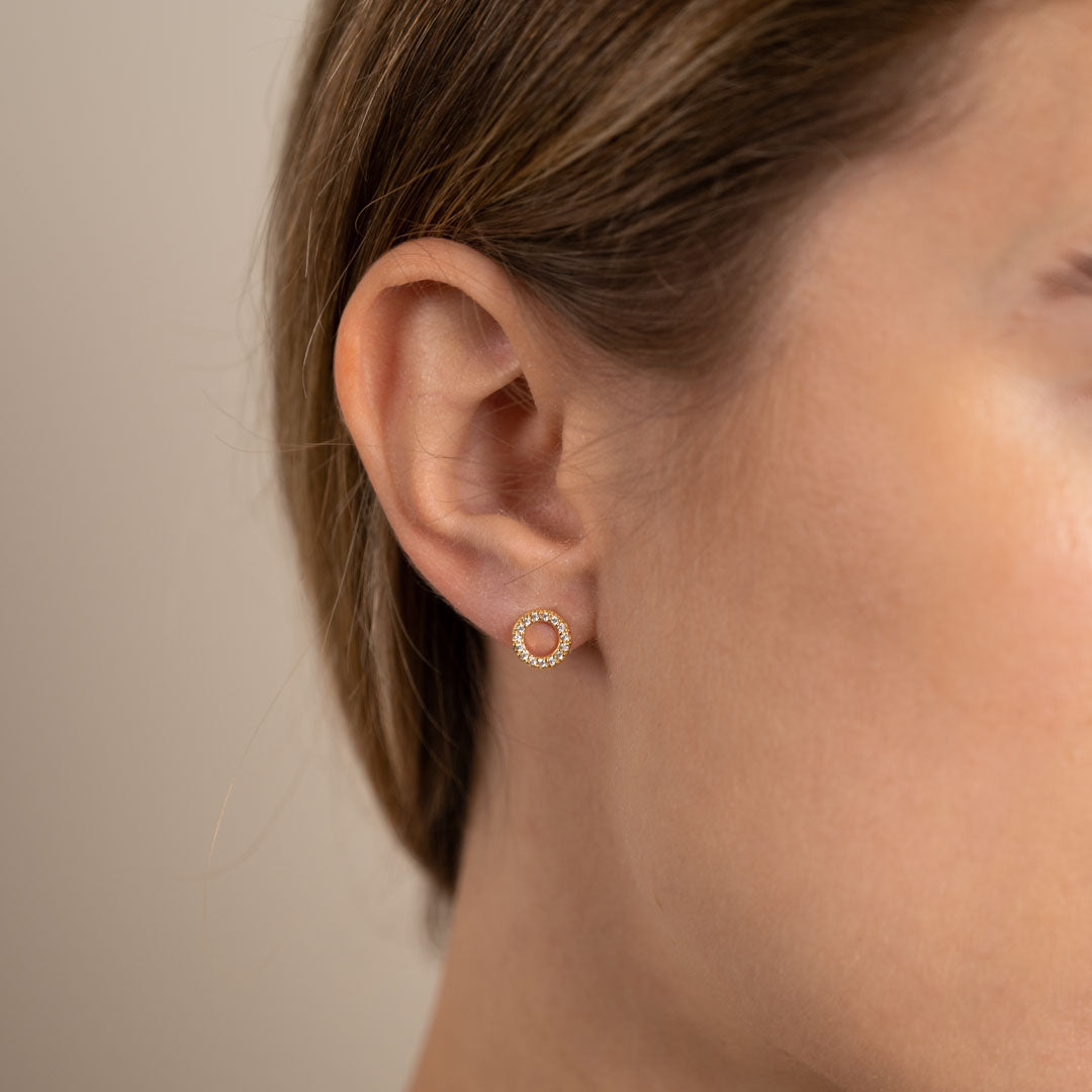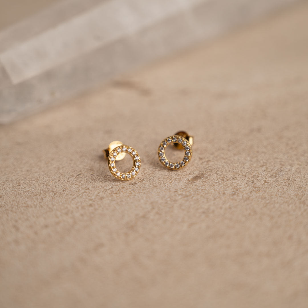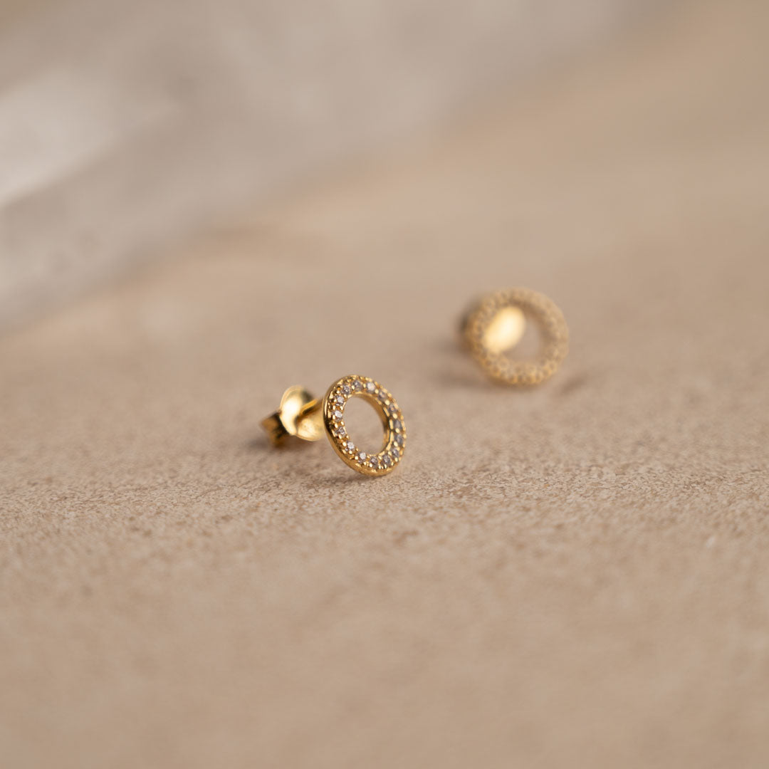 Our Roberta earrings are made of 100% recycled 18-carat gold-plated sterling silver and clear zircons. The earrings have an elegant and simplistic design. The zircon-studded rings sit nicely on the ear and create a minimalistic elegance.