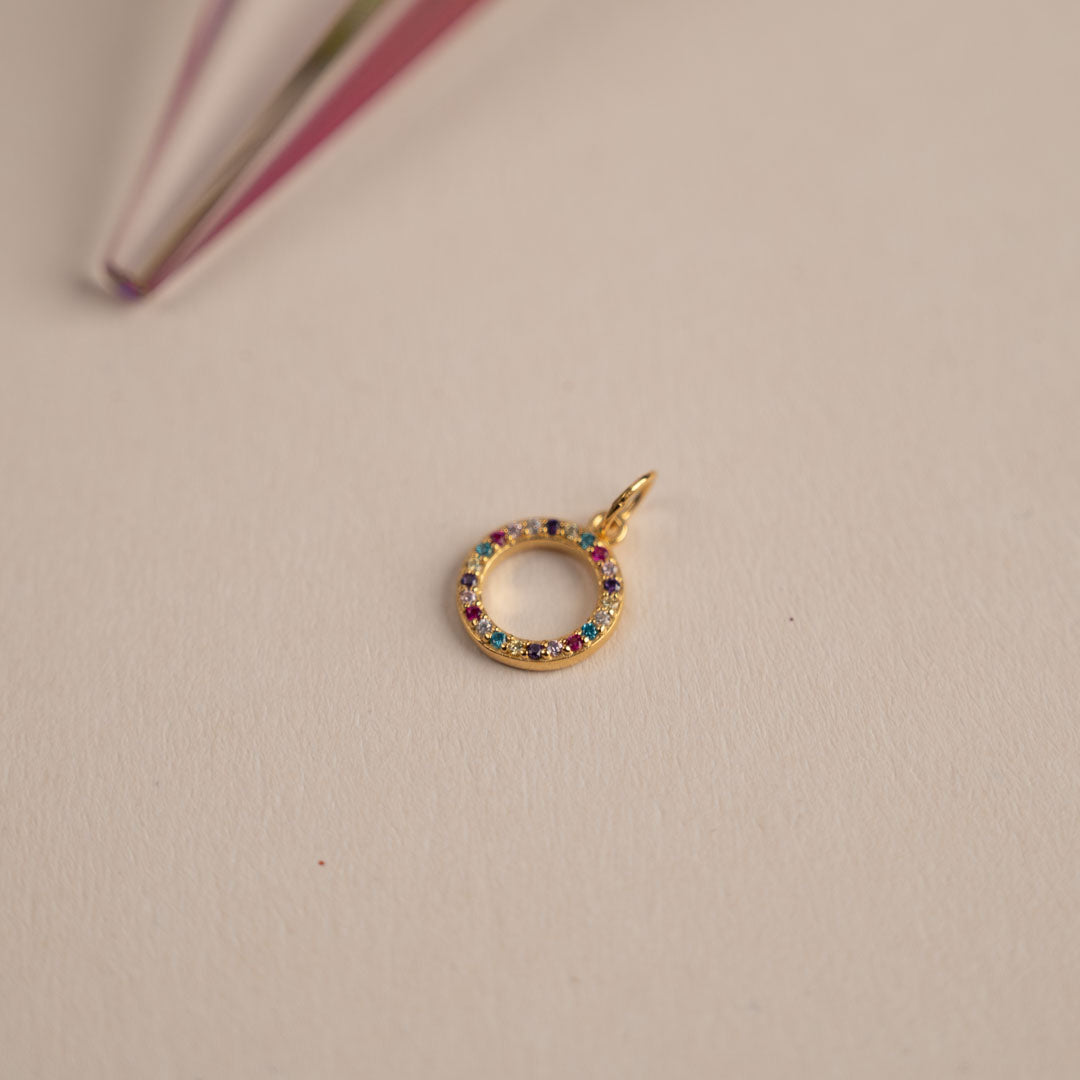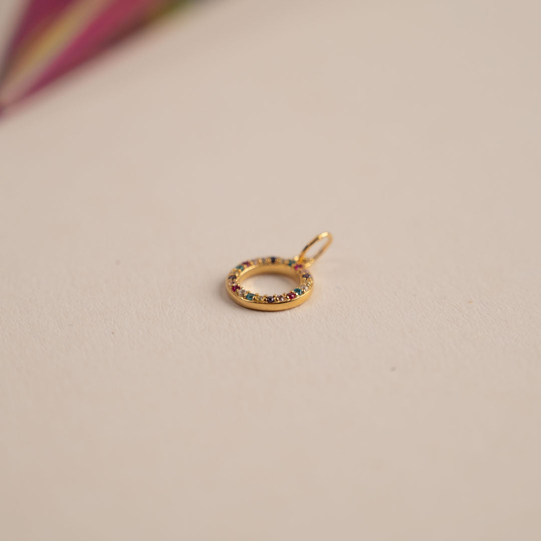 Our Roberta pendant is made of 100% recycled 18-carat gold-plated sterling silver and colored zircons. The pendant has an elegant and simplistic design. The zircon-studded ring sits nicely around the neck and creates a minimalistic elegance.