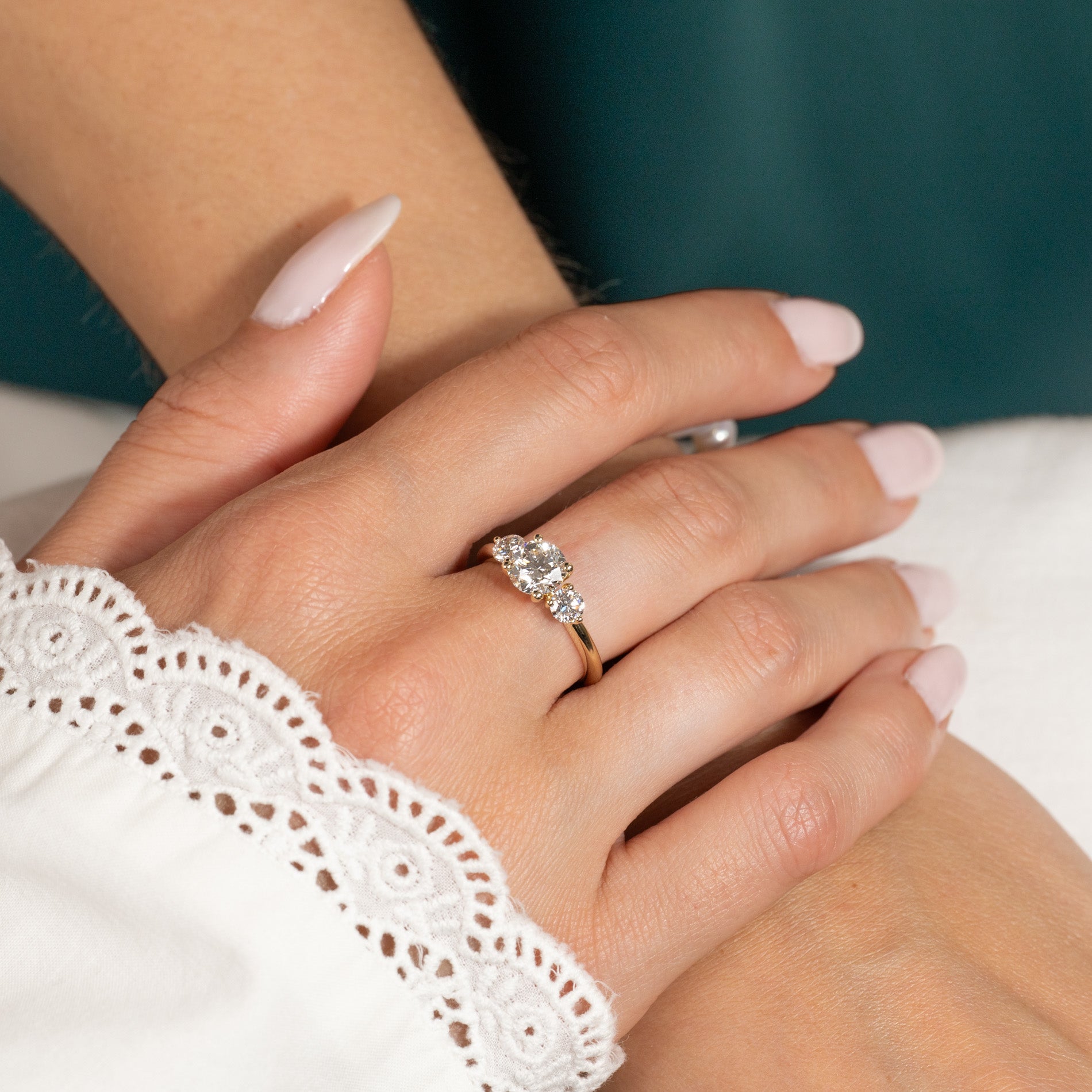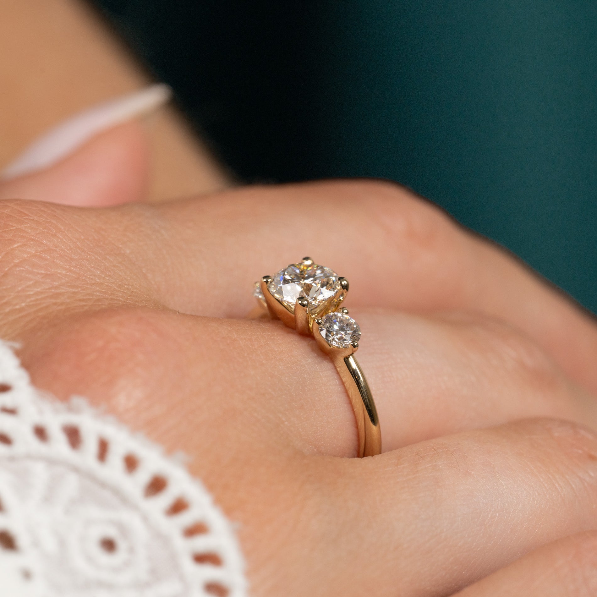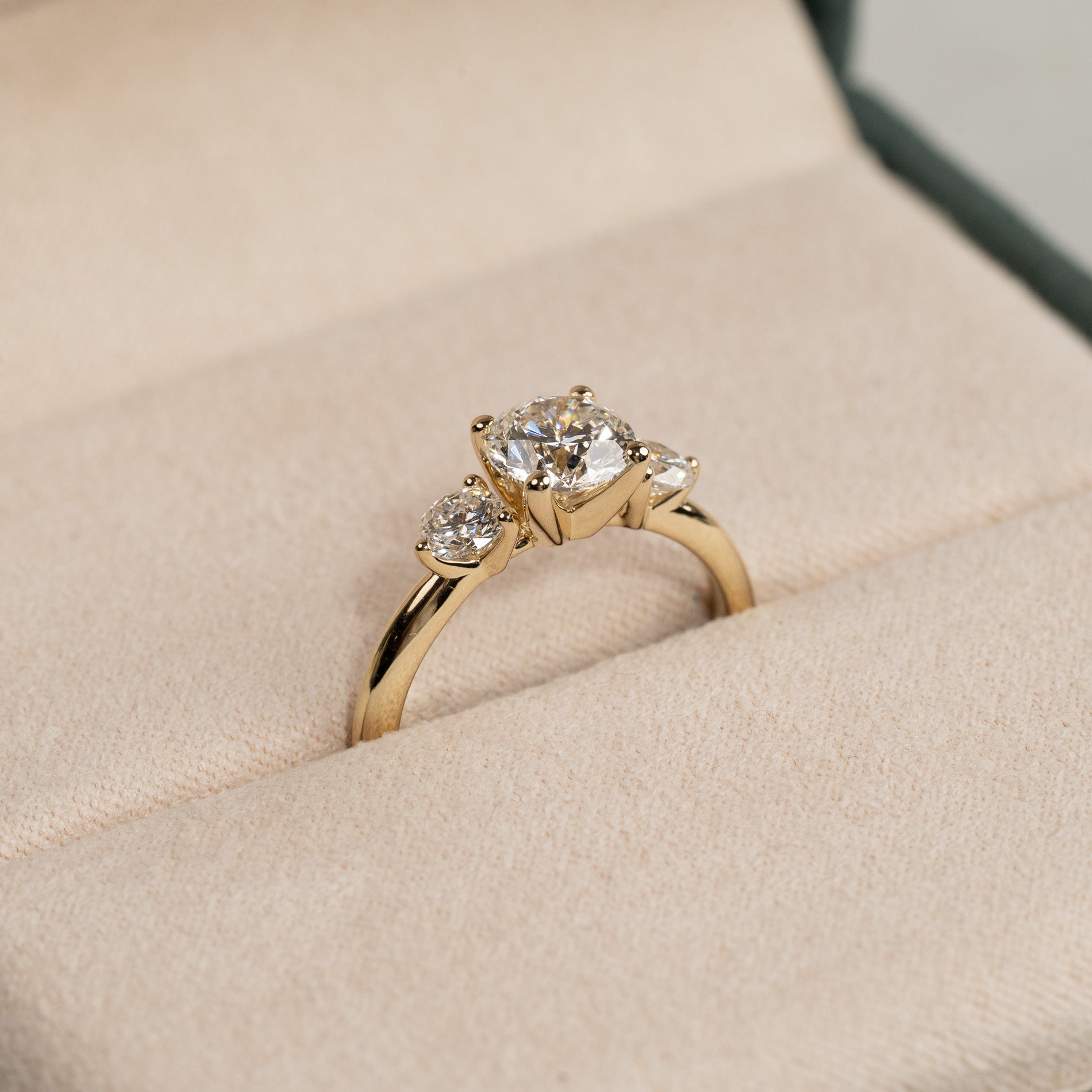 The ring is made of 14 karat solid gold with three lab-grown diamonds totaling 1.75 ct. The diamonds are E/F (River) in color and VVS in clarity. The piece is thoughtfully created; the diamonds are produced primarily using solar energy, and the gold is 100% certified recycled.