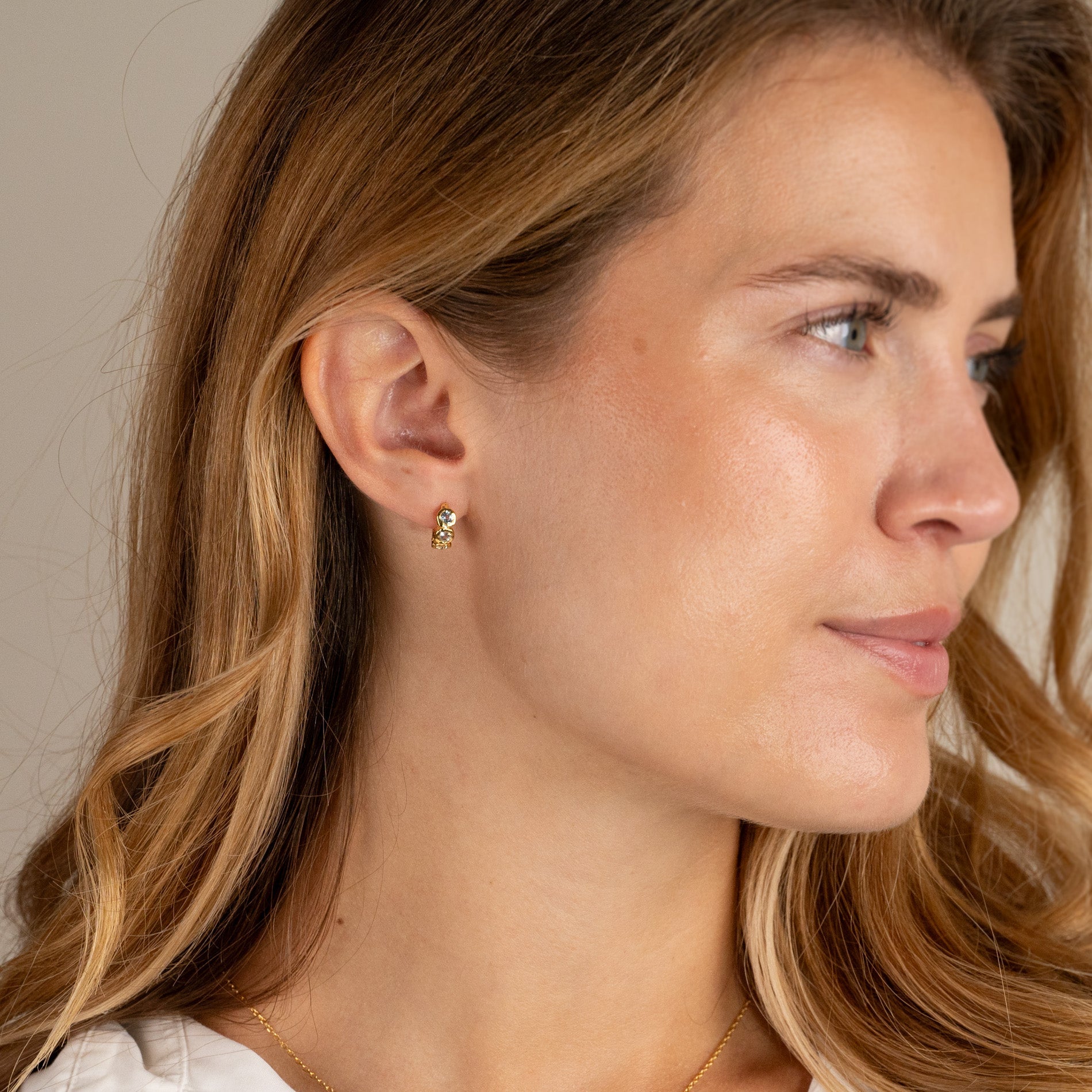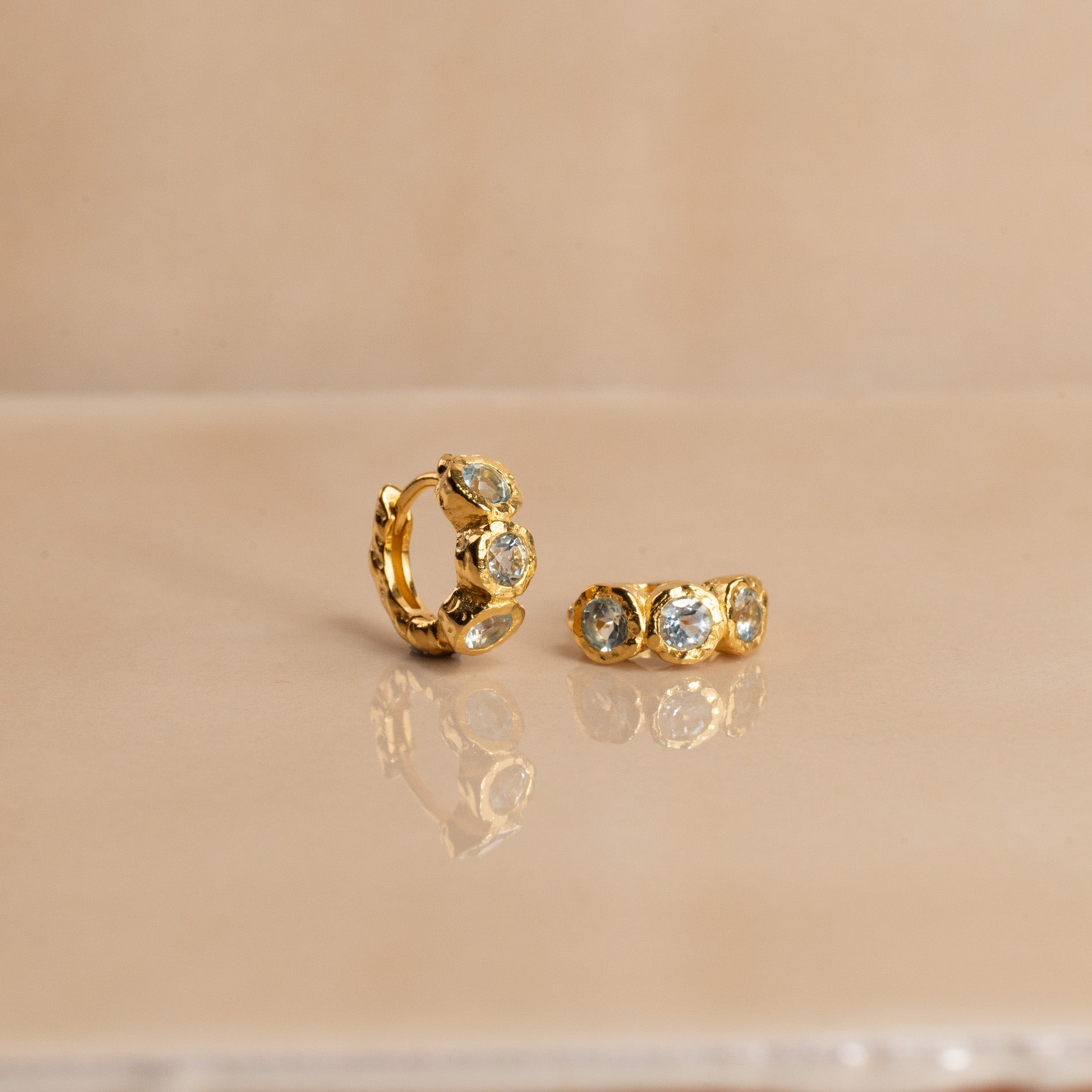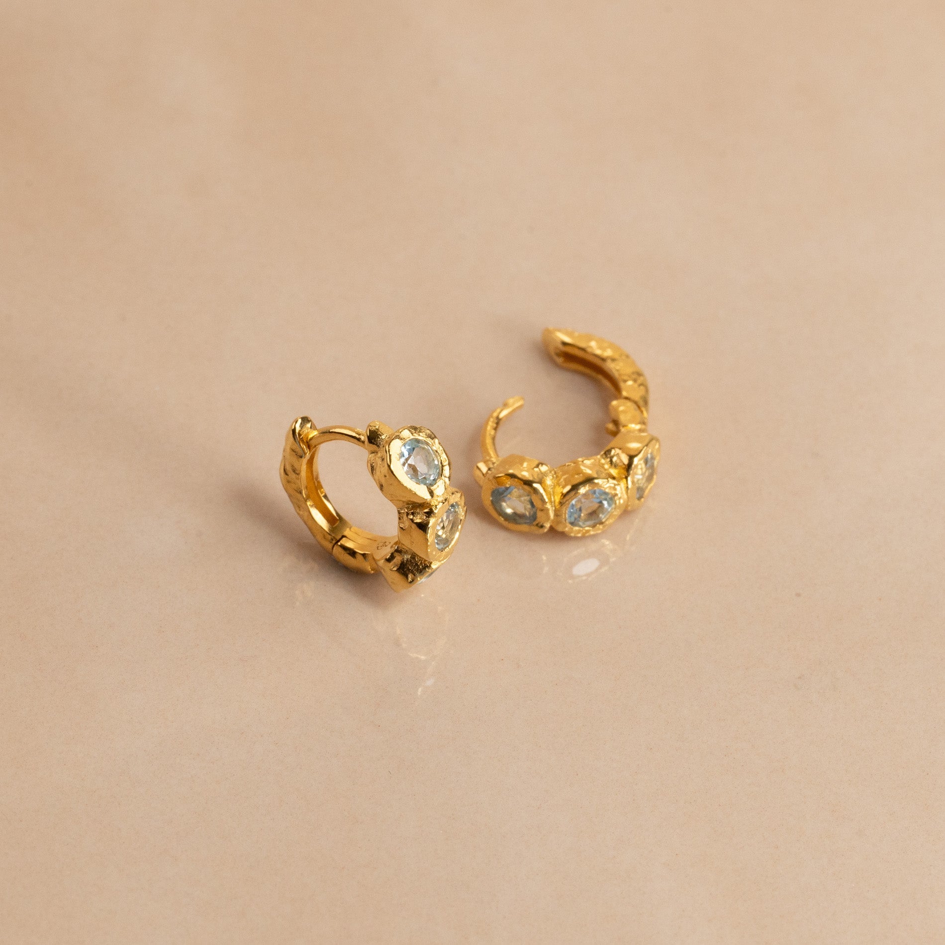 Huggies in 100% recycled 18 karat gold-plated sterling silver, each with three round blue topazes. The earrings have a molted surface – inspired by melted metal.