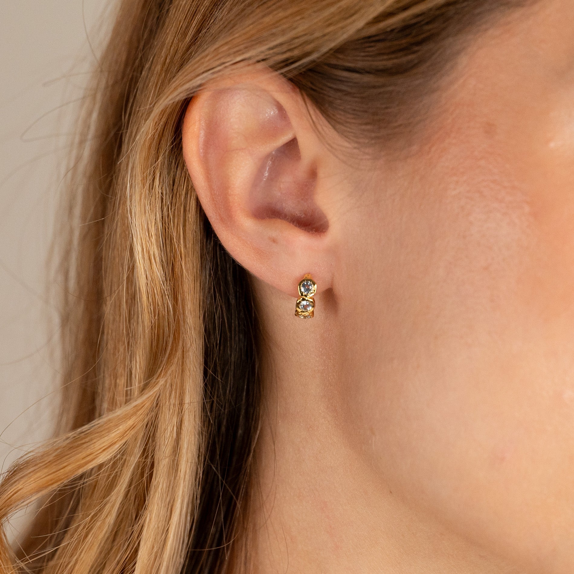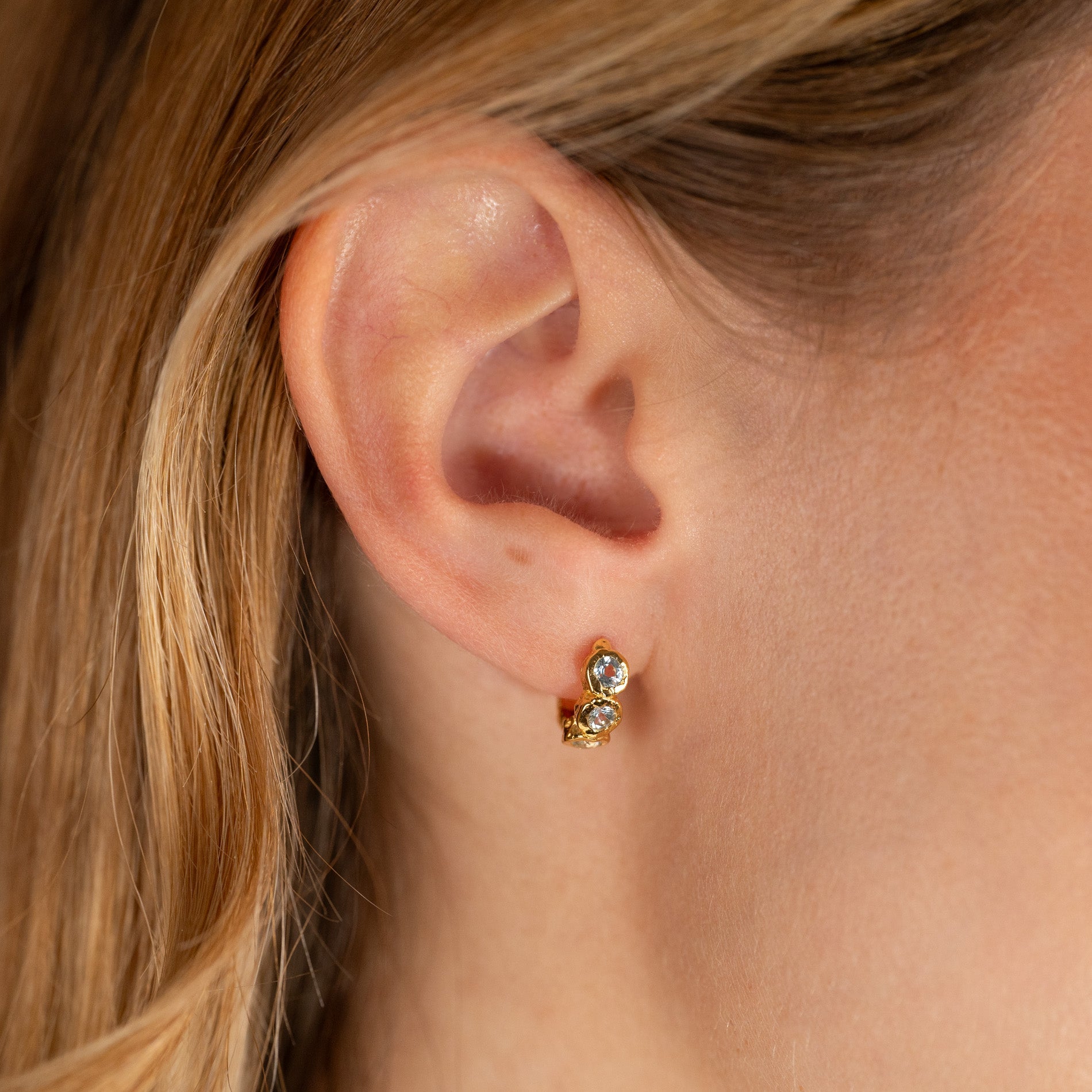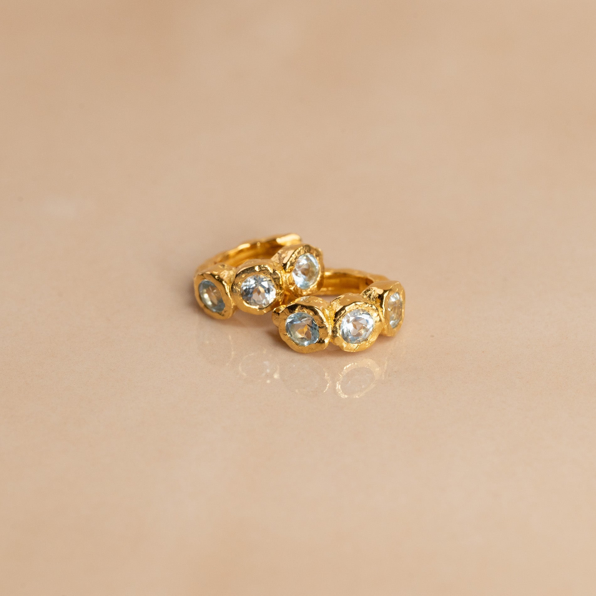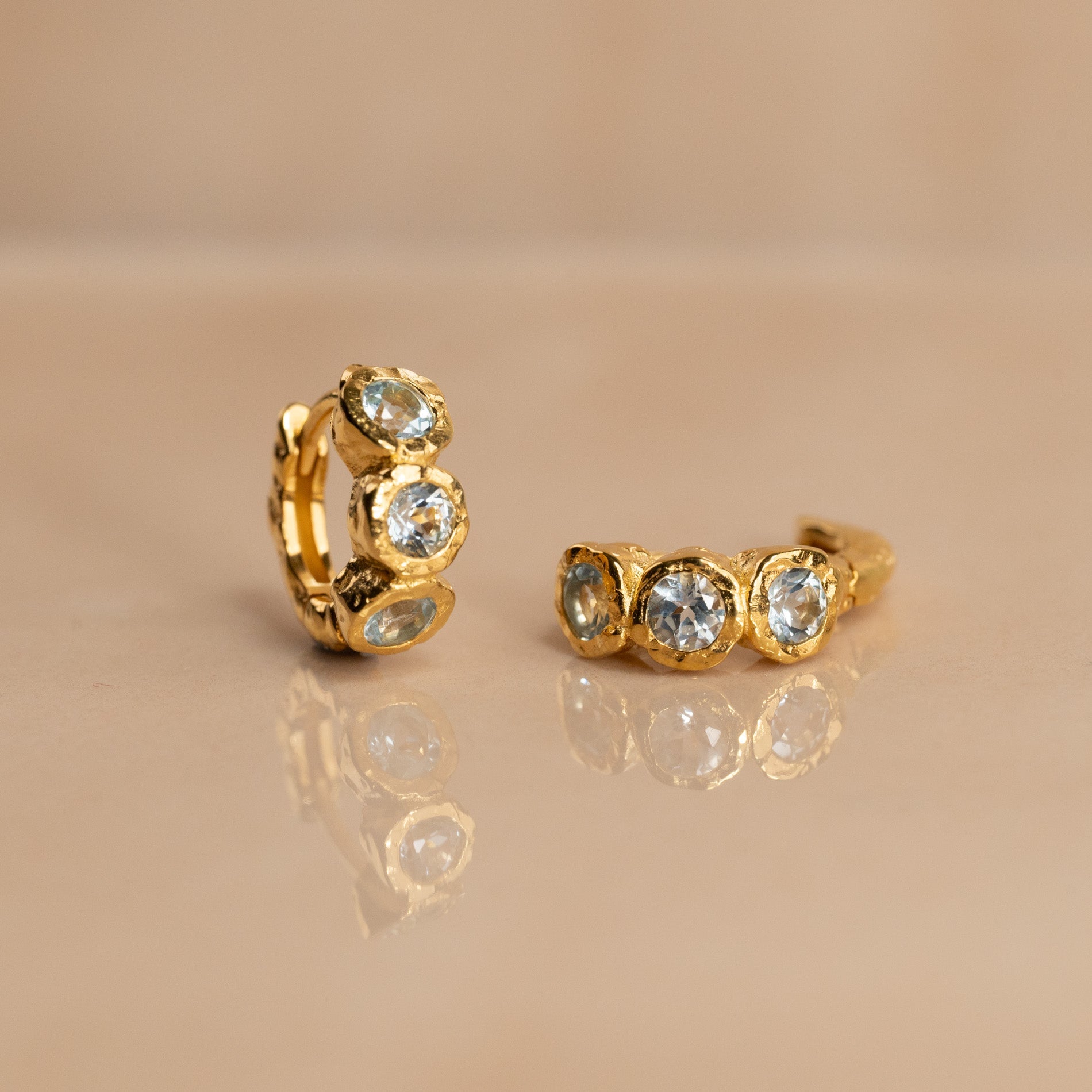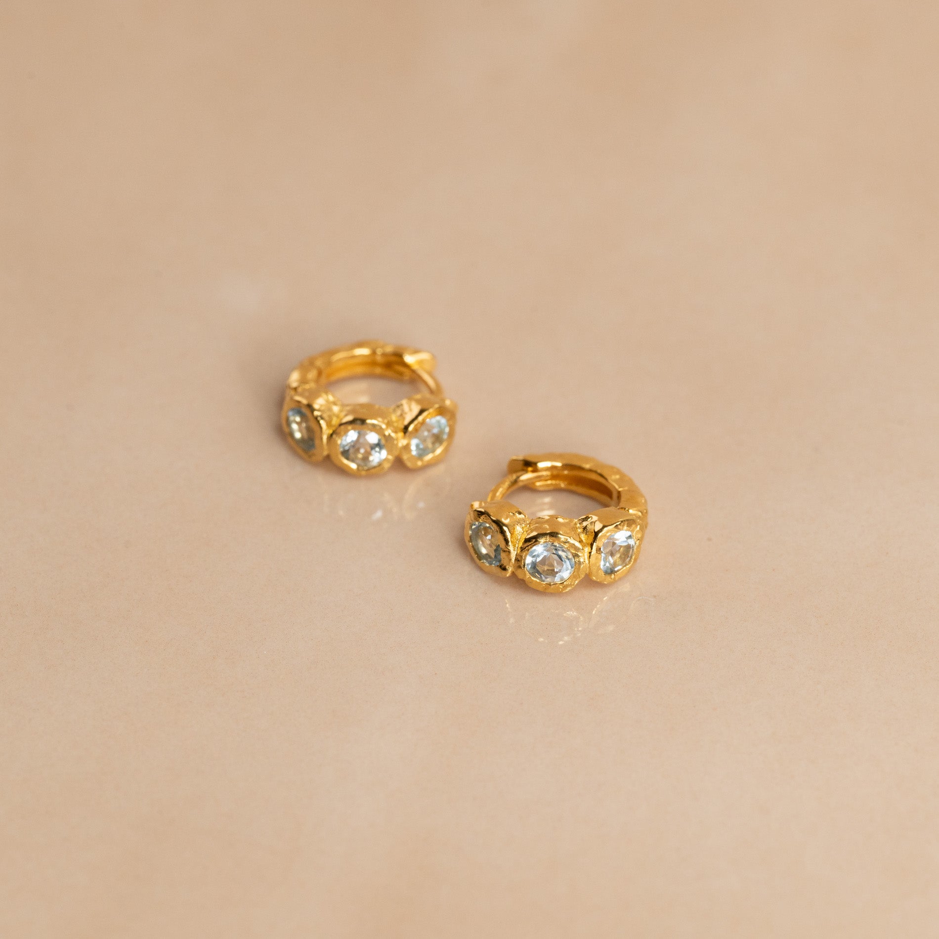 Raw huggies with three faceted blue topaz stones in gold-plated silver