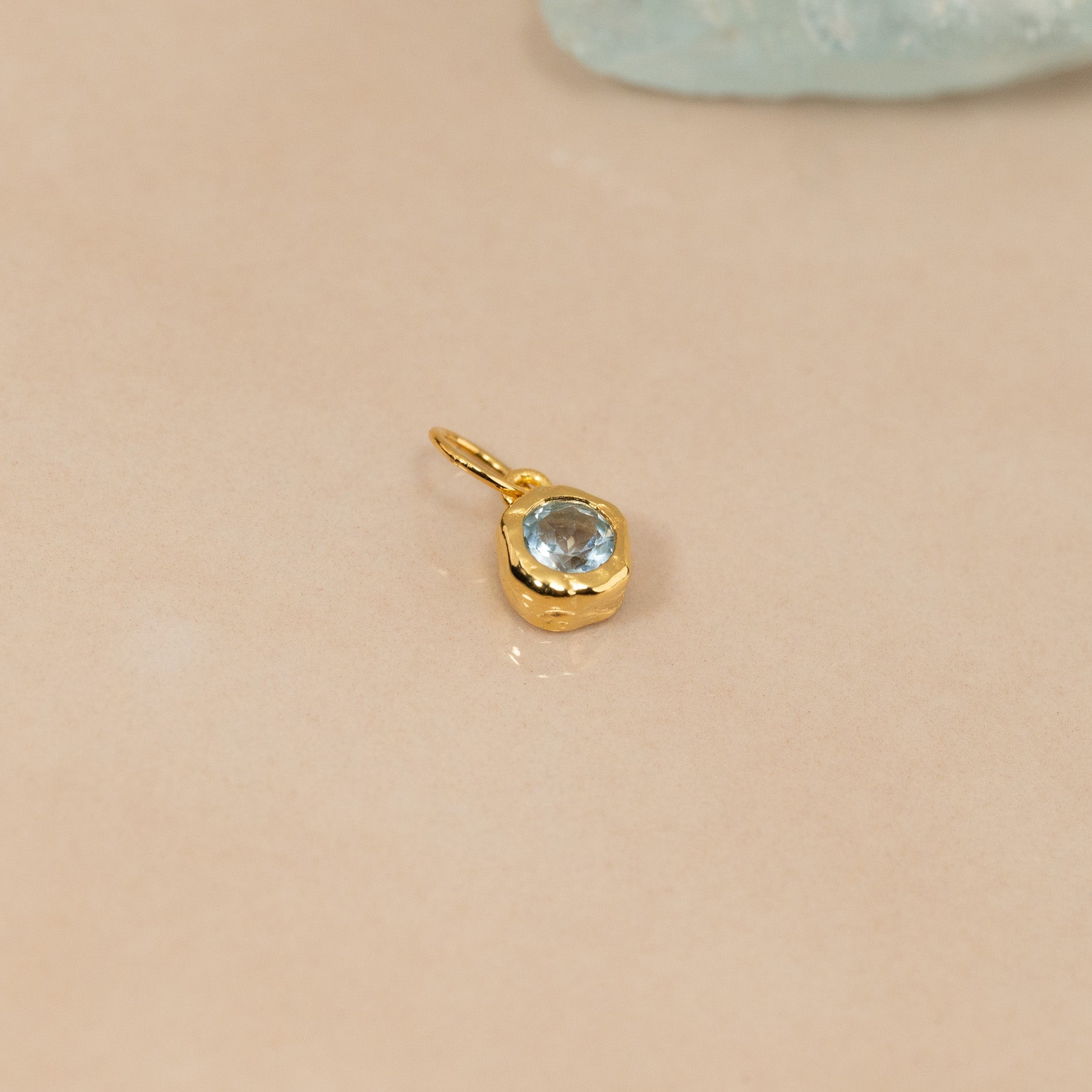 Raw pendant with a round faceted blue topaz in gold-plated silver