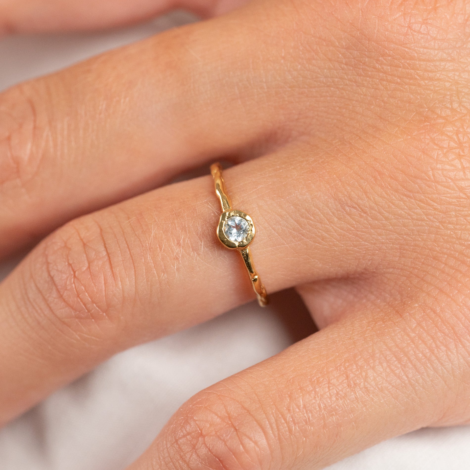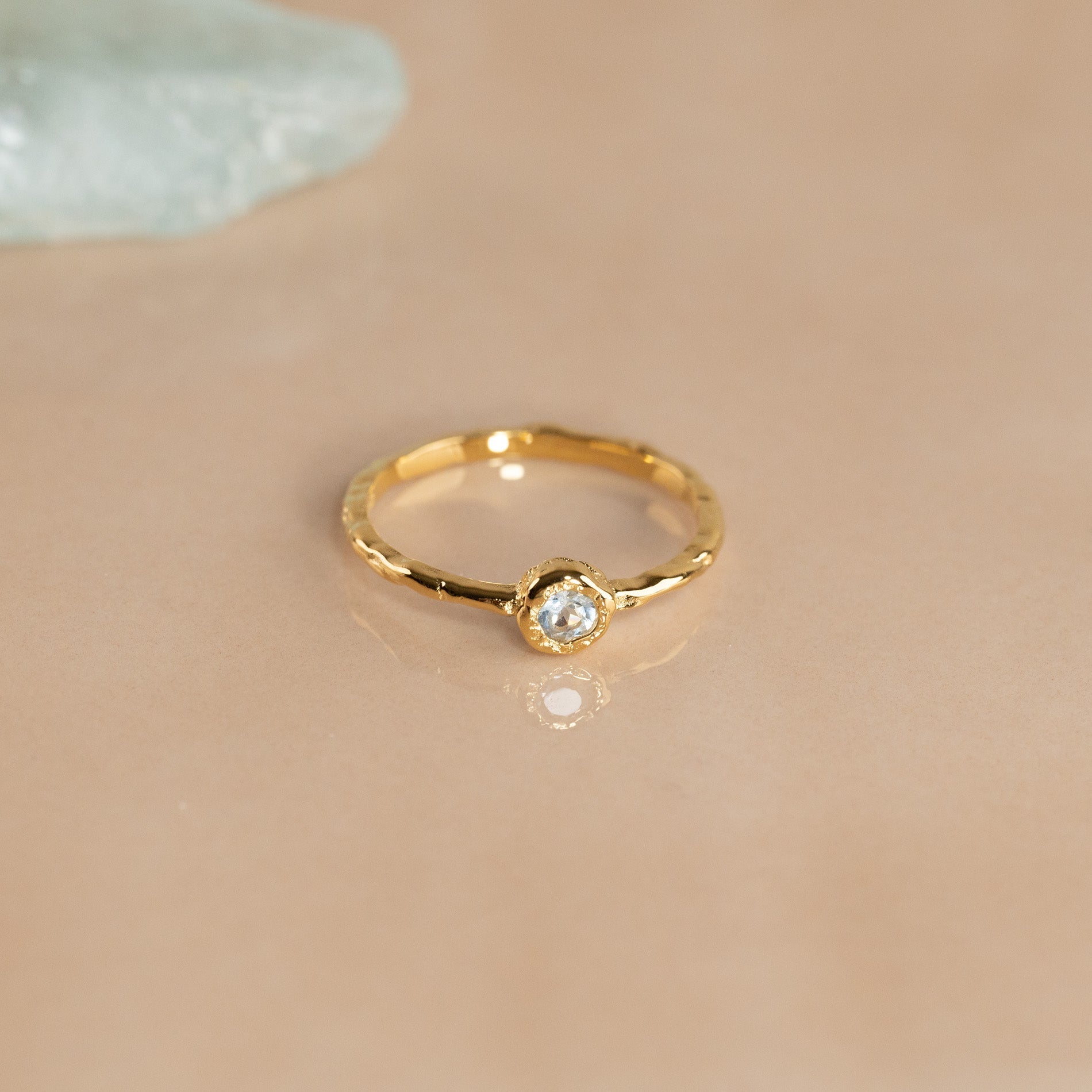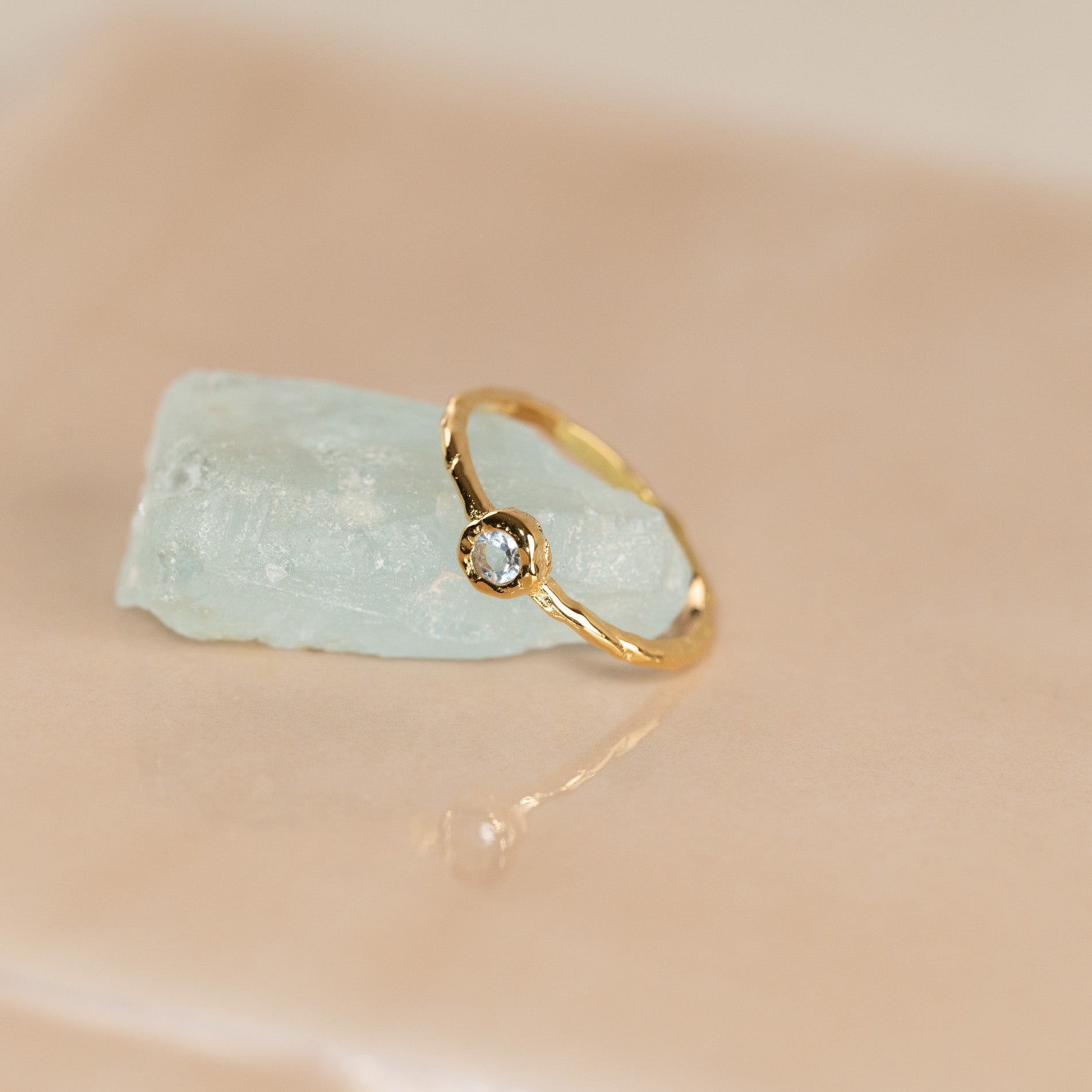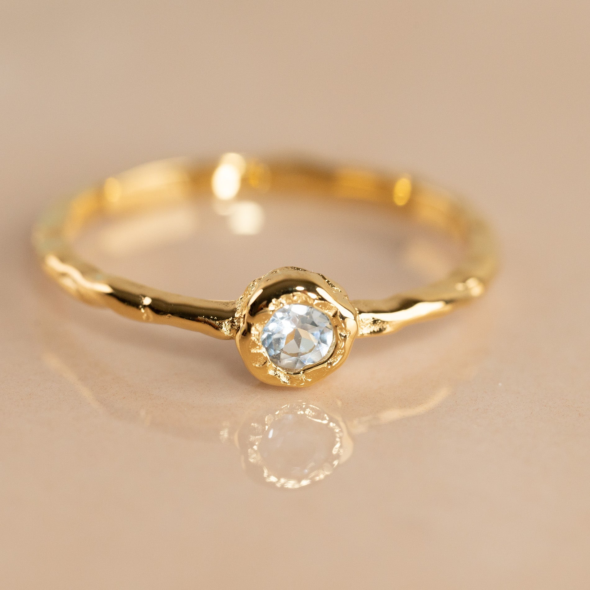 Ring in 100% recycled 18 karat gold-plated 925 sterling silver with round faceted blue topaz.