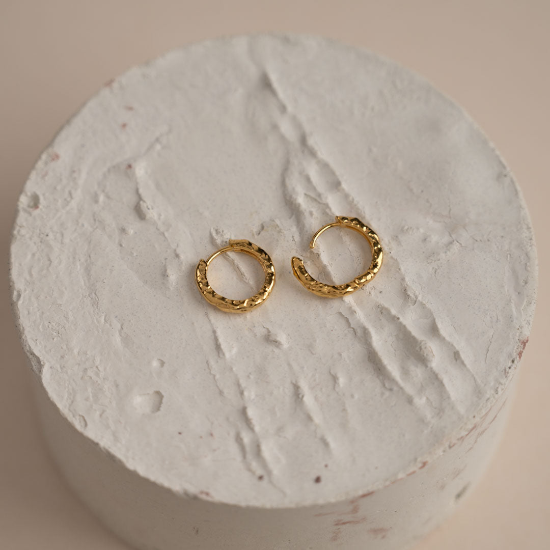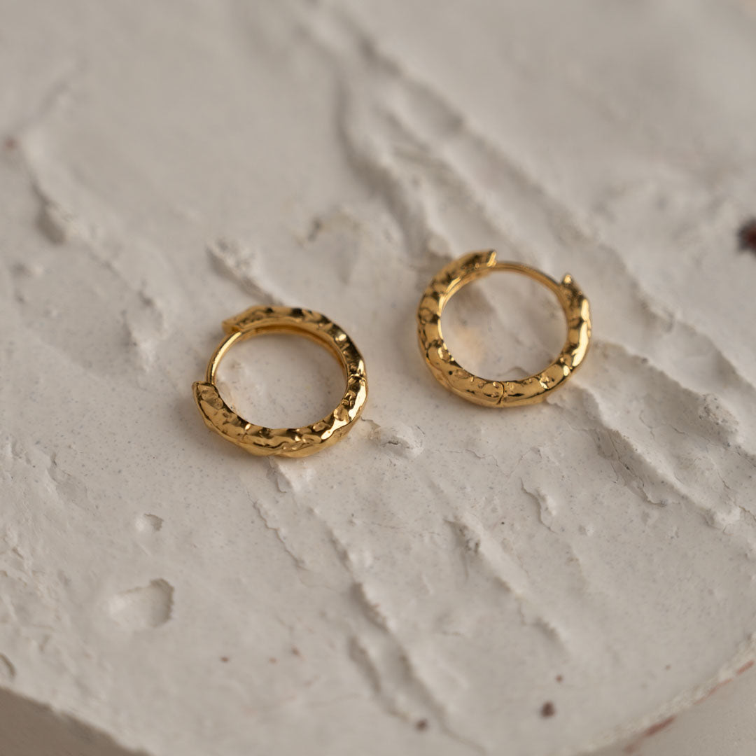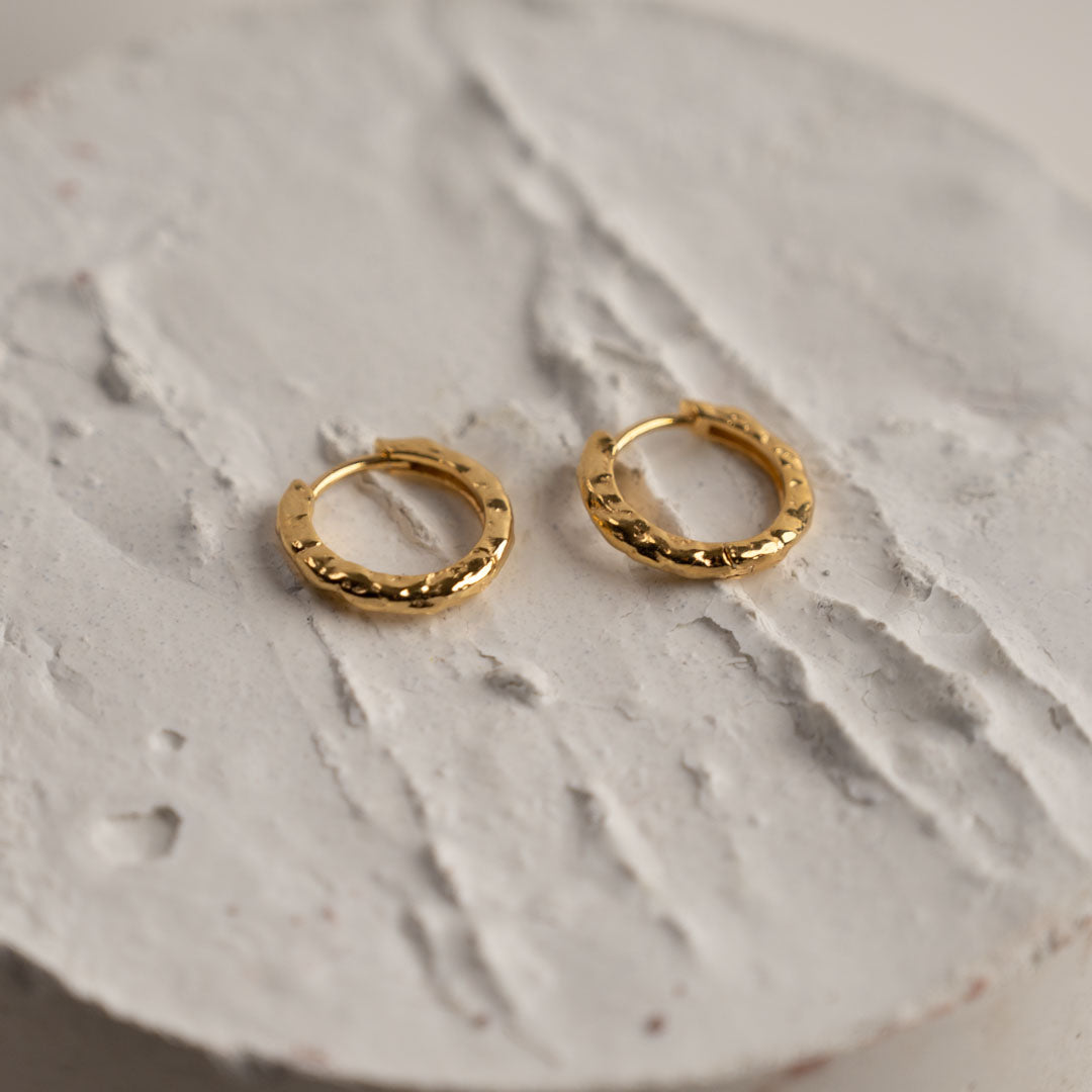 Our Selina creoles are made in 100% recycled 18-carat gold-plated sterling silver. The small pretty creoles close with hinge. The structured surface of the earrings is inspired by liquid metal, in order to create a pattern that is vibrant and raw.