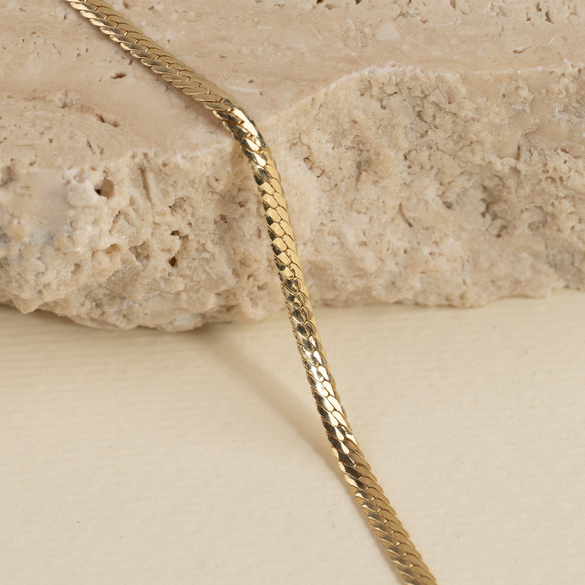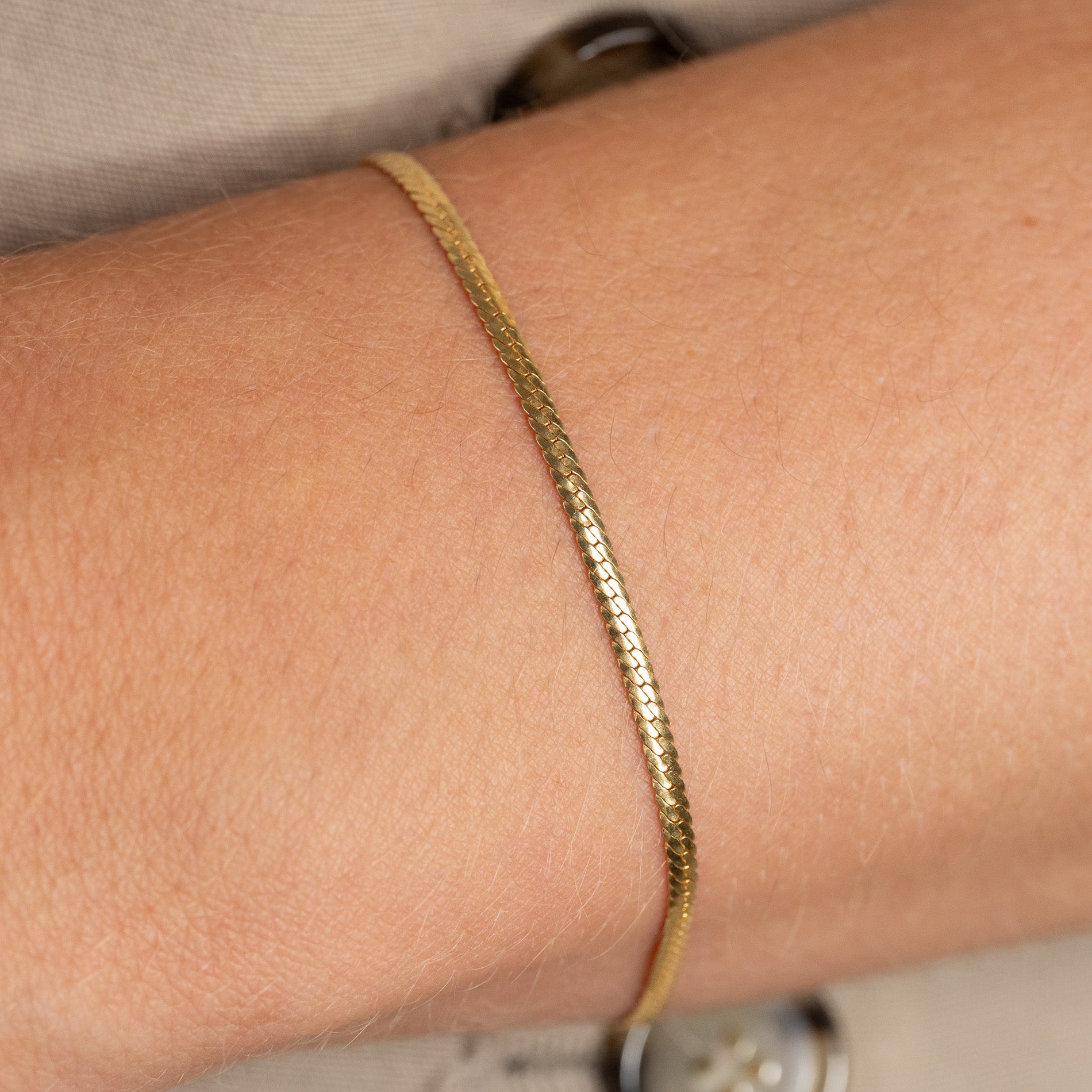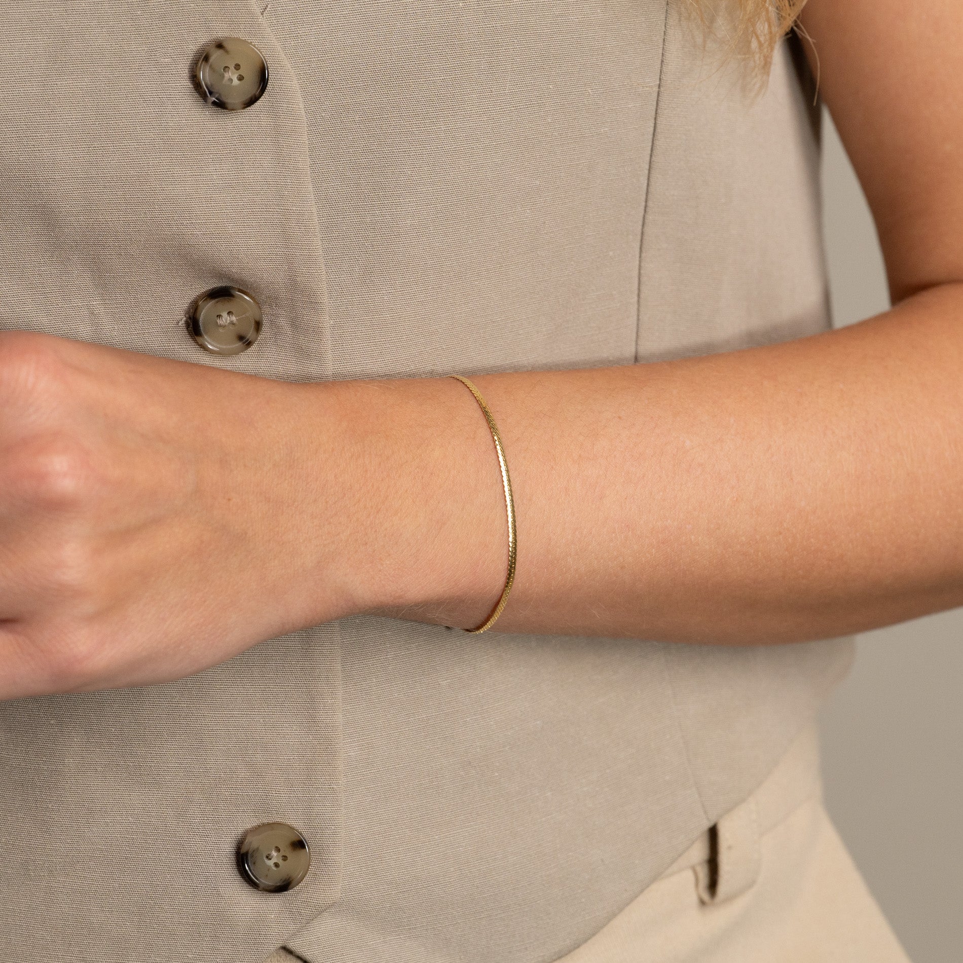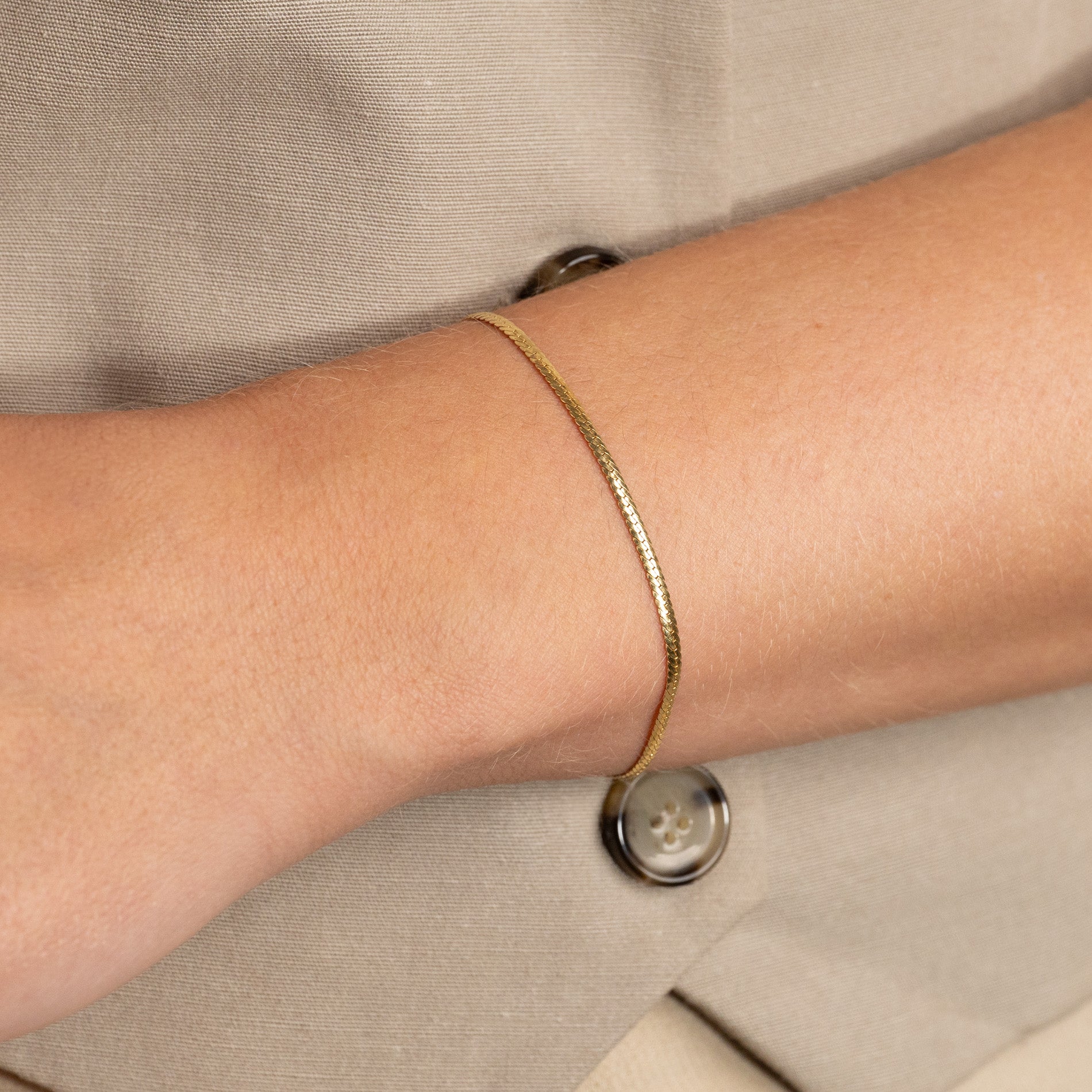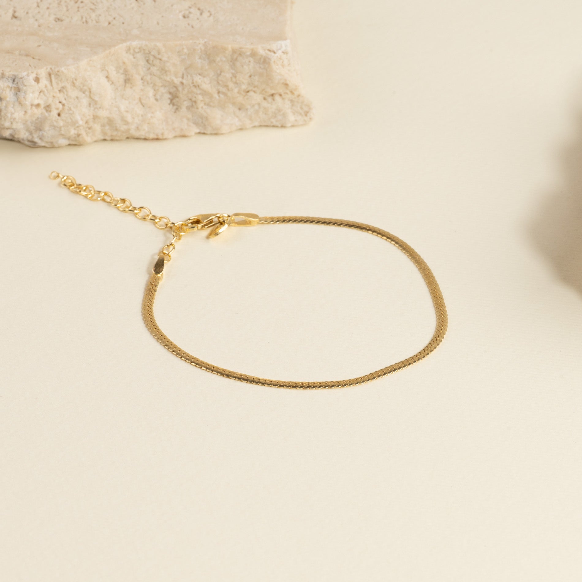 The bracelet is made from 100% recycled 18-karat gold-plated 925 sterling silver and has a flat herringbone pattern that creates a shiny and elegant surface.