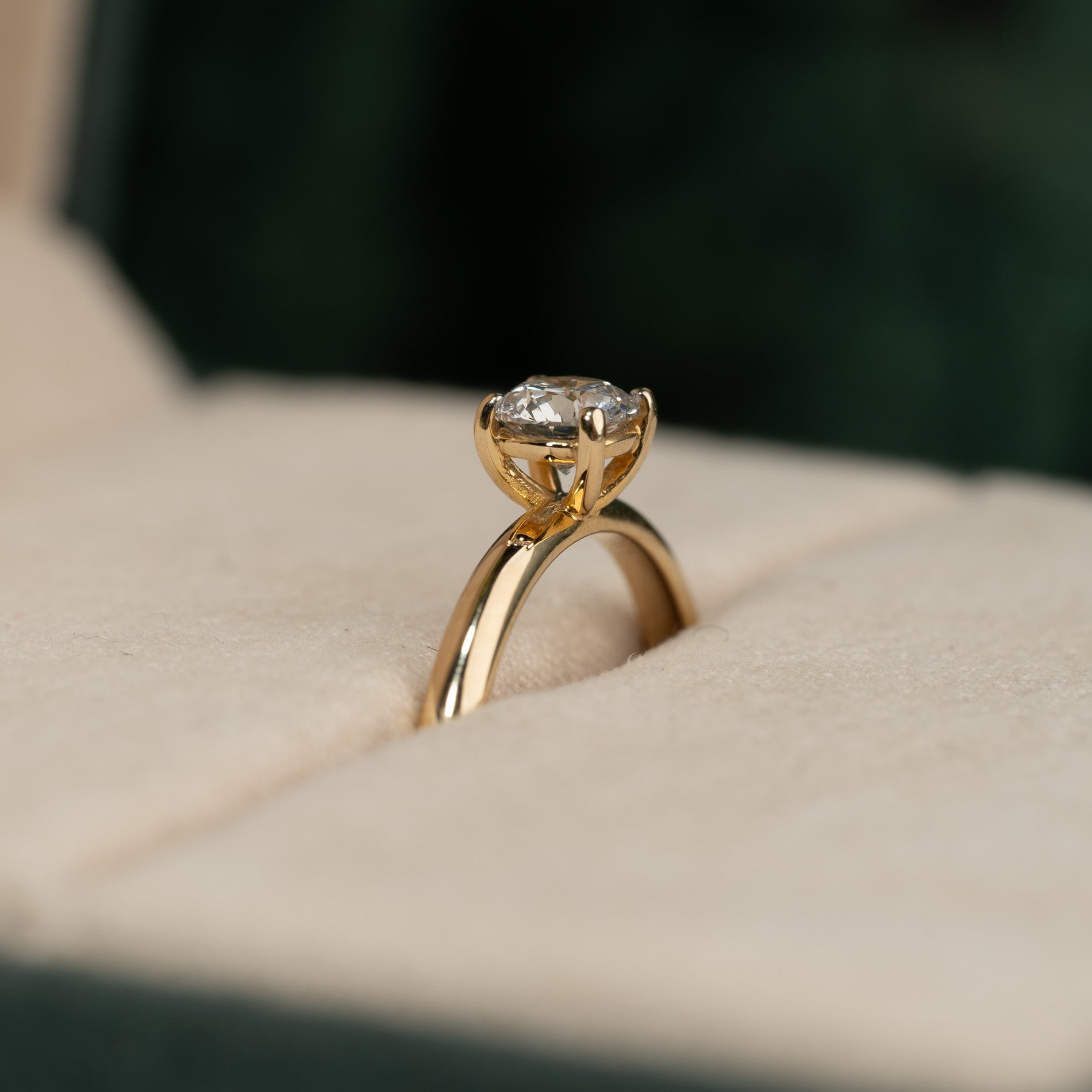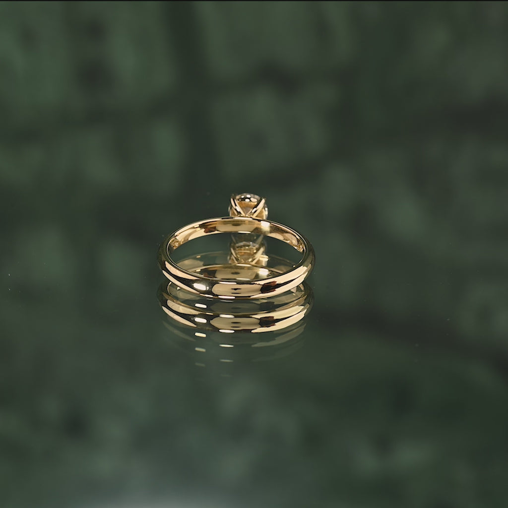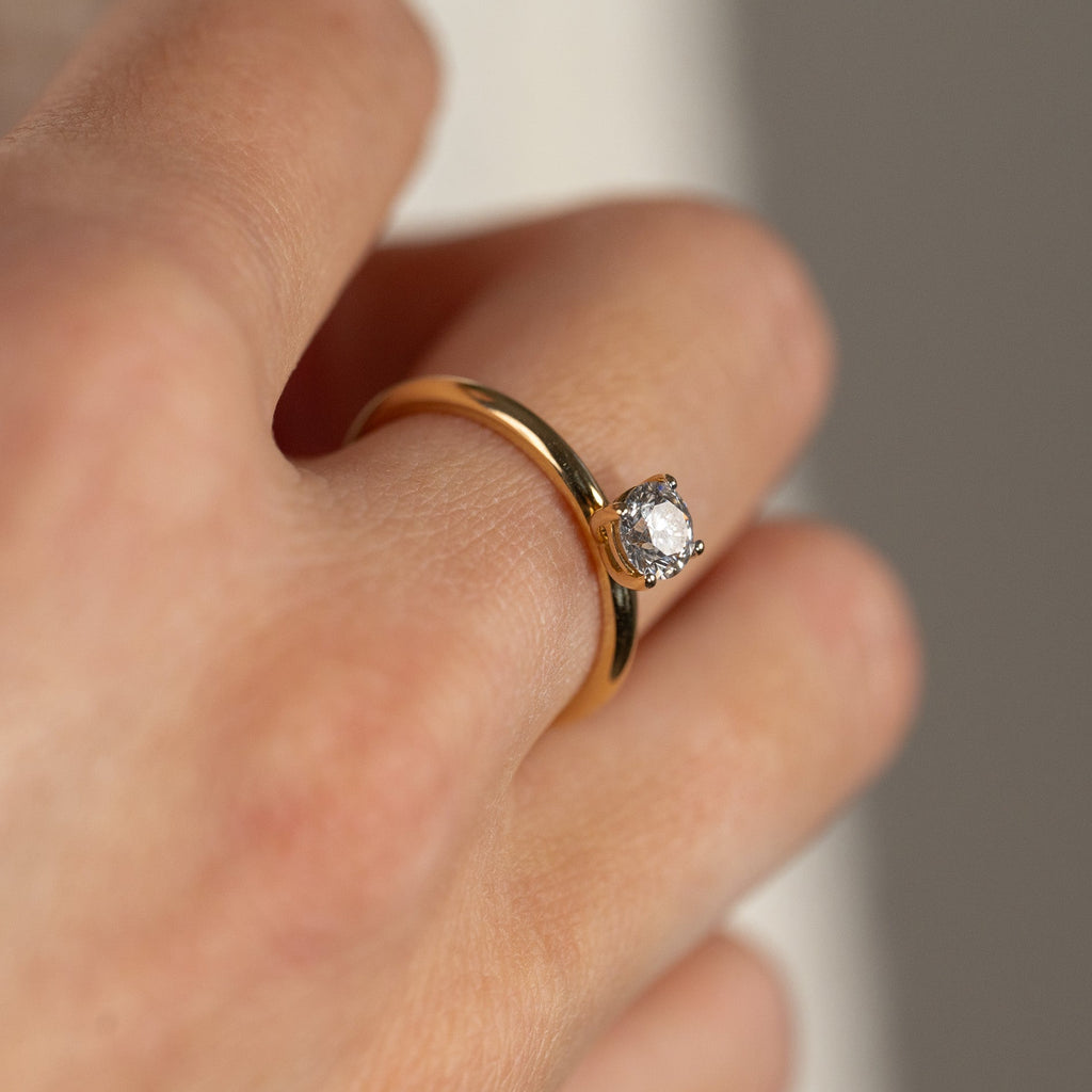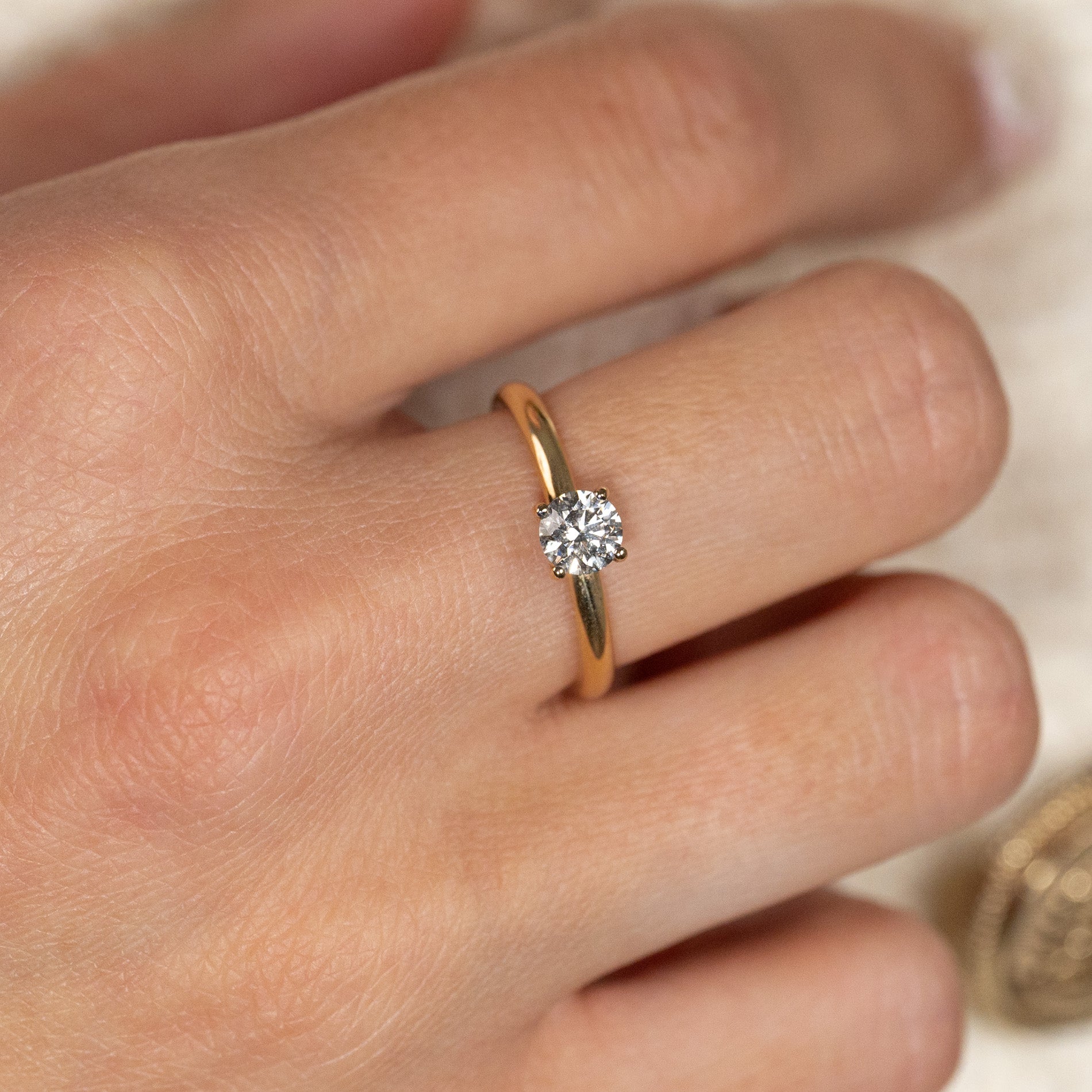 Our solitaire ring features a single diamond. The 0.5 ct. brilliant-cut lab-grown diamond is set in a classic basket setting, beautifully elevated above the minimalist band. This ring is an elegant and timeless piece of jewelry, perfect as a gift for someone you love or as a classic engagement ring.