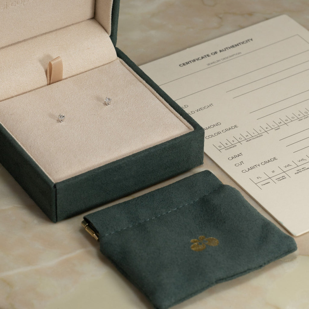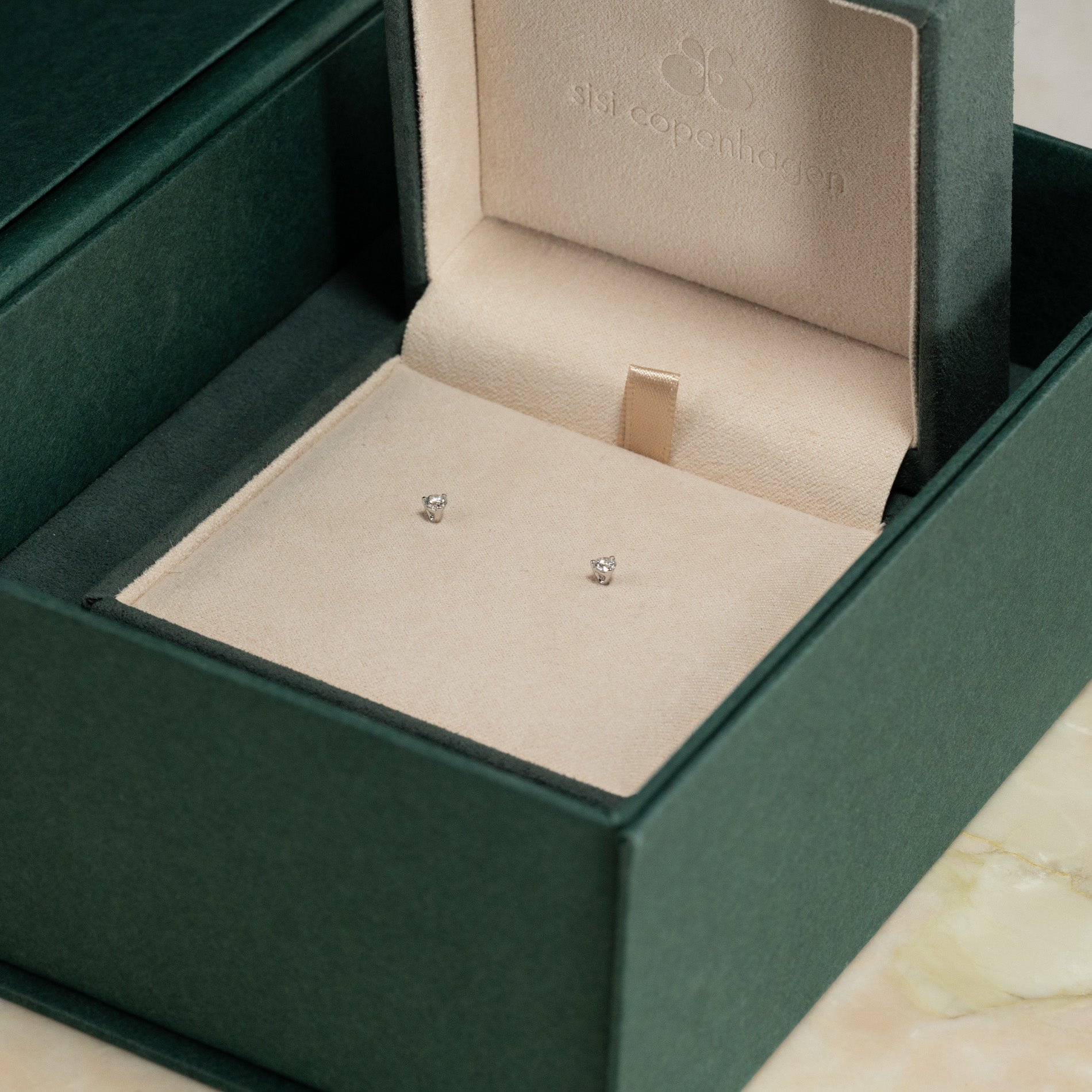 The stud earrings come in our exclusive Diamond Collection box with a beautiful jewelry box, certificate and pouch. The box is also perfect if you want to give the jewelry as a gift.