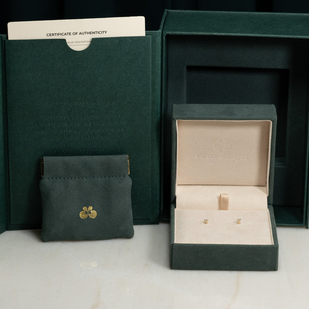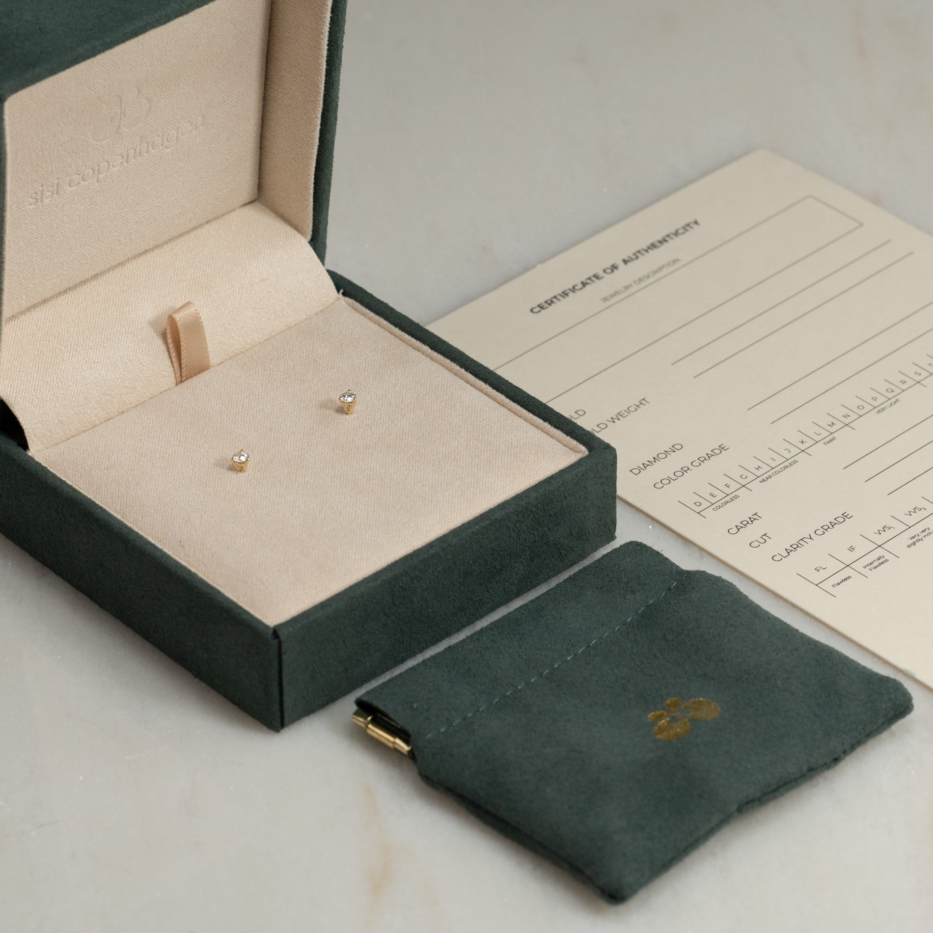 The stud earrings come in our exclusive Diamond Collection box with a beautiful jewelry box, certificate and pouch. The box is also perfect if you want to give the jewelry as a gift.