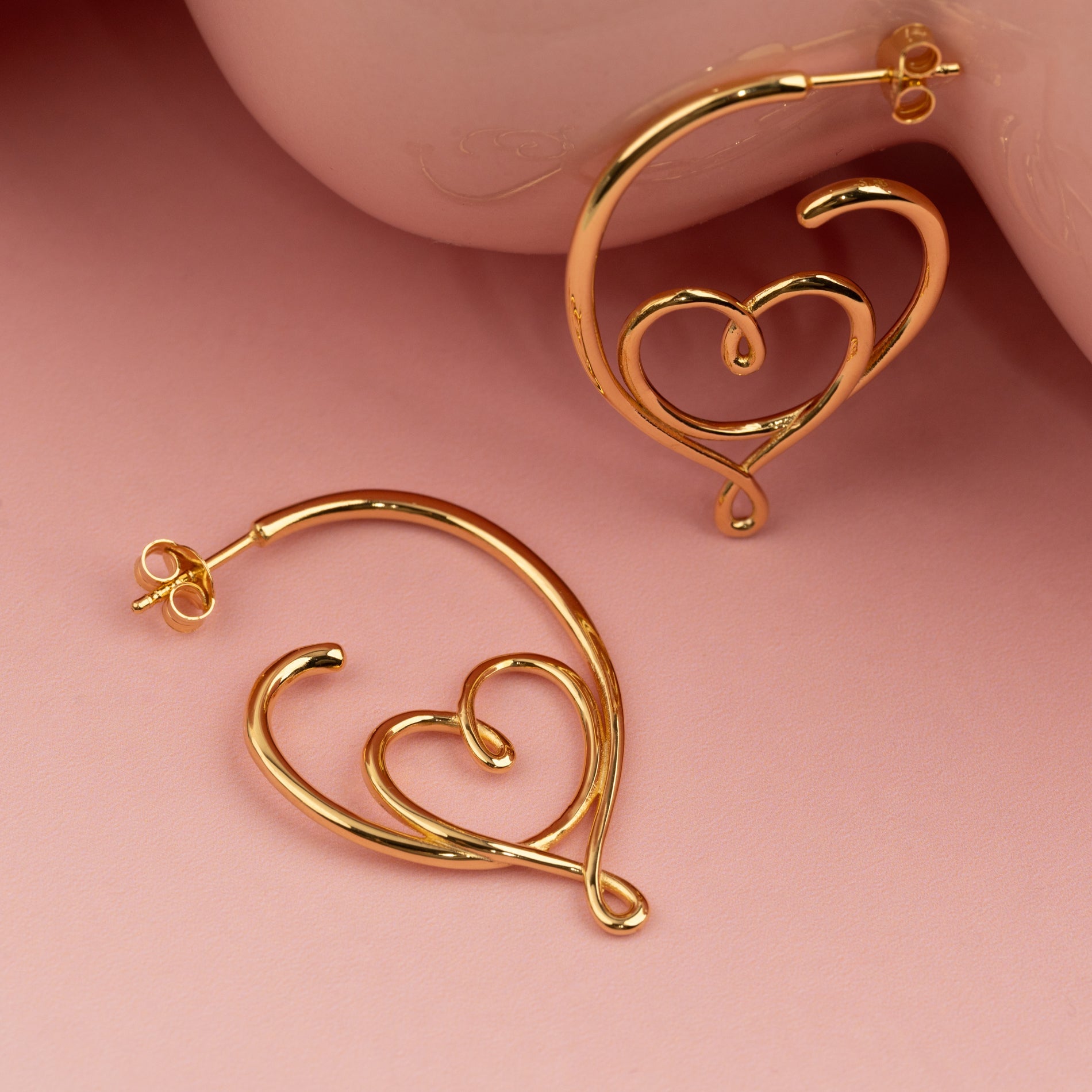 Elegant heart-shaped hoop earrings made of 100% recycled 18kt. gold-plated sterling silver.