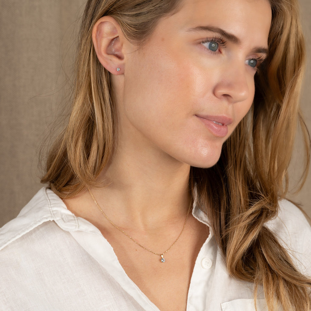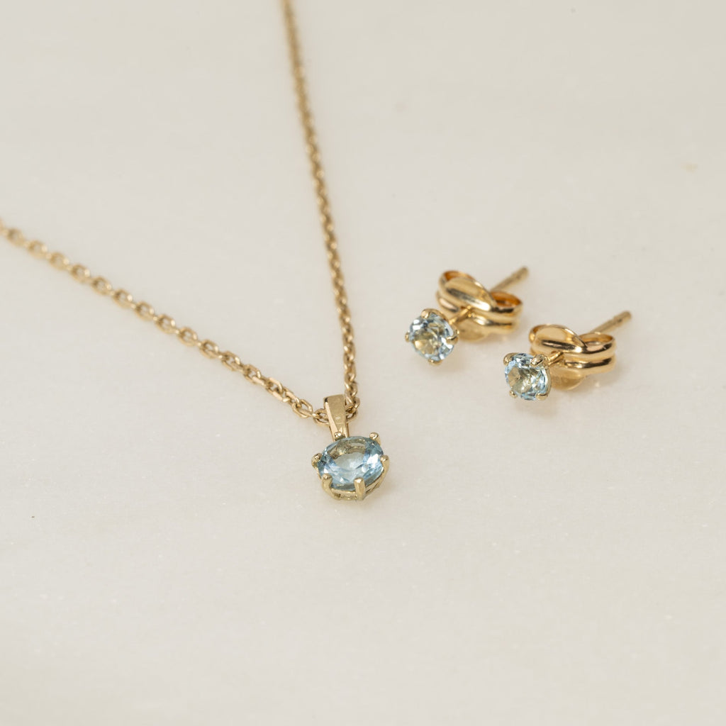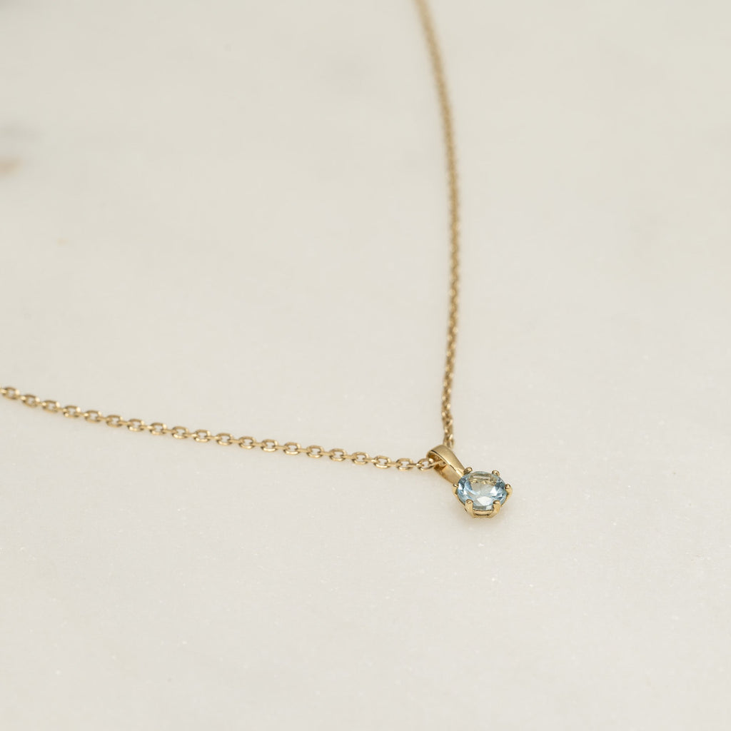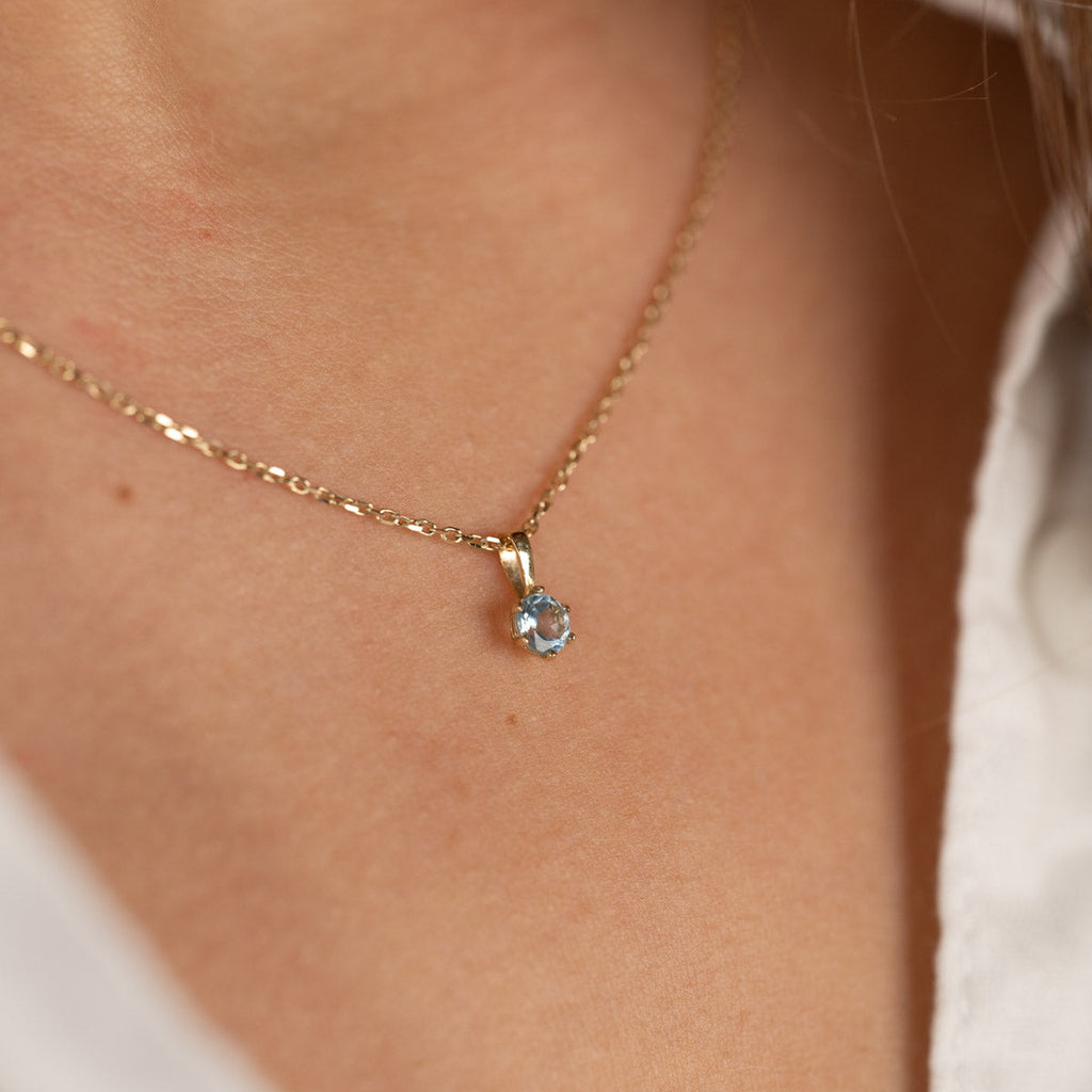 This pendant is made of 100% recycled 9 karat solid gold with a beautiful blue topaz semi-precious stone. The pendant is elegant, feminine, and simple in design.