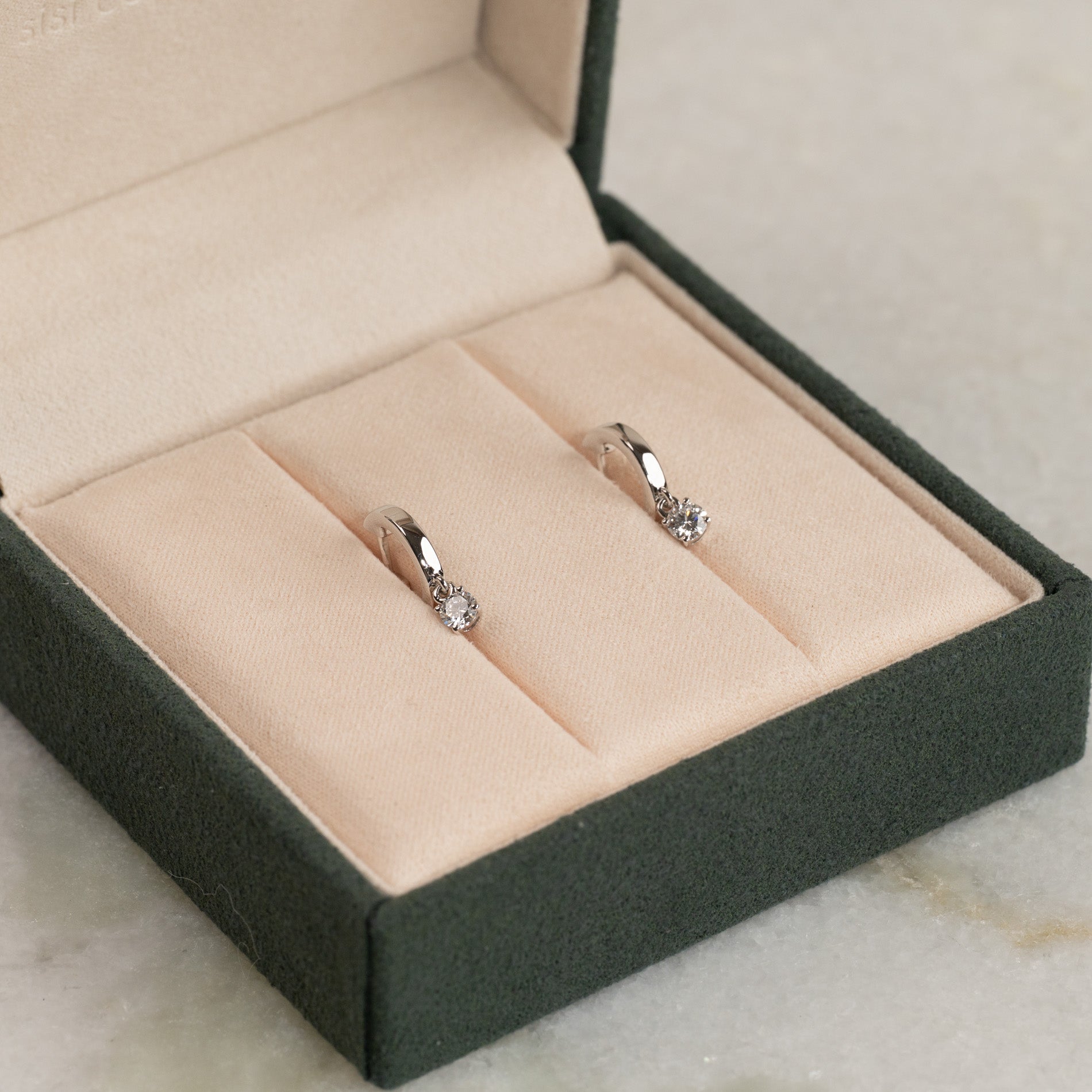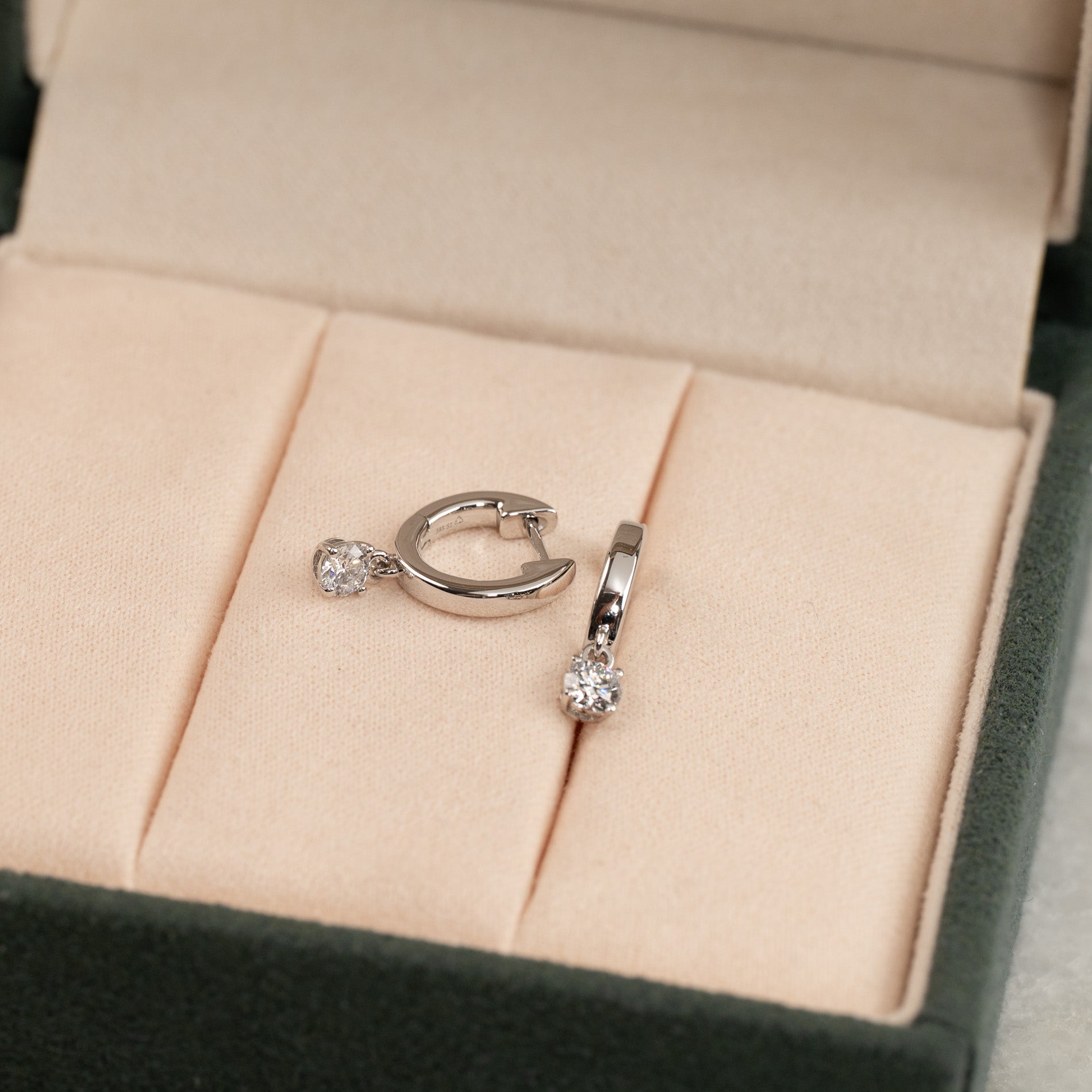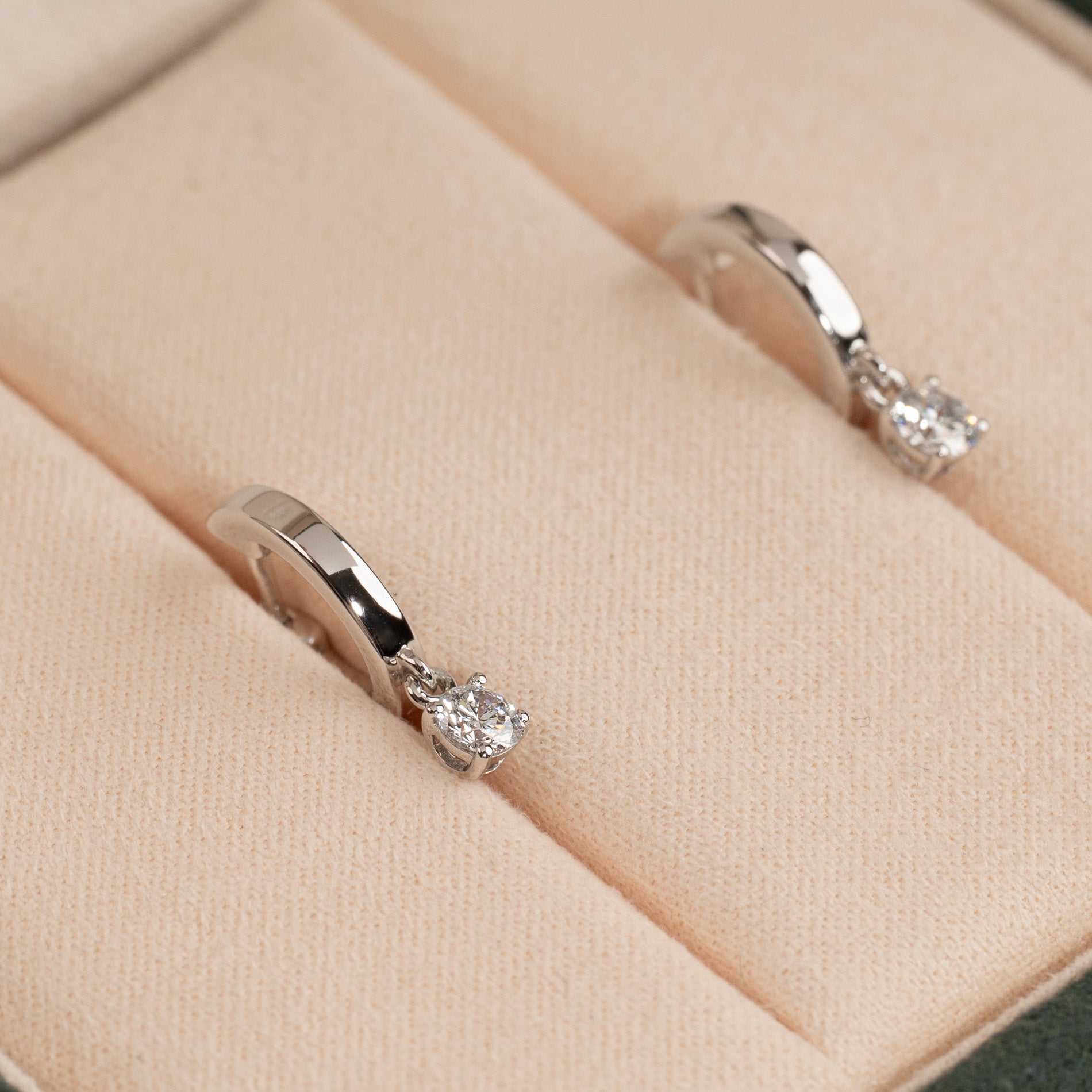 Crafted in solid 14 karat white gold, these elegant hoops each have a lab-grown diamond that hangs gracefully beneath the hoop, creating beautiful movement and sparkle. The modern yet classic design makes them perfect for both everyday wear and special occasions.