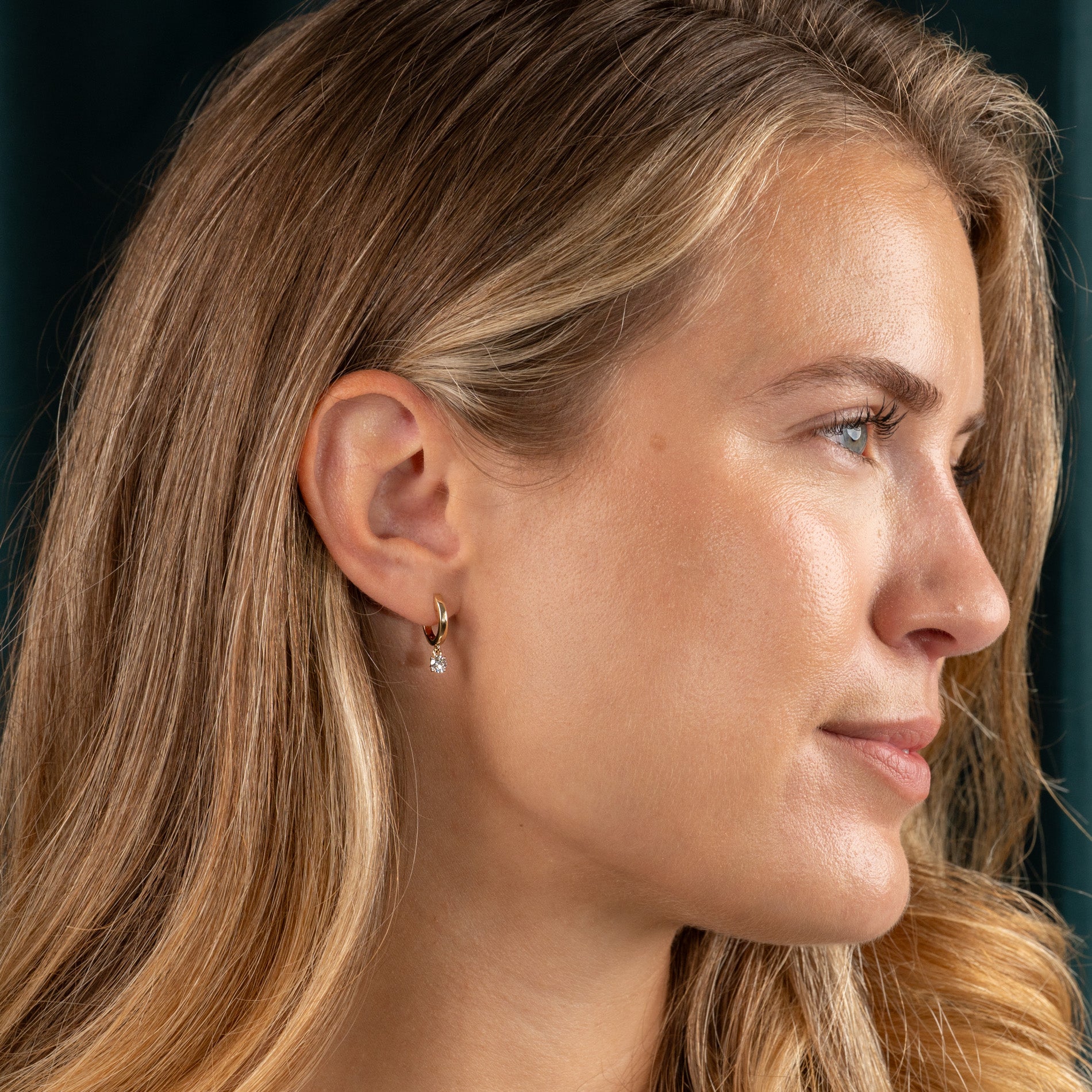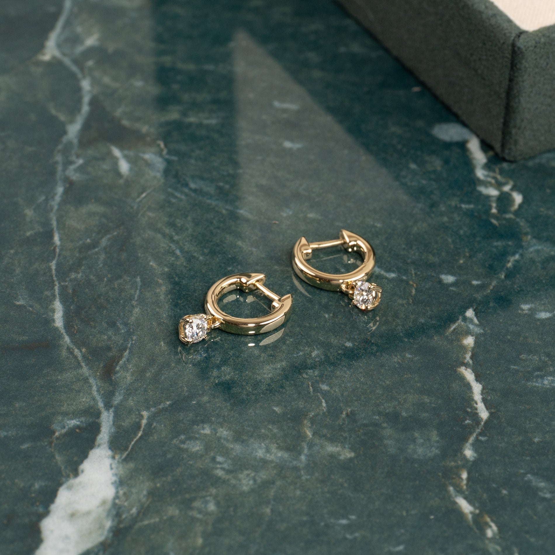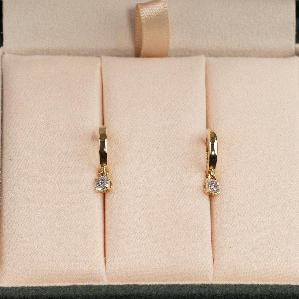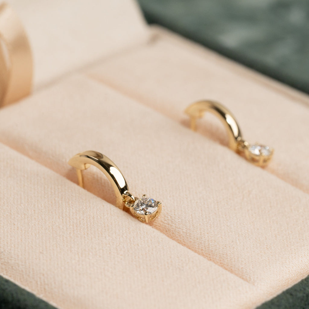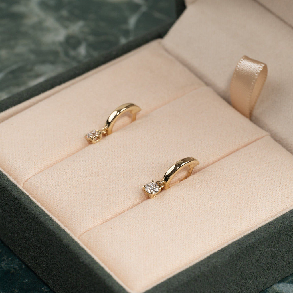 Crafted in solid 14 karat gold, these elegant hoops each have a lab-grown diamond that hangs gracefully beneath the hoop, creating beautiful movement and sparkle. The modern yet classic design makes them perfect for both everyday wear and special occasions.