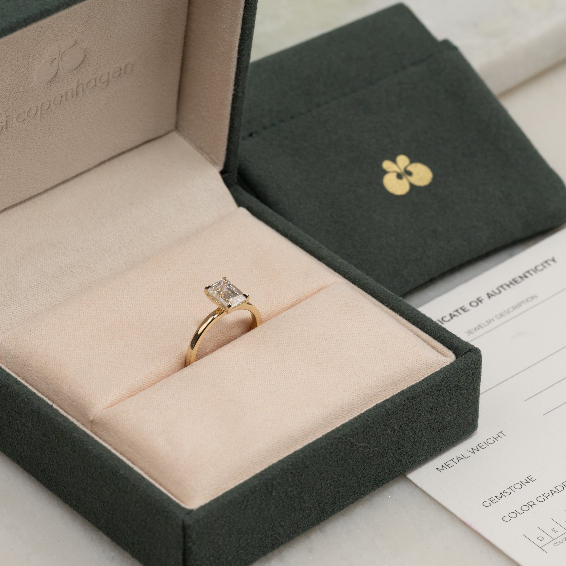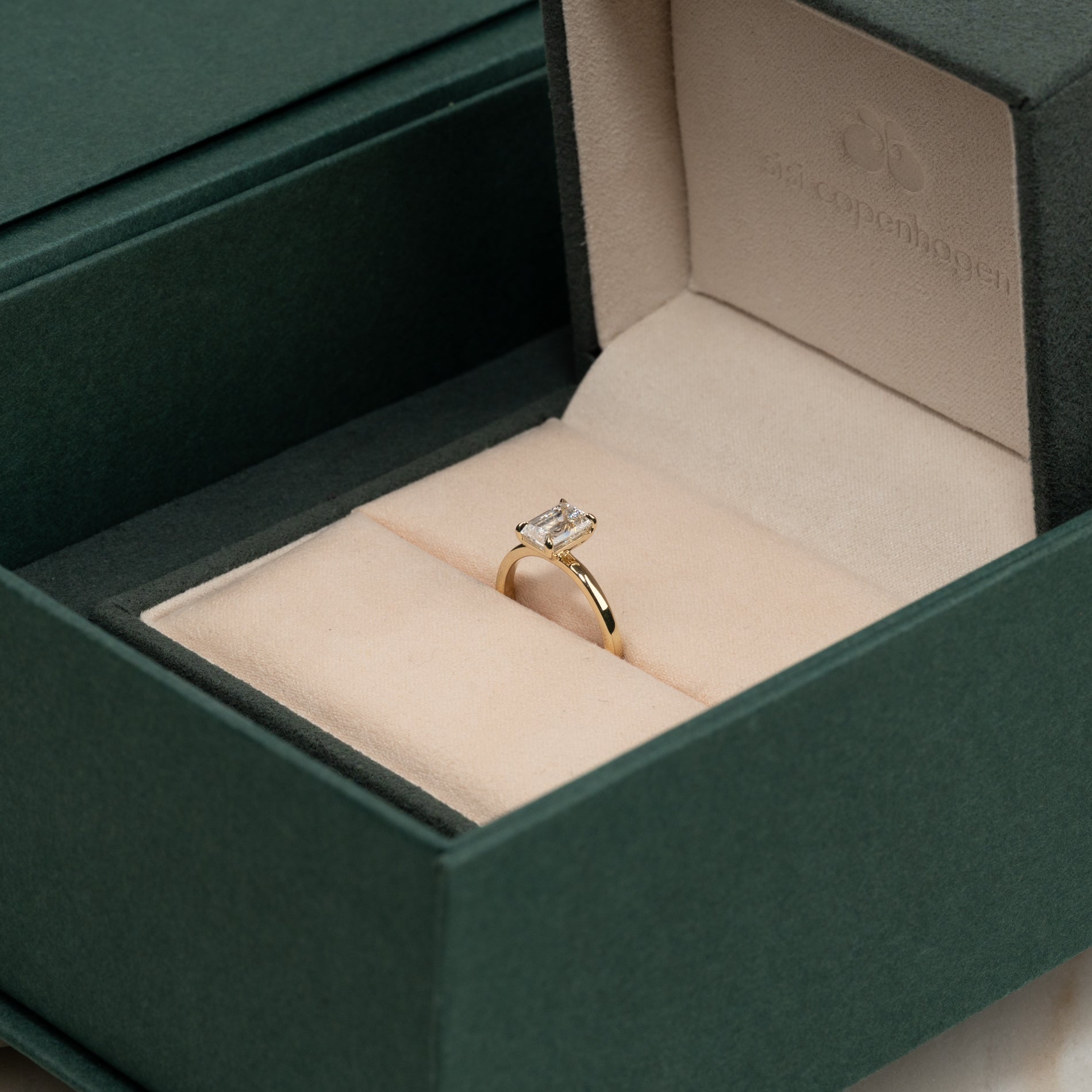 Timeless ring in 14 kt. gold with a 1.5 ct. emerald-cut lab-grown diamond. The diamond is elegantly set in a slightly elevated basket setting, enhancing its clear, mirror-like brilliance and the step-cut facets.