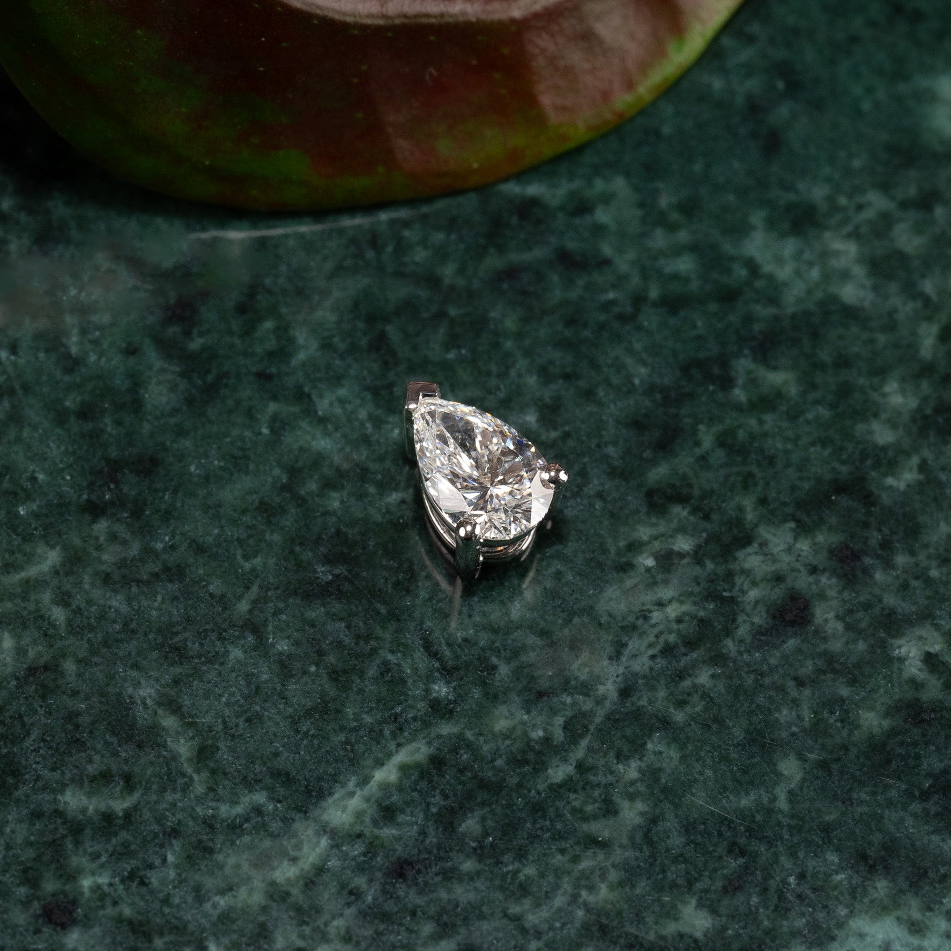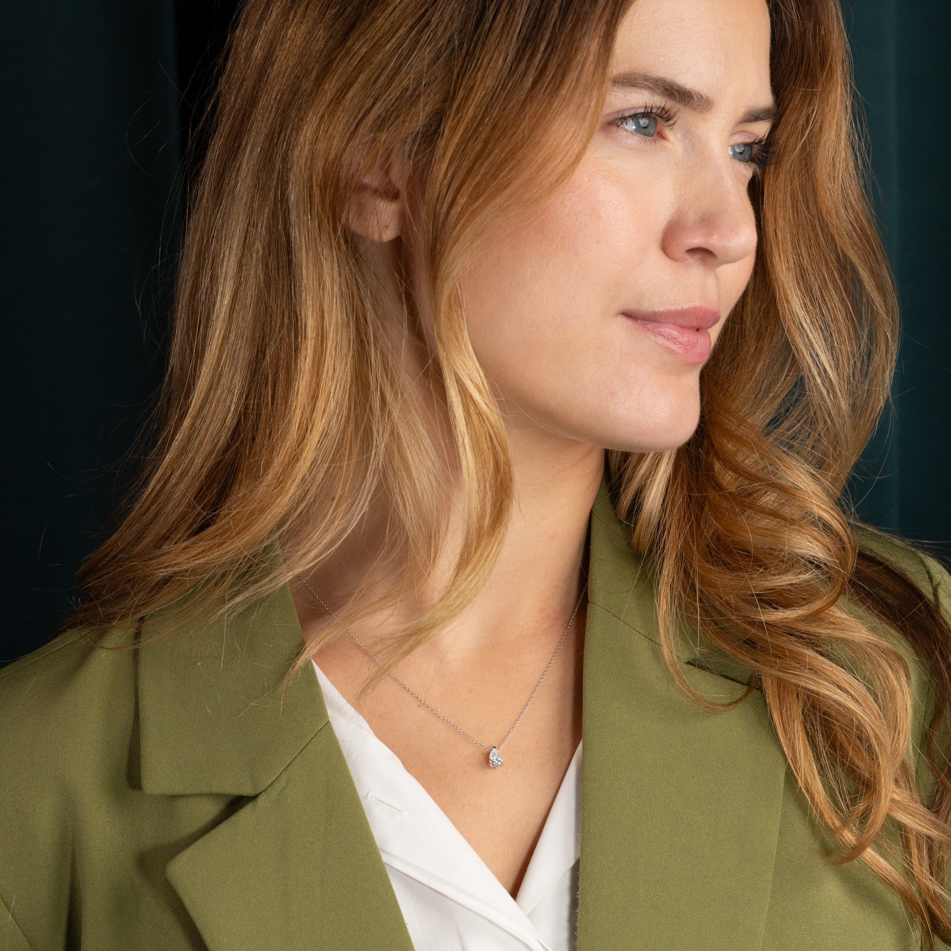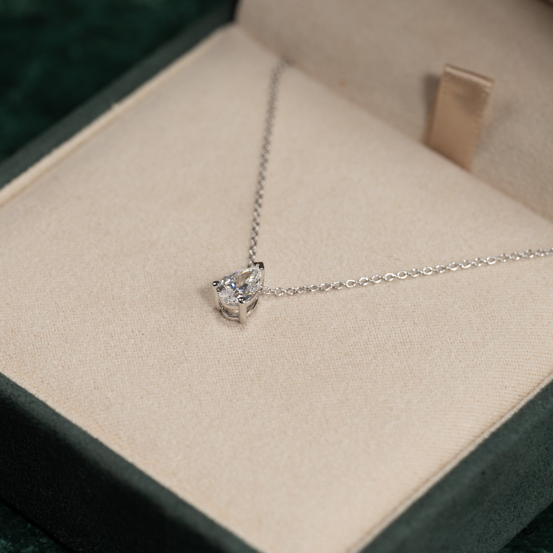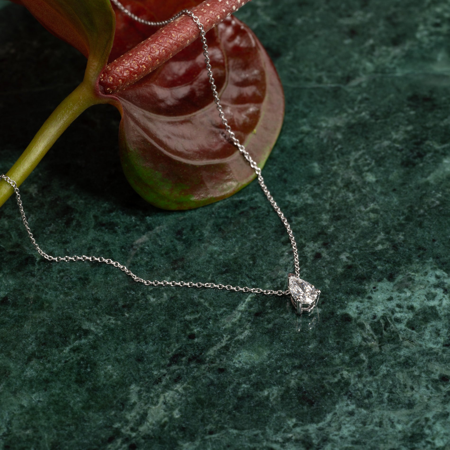 Diamond pendant with 0.65 ct. pear-cut lab-grown diamond and 14 karat white gold.