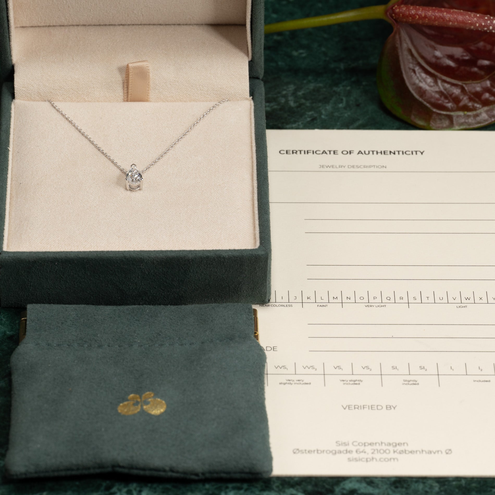 The pendant is made in 14 karat white gold with a lab-grown diamond weighing 0.65 ct, color E-F (River) and clarity VVS. The jewelry is created with care; the diamonds are made with solar energy and the gold is 100% certified recycled.
