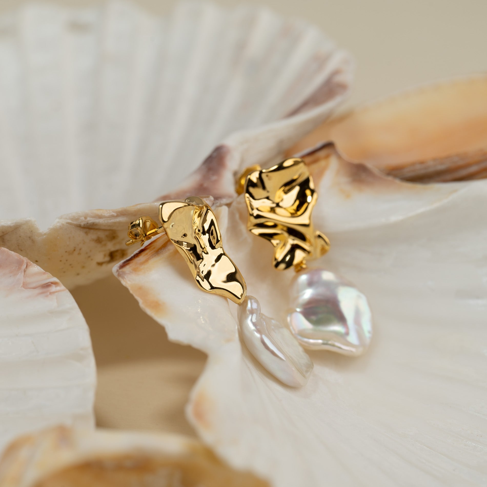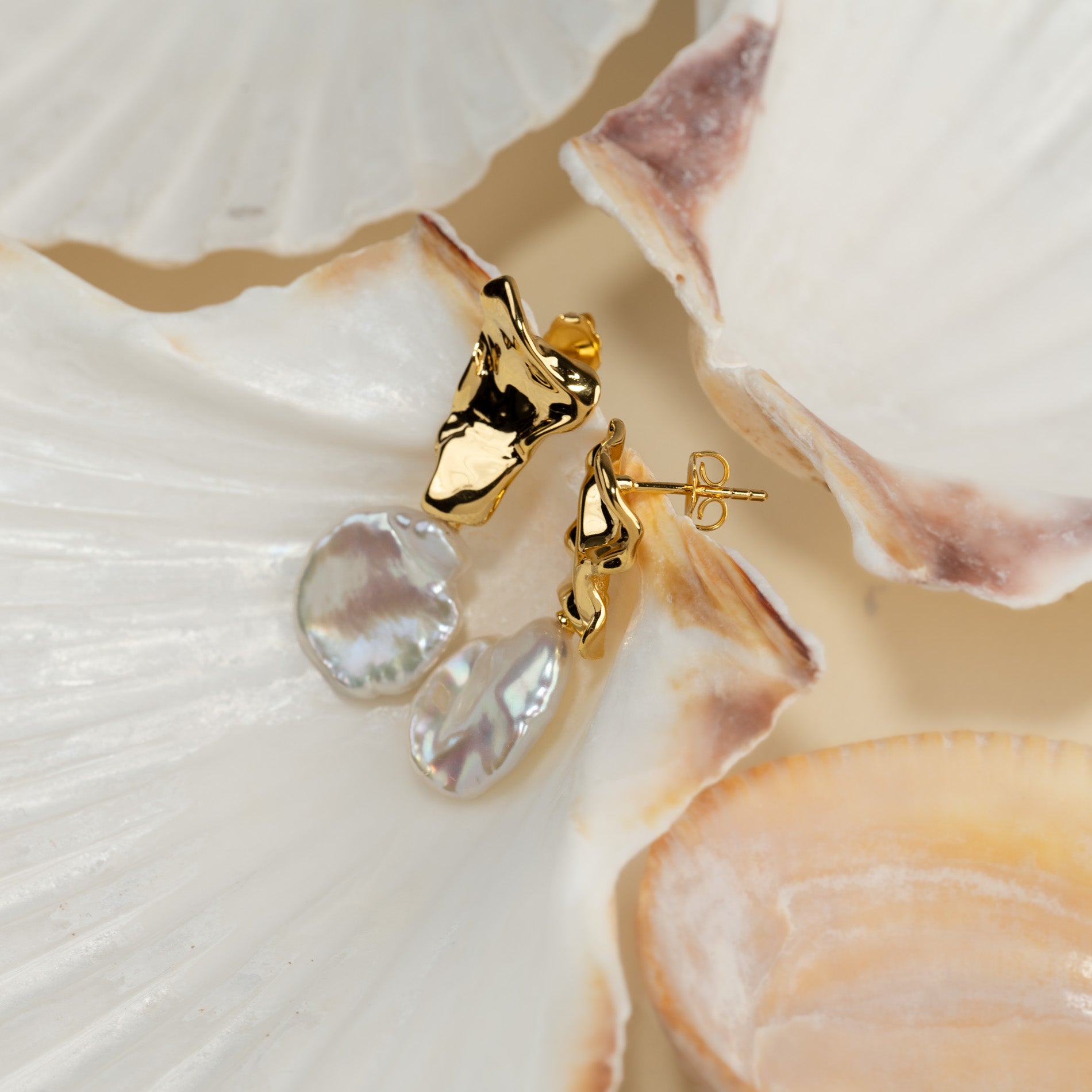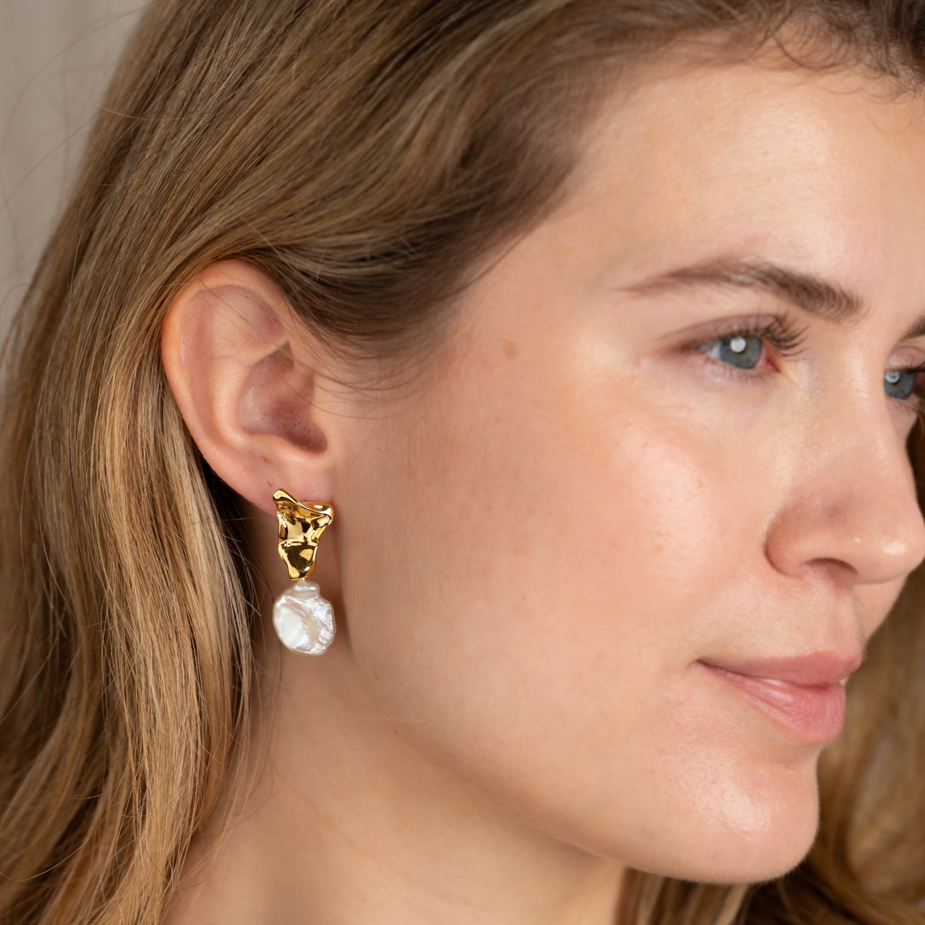 The Thora earrings are made from 100% recycled 18 karat gold-plated sterling silver with a beautiful keshi freshwater pearl.