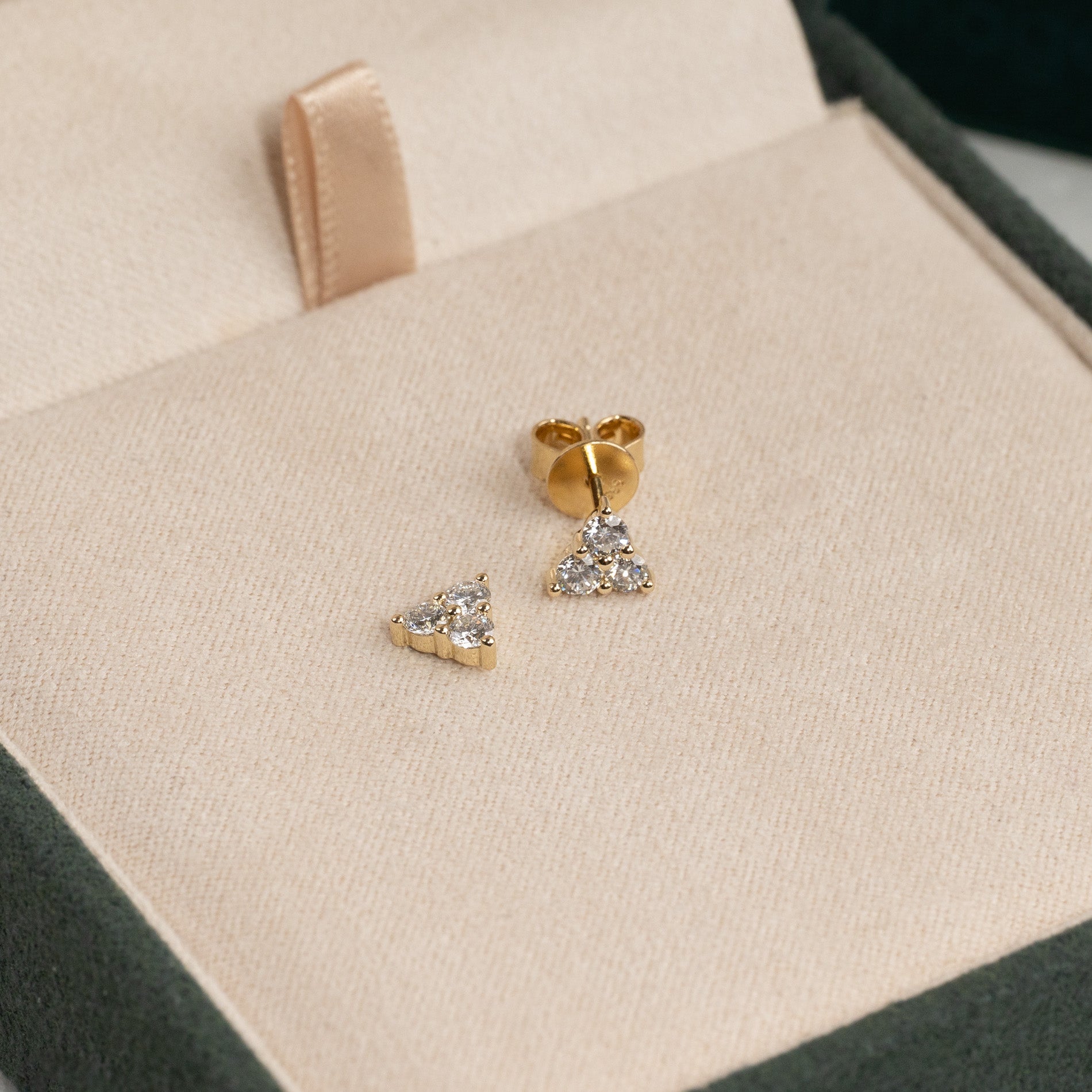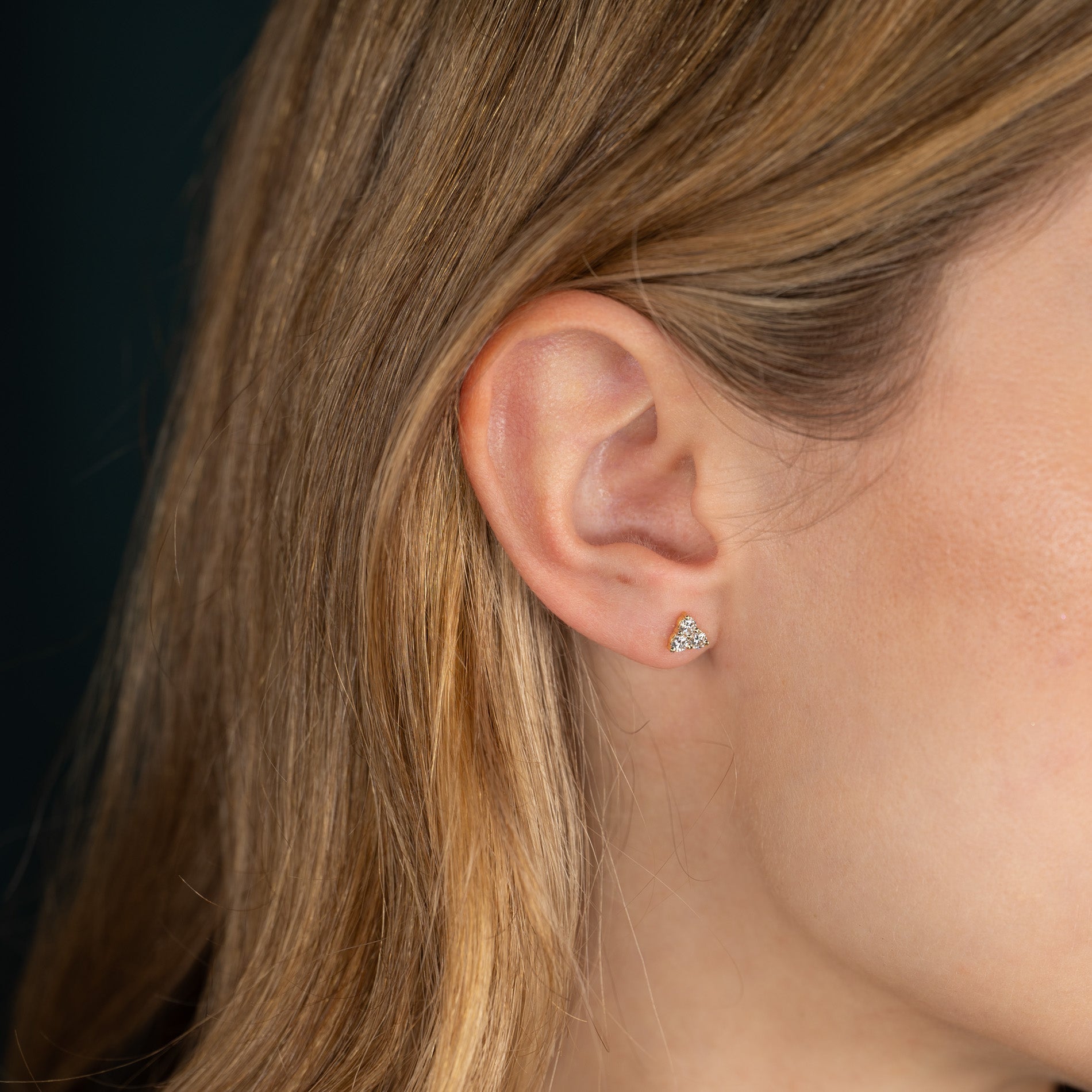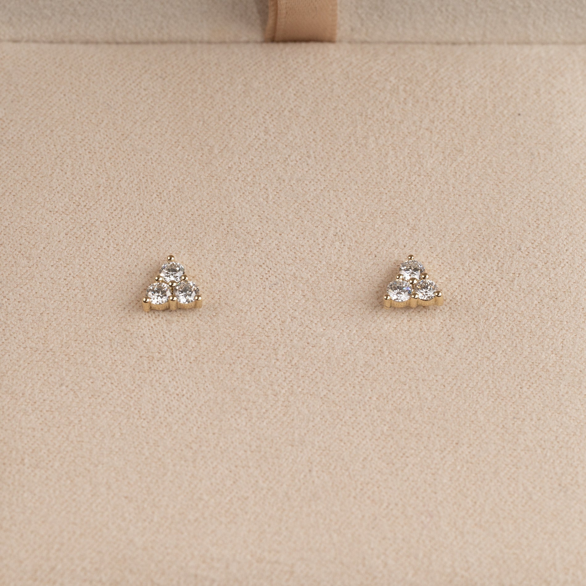A pair of stud earrings, each set with three brilliant-cut lab-grown diamonds arranged in a triangle. These earrings are simple and elegant, perfect for both everyday wear and special occasions.