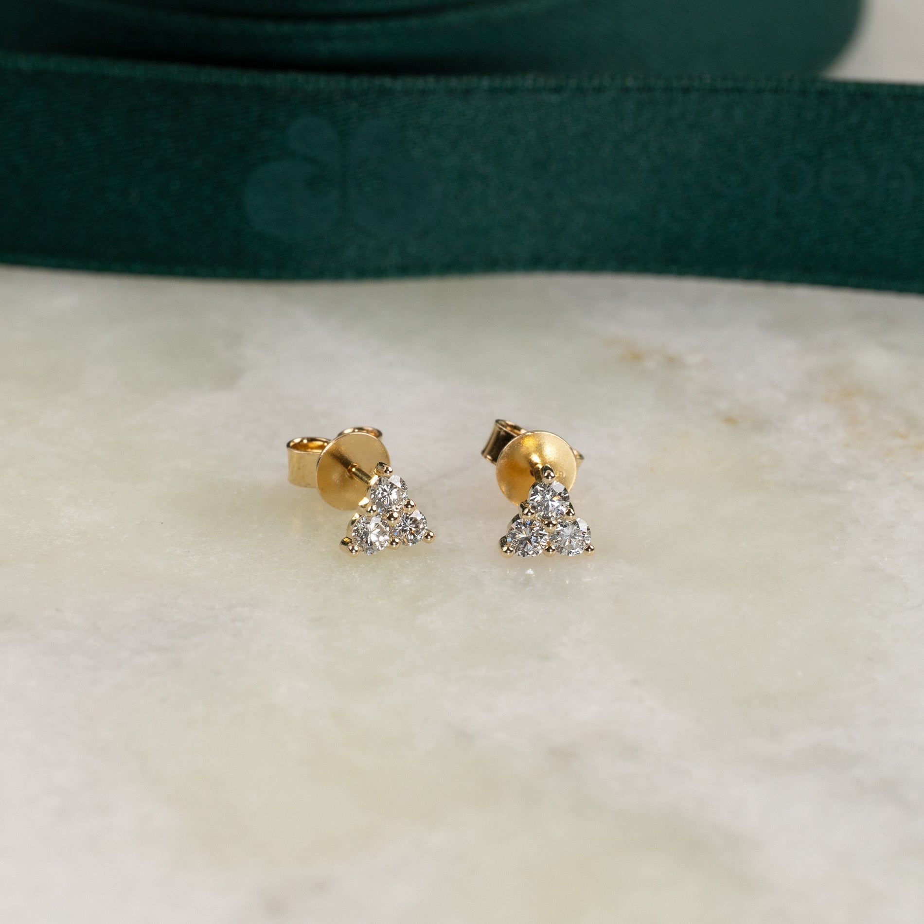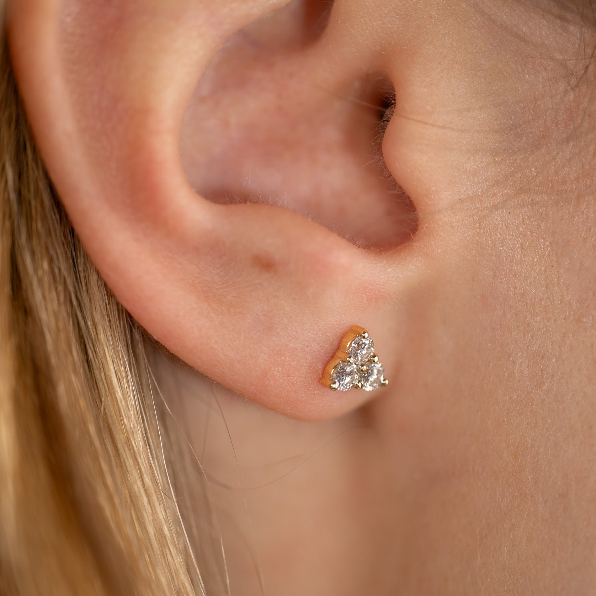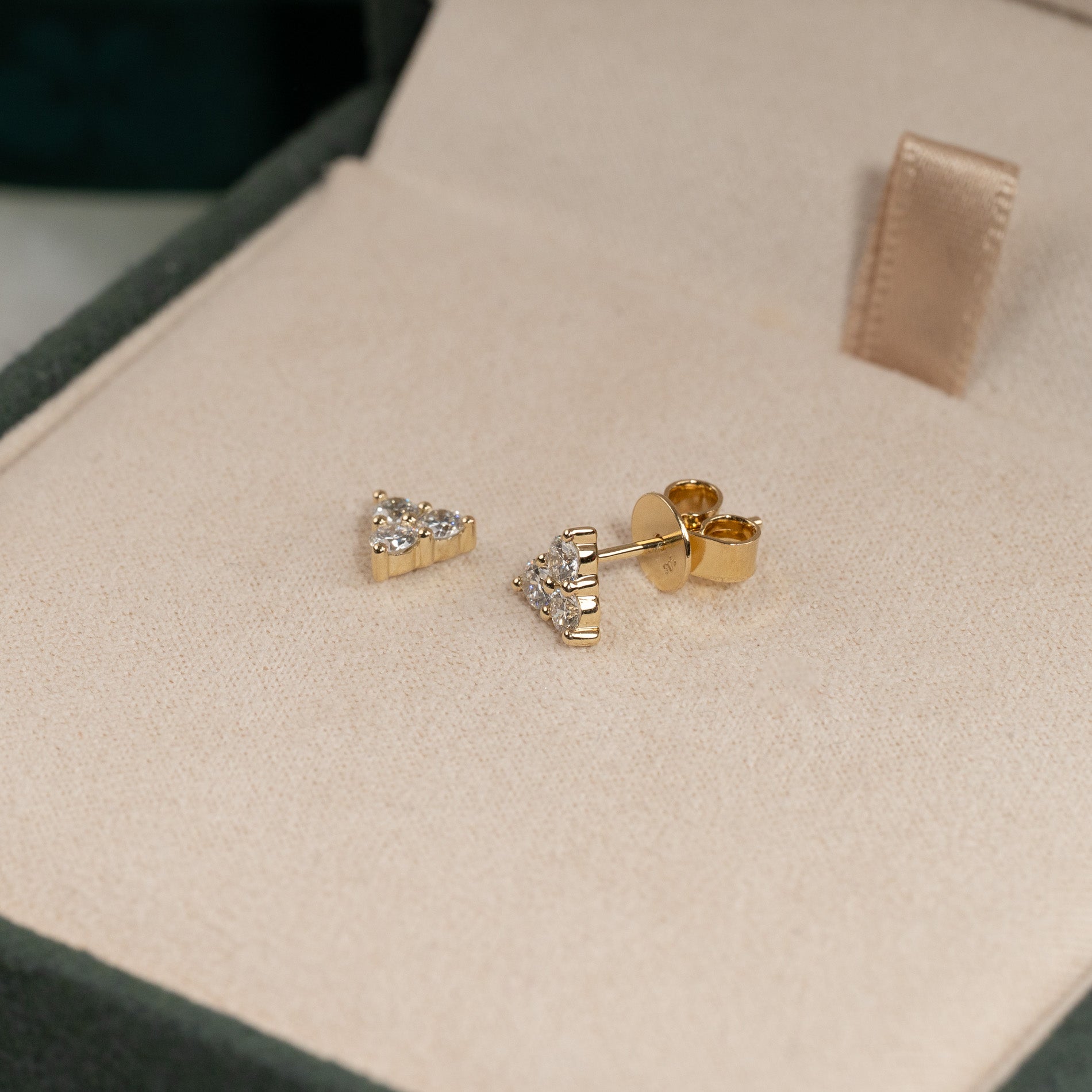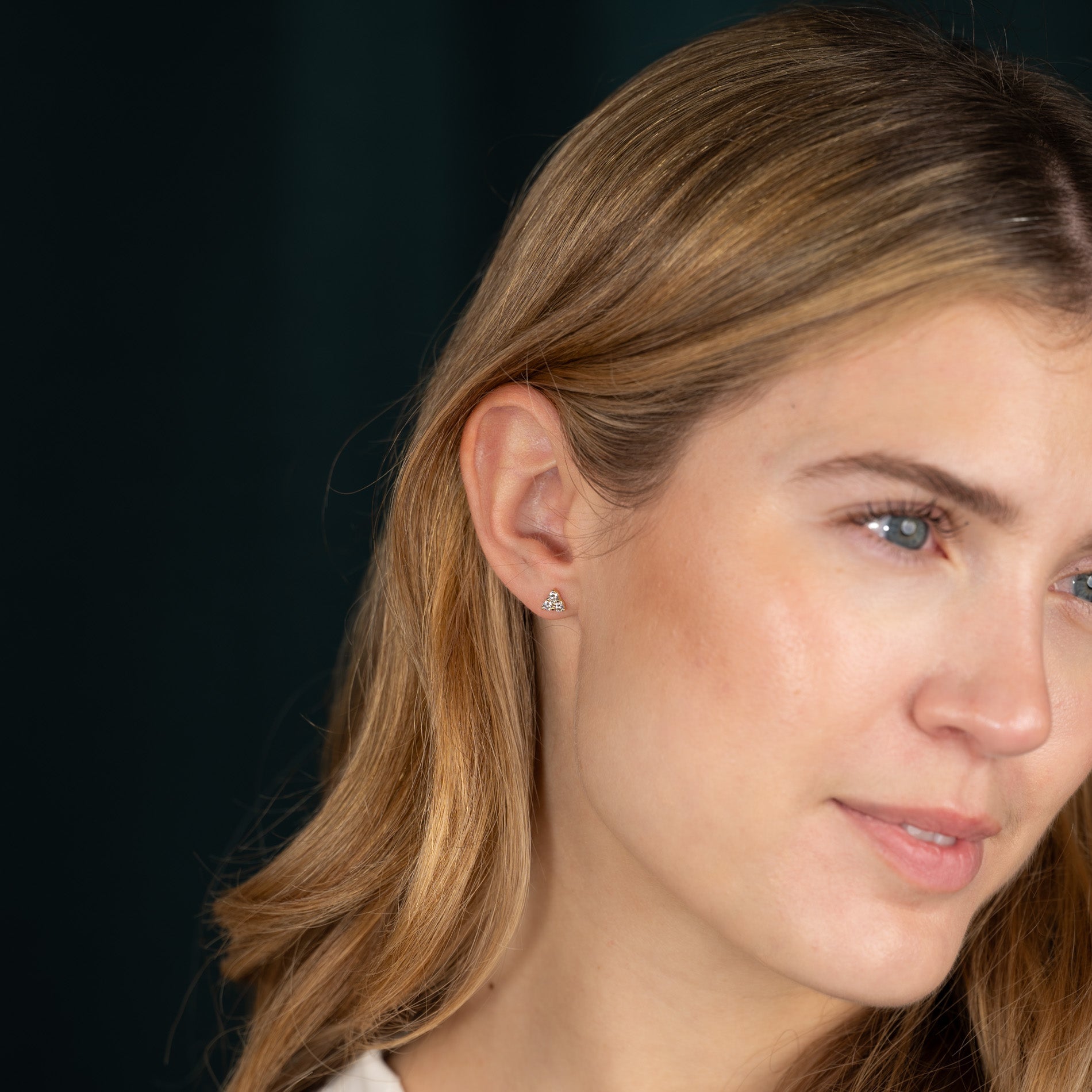 A pair of stud earrings, each set with three brilliant-cut lab-grown diamonds arranged in a triangle. These earrings are simple and elegant, perfect for both everyday wear and special occasions.
