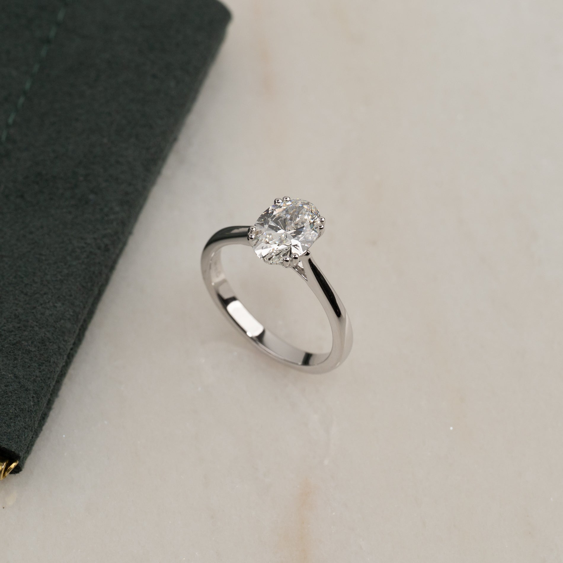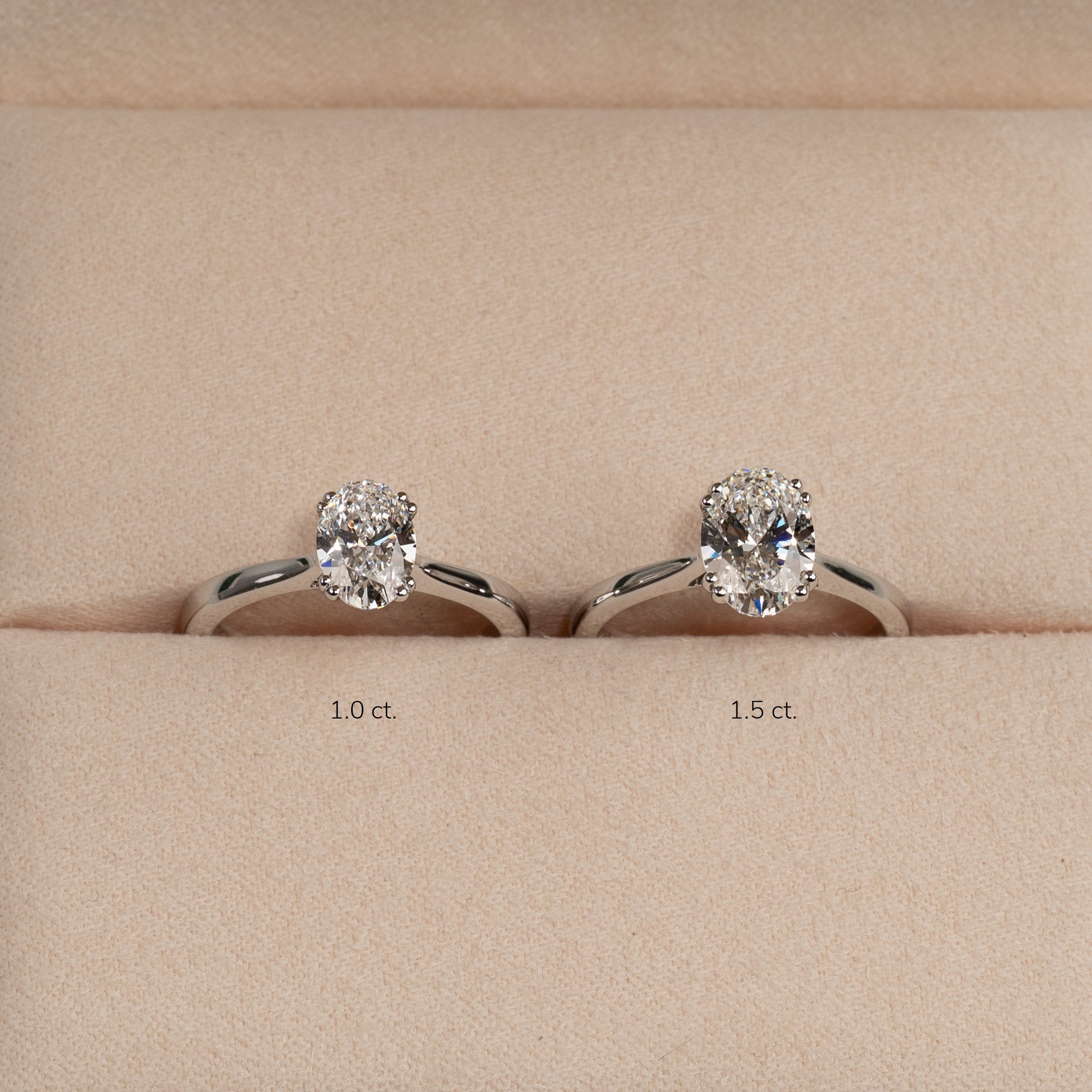 Oval-cut 1.5 ct lab-grown diamond in tulip setting in 14 kt white gold