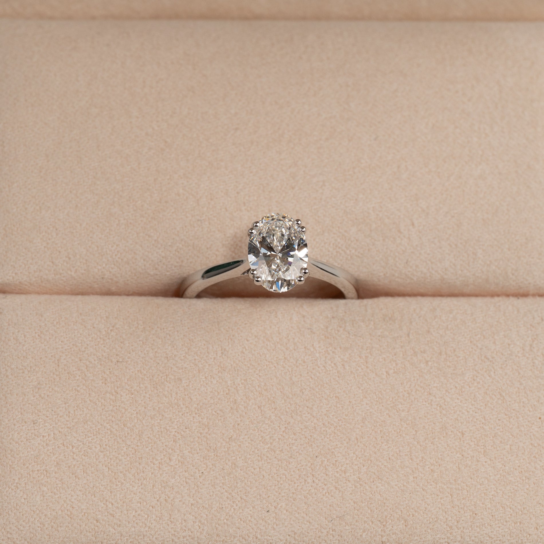 Ring in 14 karat solid white gold with a 1.5 ct oval-cut lab-grown diamond. The stone is beautifully set in a tulip setting that complements the elegant stone. As an extra detail, the prongs are double-ended. The ring is a perfect cocktail ring, the perfect gift for someone you love and care about, or as the perfect engagement ring.