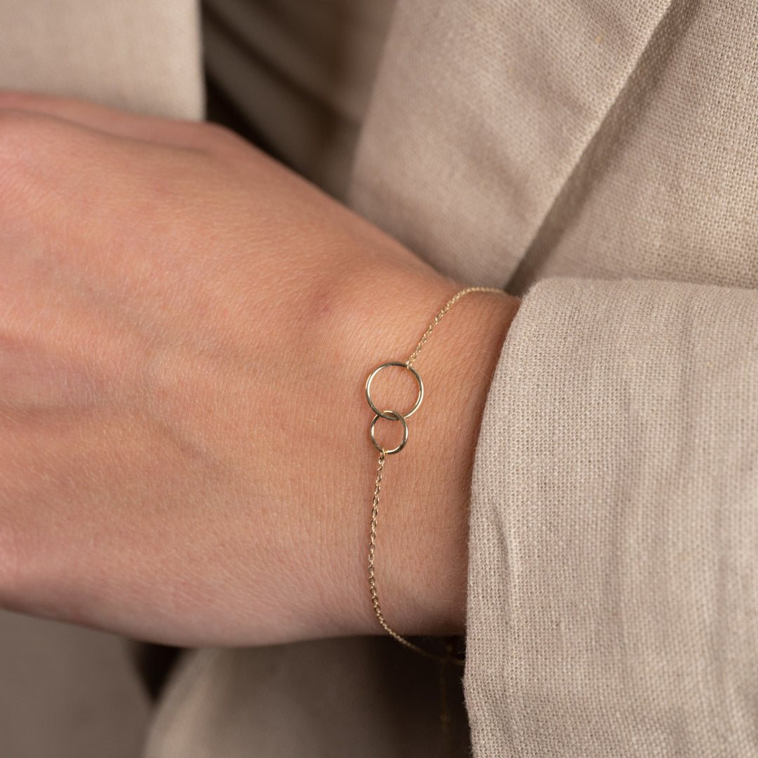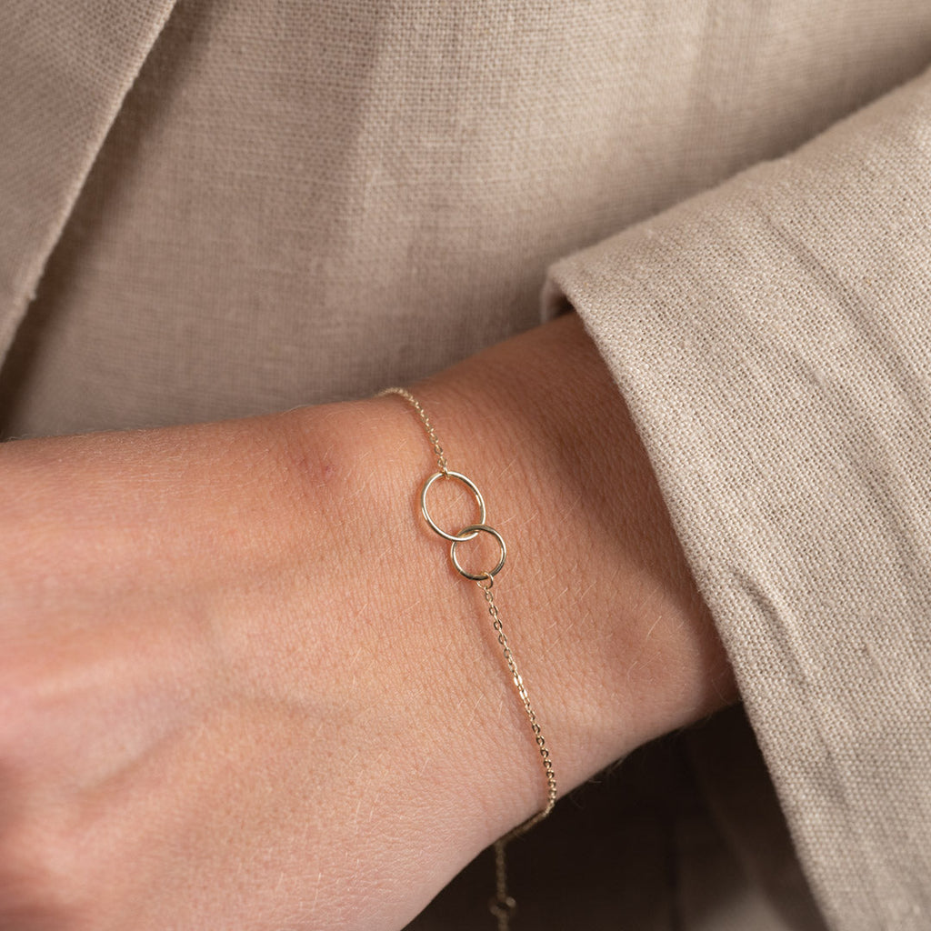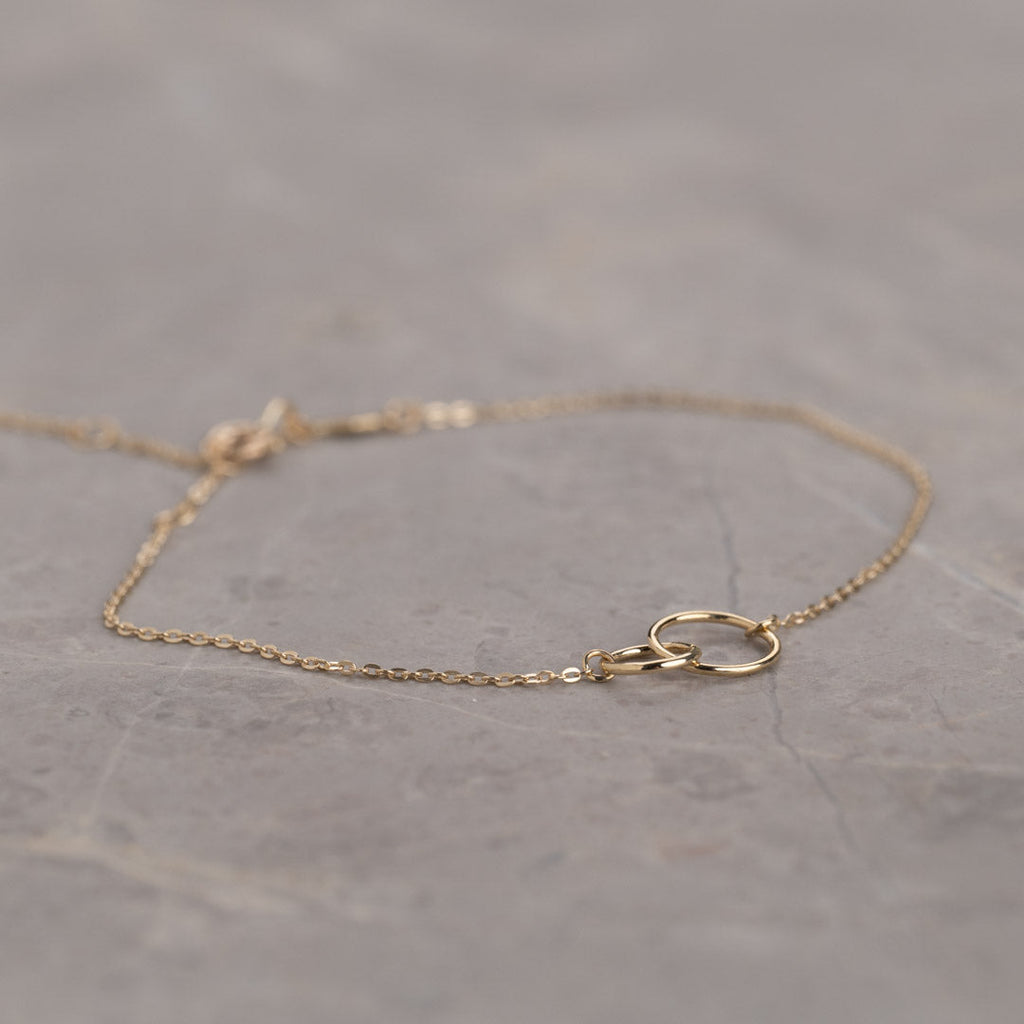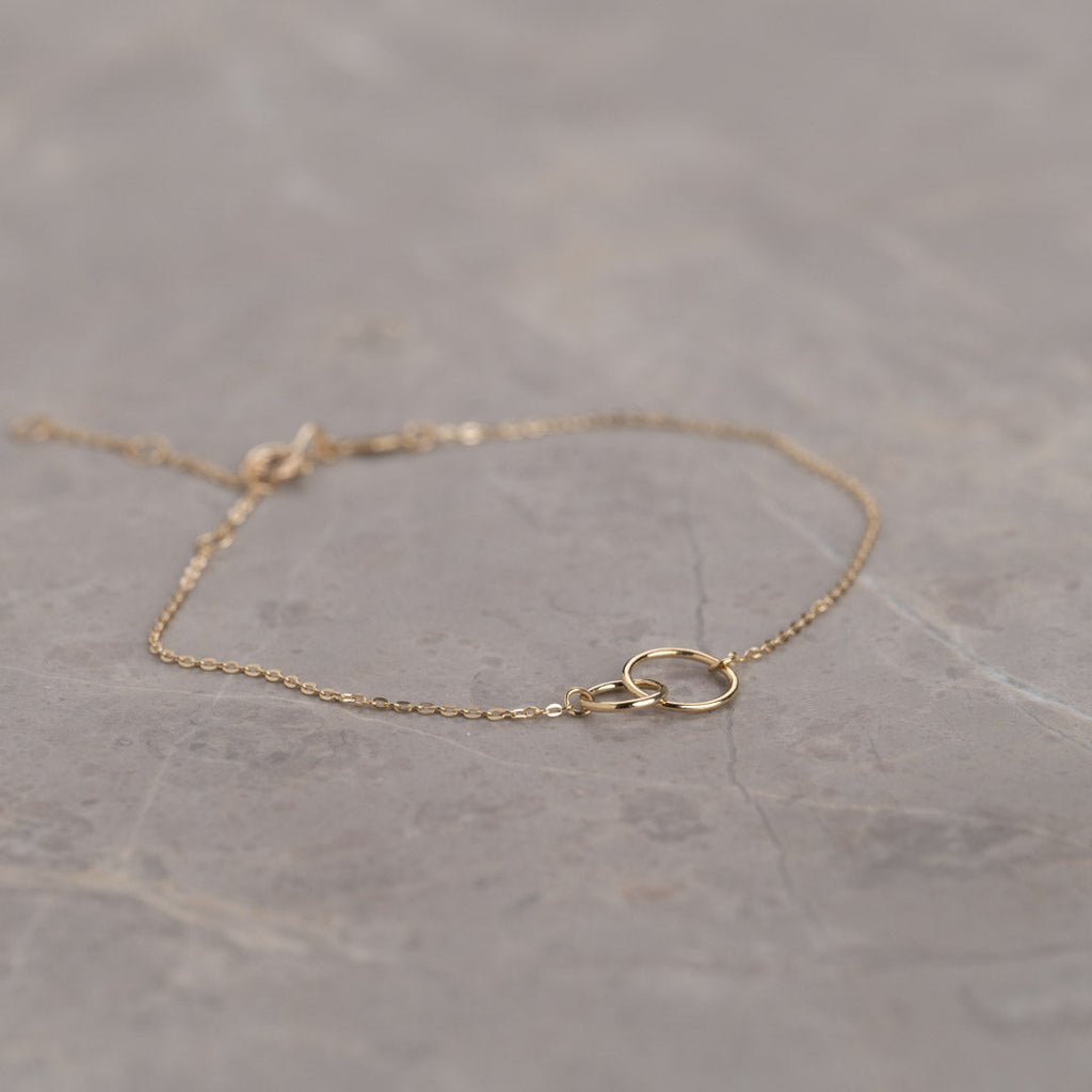 The Una bracelet is made of 100% recycled 9 carat massive gold. The bracelet is made with a classic anchor chain with two hoops which are connecting within each other making a simple and delicate design with a feminine touch.