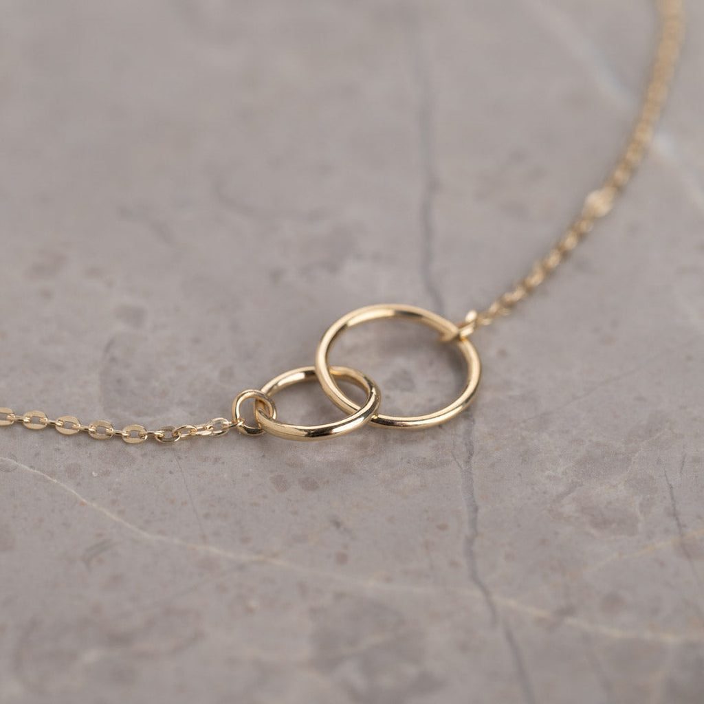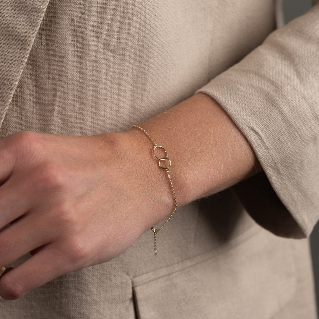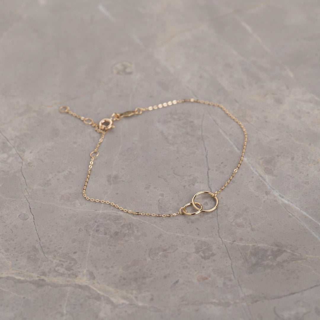 The Una bracelet is made of 100% recycled 9 carat massive gold. The bracelet is made with a classic anchor chain with two hoops which are connecting within each other making a simple and delicate design with a feminine touch.