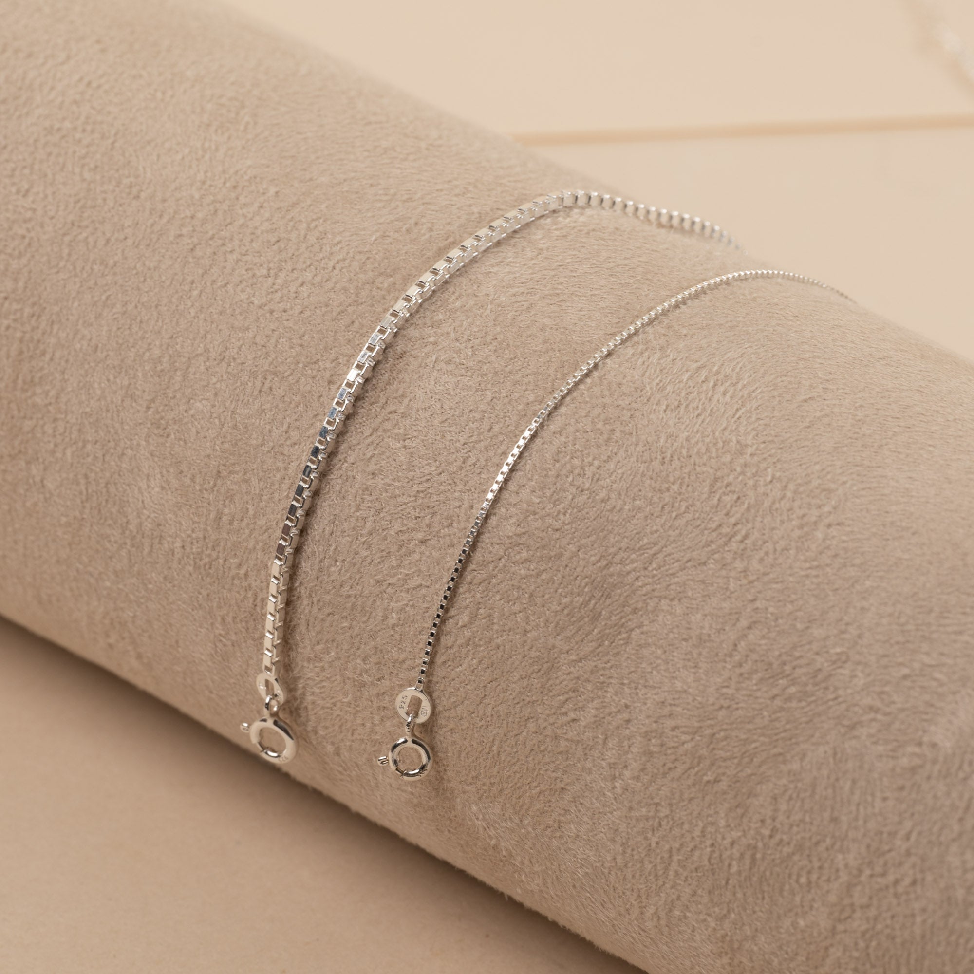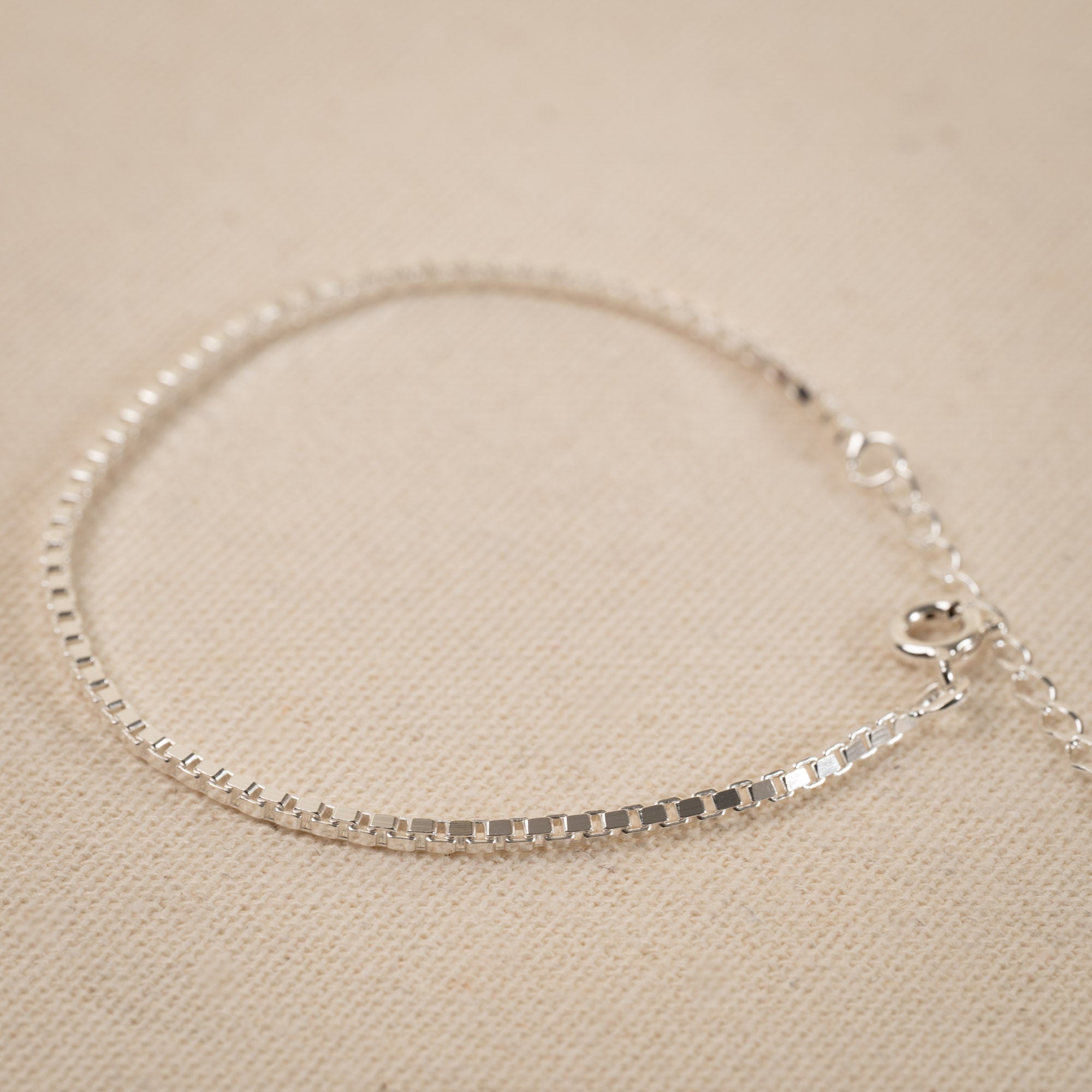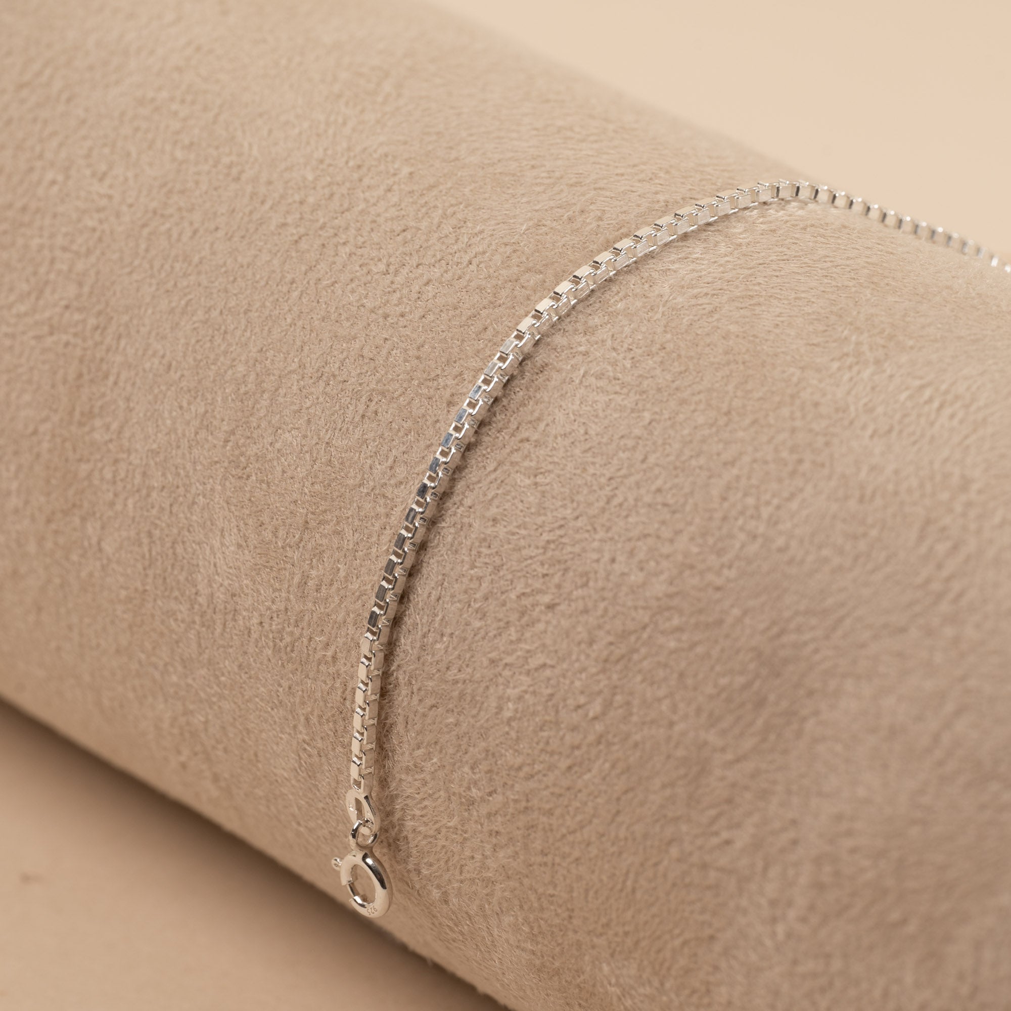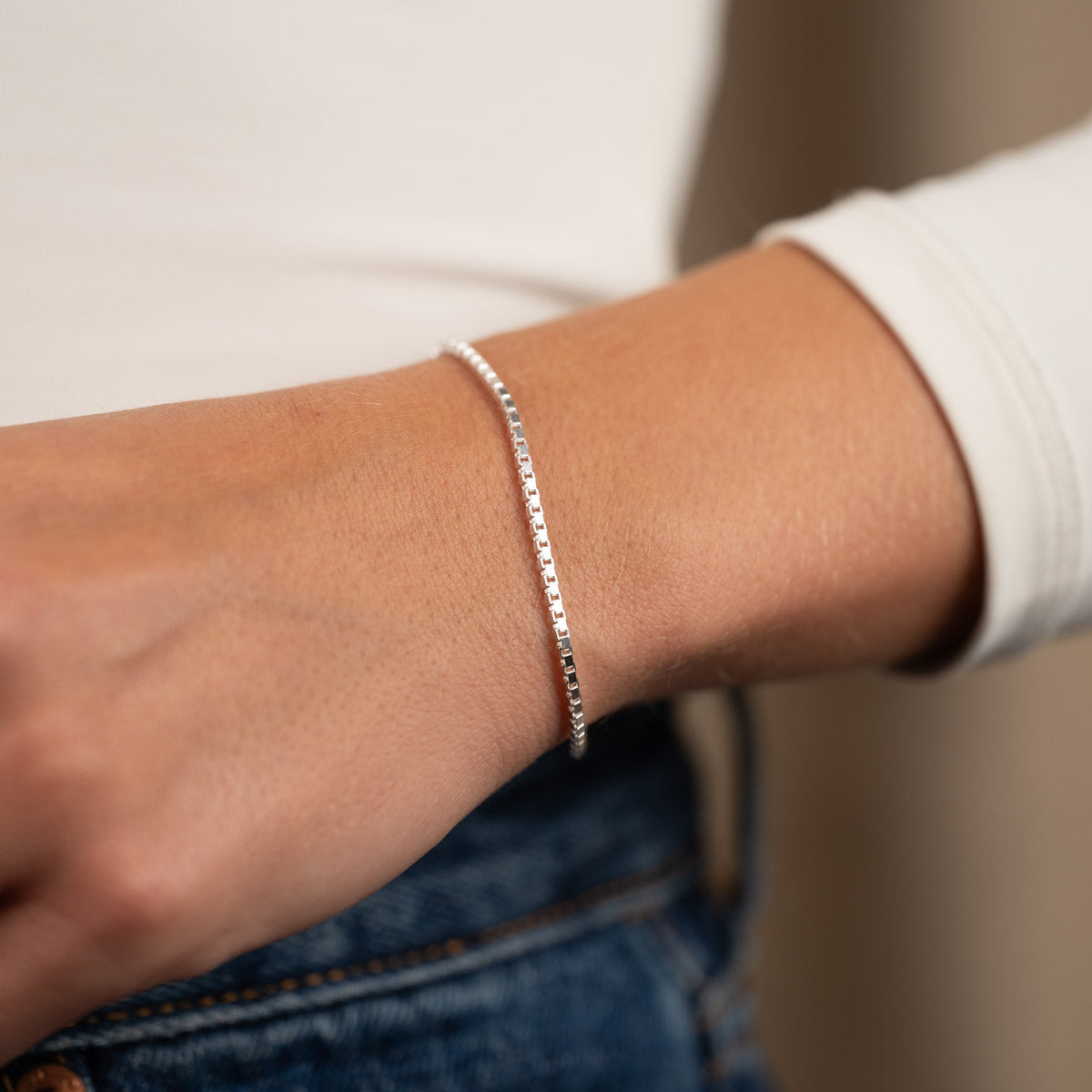 The chain is designed with square joints that creates a dense pattern with flat sides, and reflects the light beautifully. The chain is 1.7mm wide. Do you want a slim Venezia chain, have a look at our Venezia Small Bracelet.