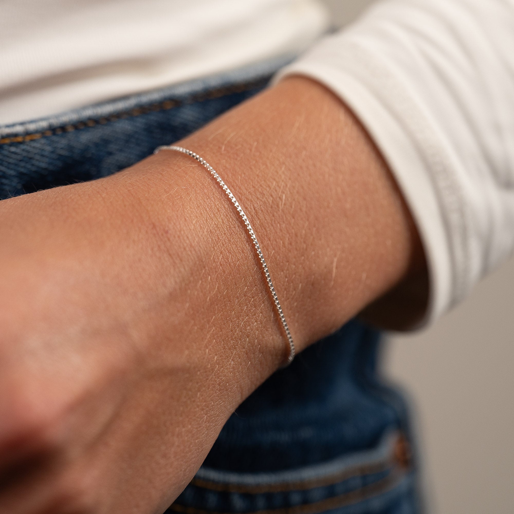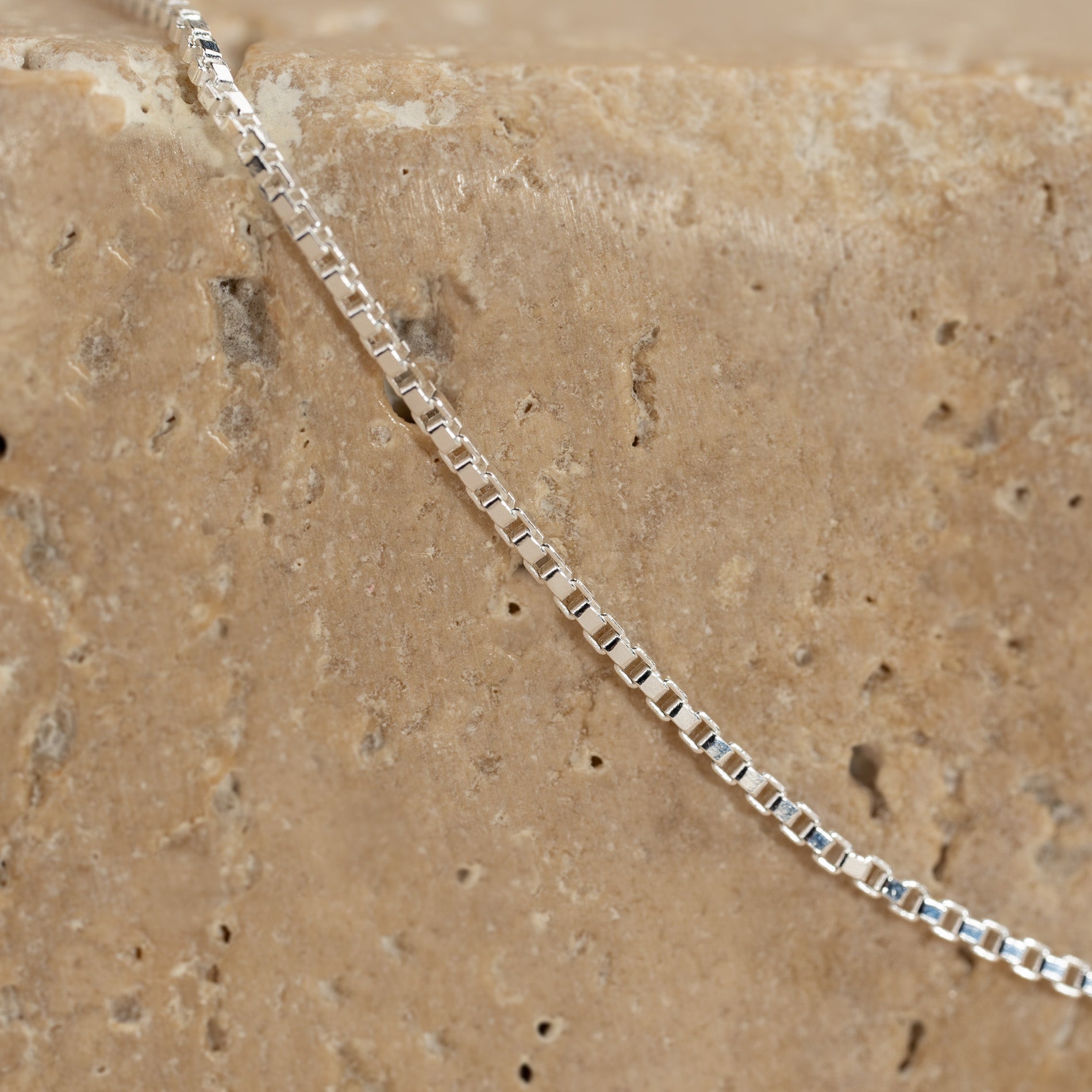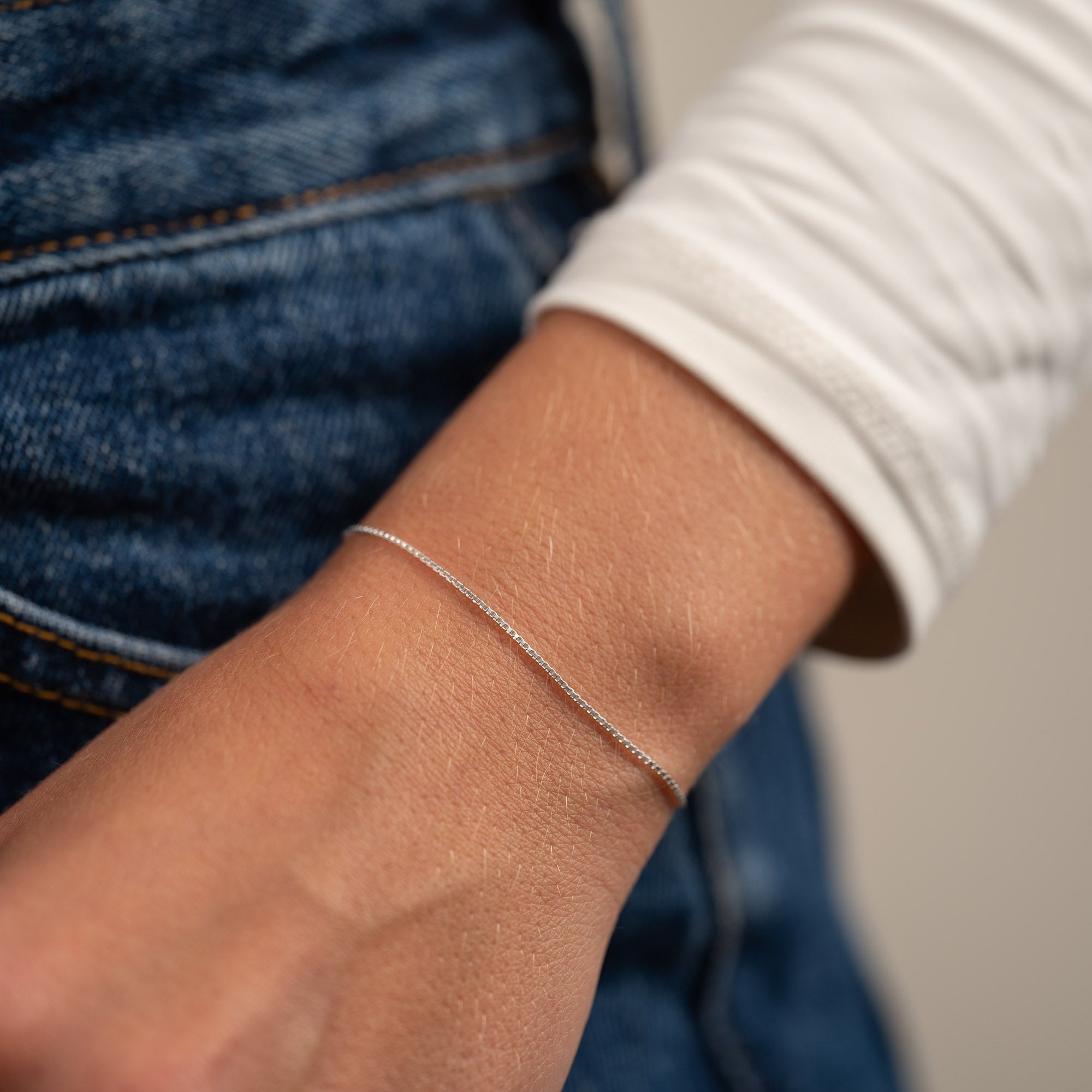 The chain is designed with square joints that creates a dense pattern with flat sides, and reflects the light beautifully. The chain is 0.8mm wide. Do you want a bigger sized Venezia chain, have a look at our Venezia Large Bracelet.