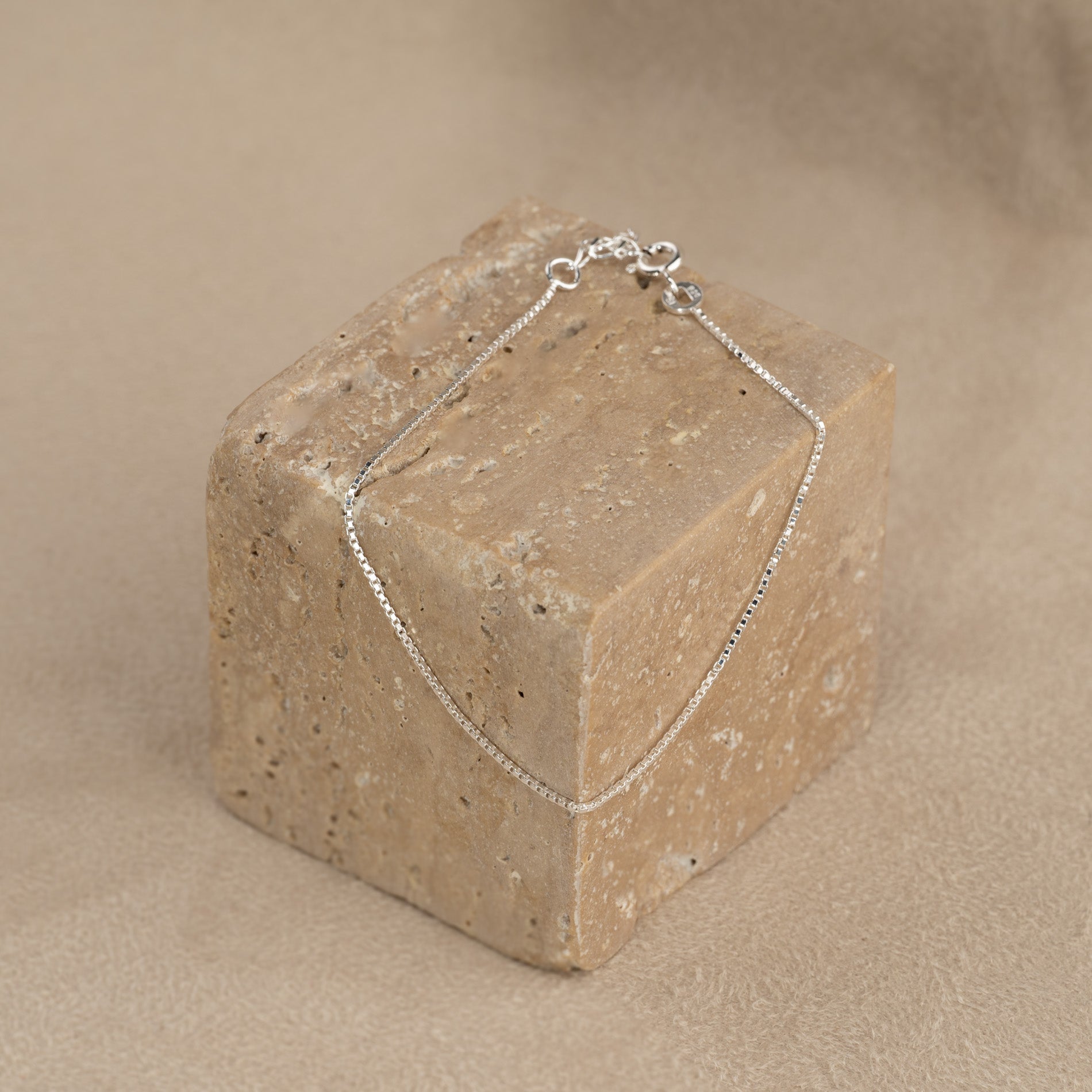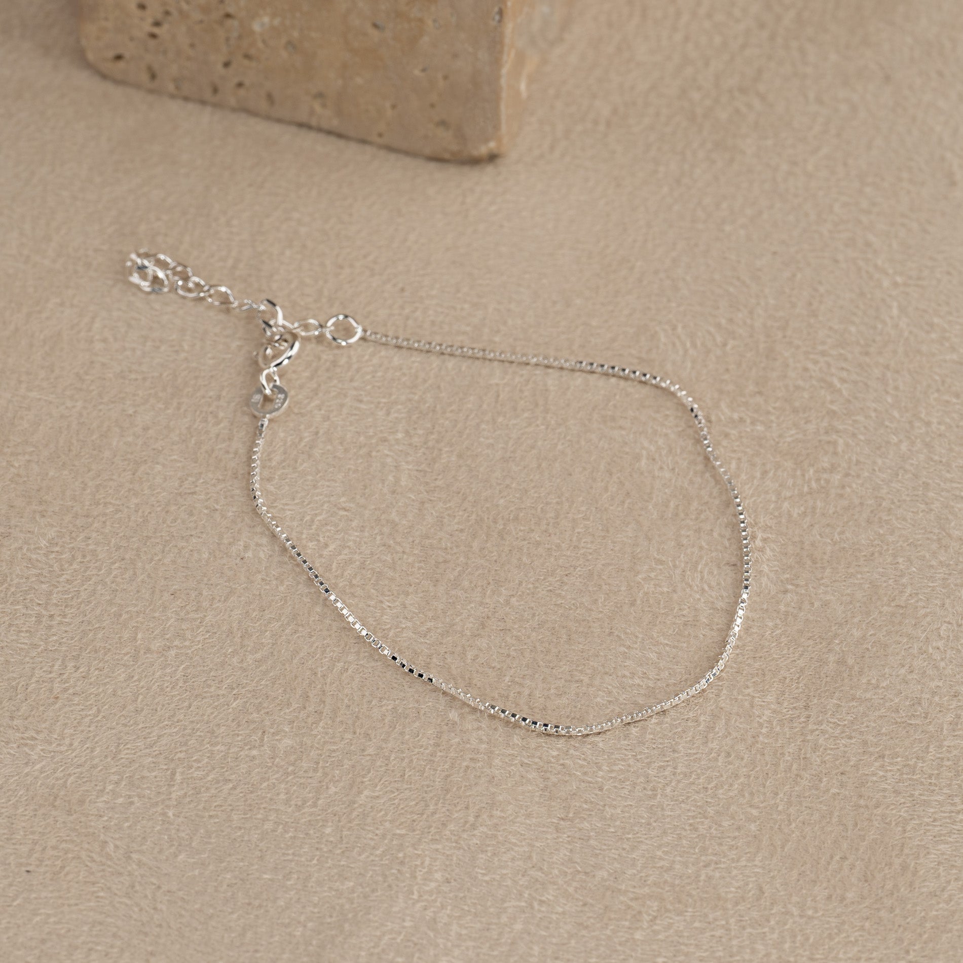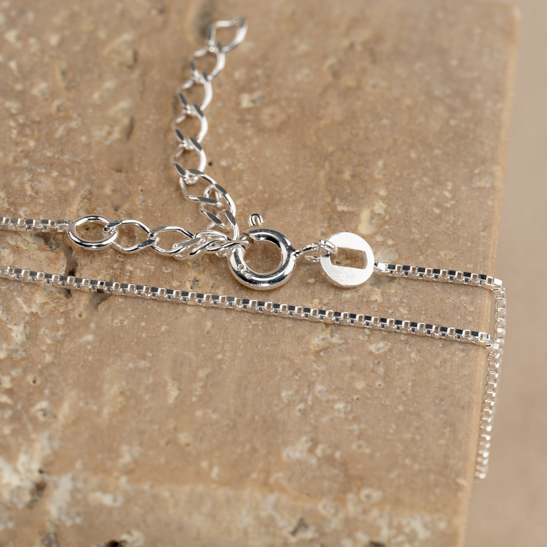 The chain is designed with square joints that creates a dense pattern with flat sides, and reflects the light beautifully. The chain is 0.8mm wide. Do you want a bigger sized Venezia chain, have a look at our Venezia Large Bracelet.