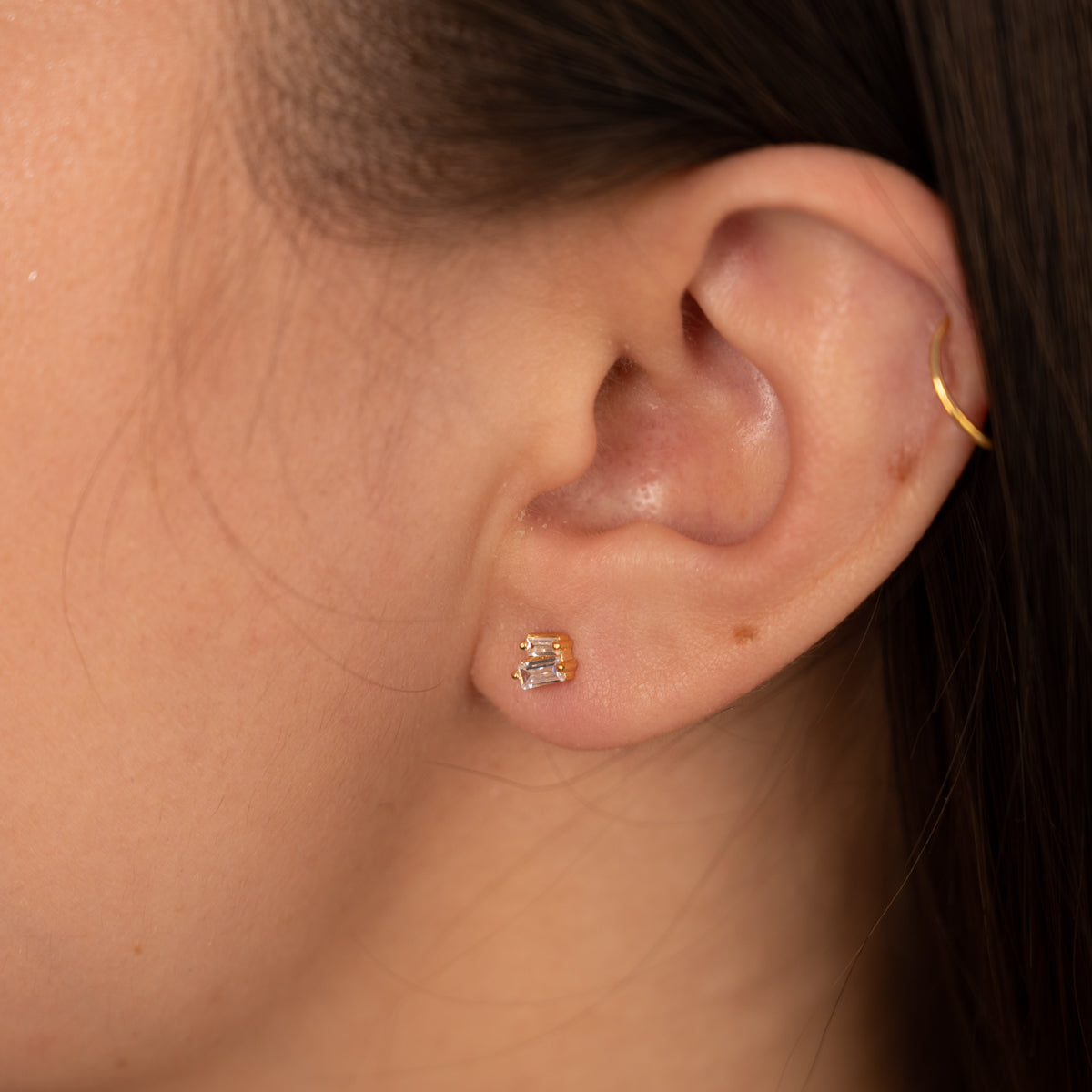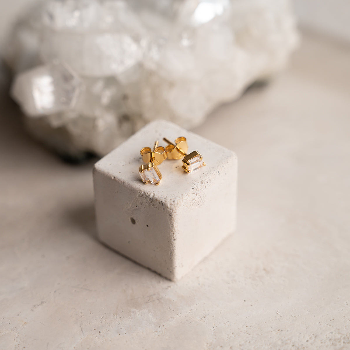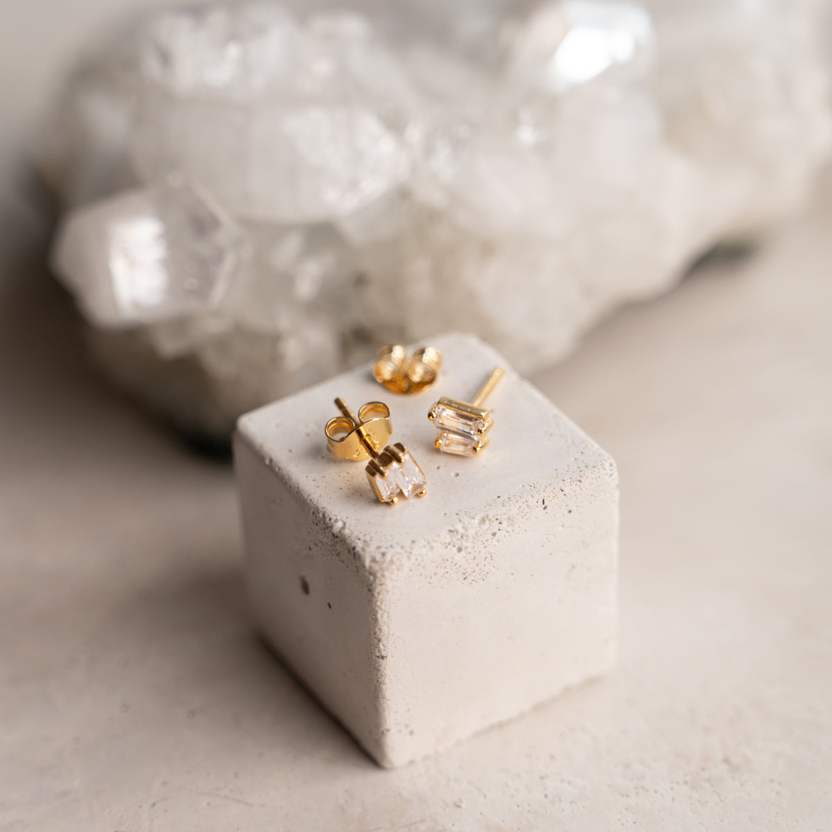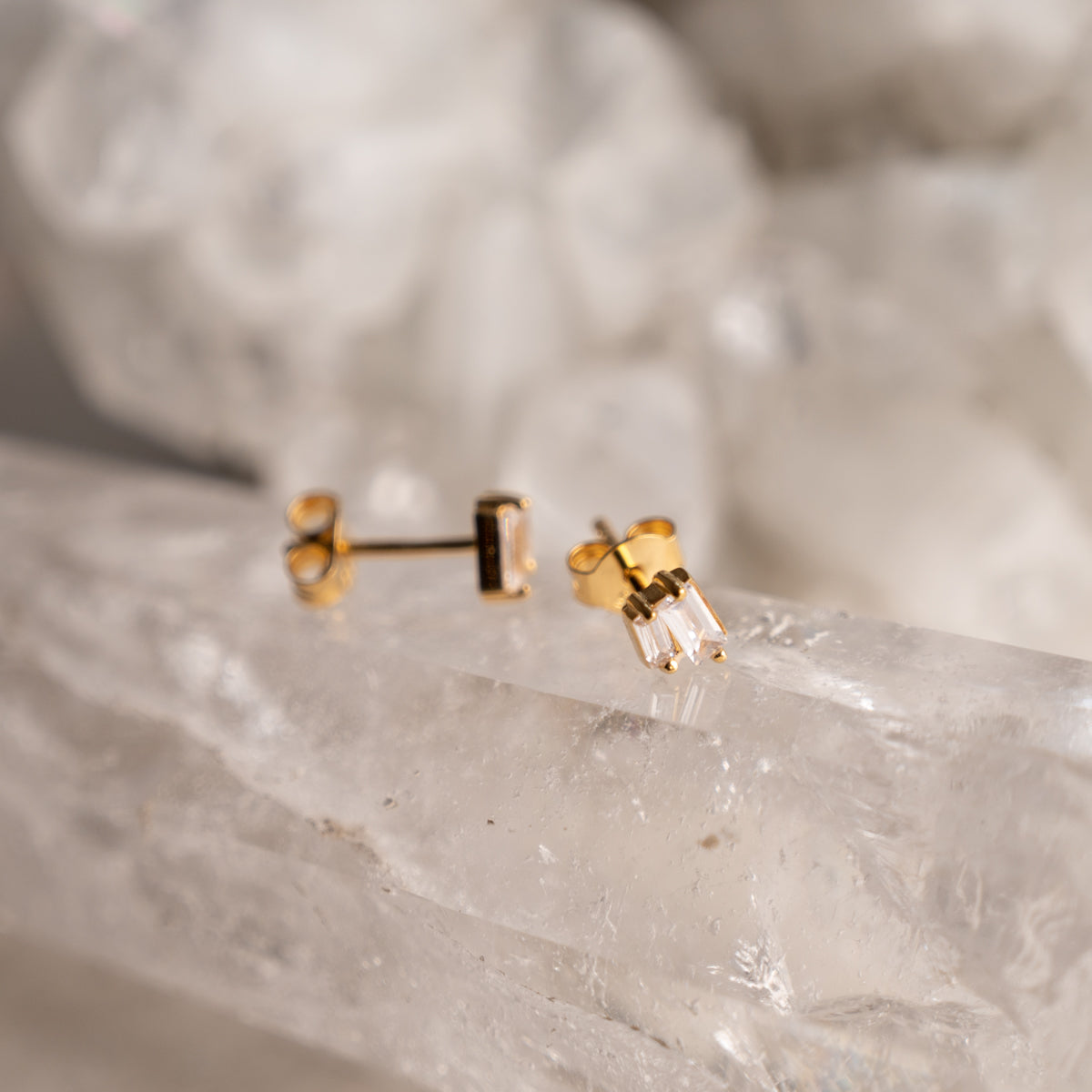 Our Vivian earrings are made 100% recycled 18-carat gold-plated sterling silver and are studded with faceted zircons in different sizes. The unstructured design of the earrings makes them unpretentious, while the fine baguette faceted (elongated square) stones also create elegancy. The earrings can be worn on their own, or in combination with other earrings.